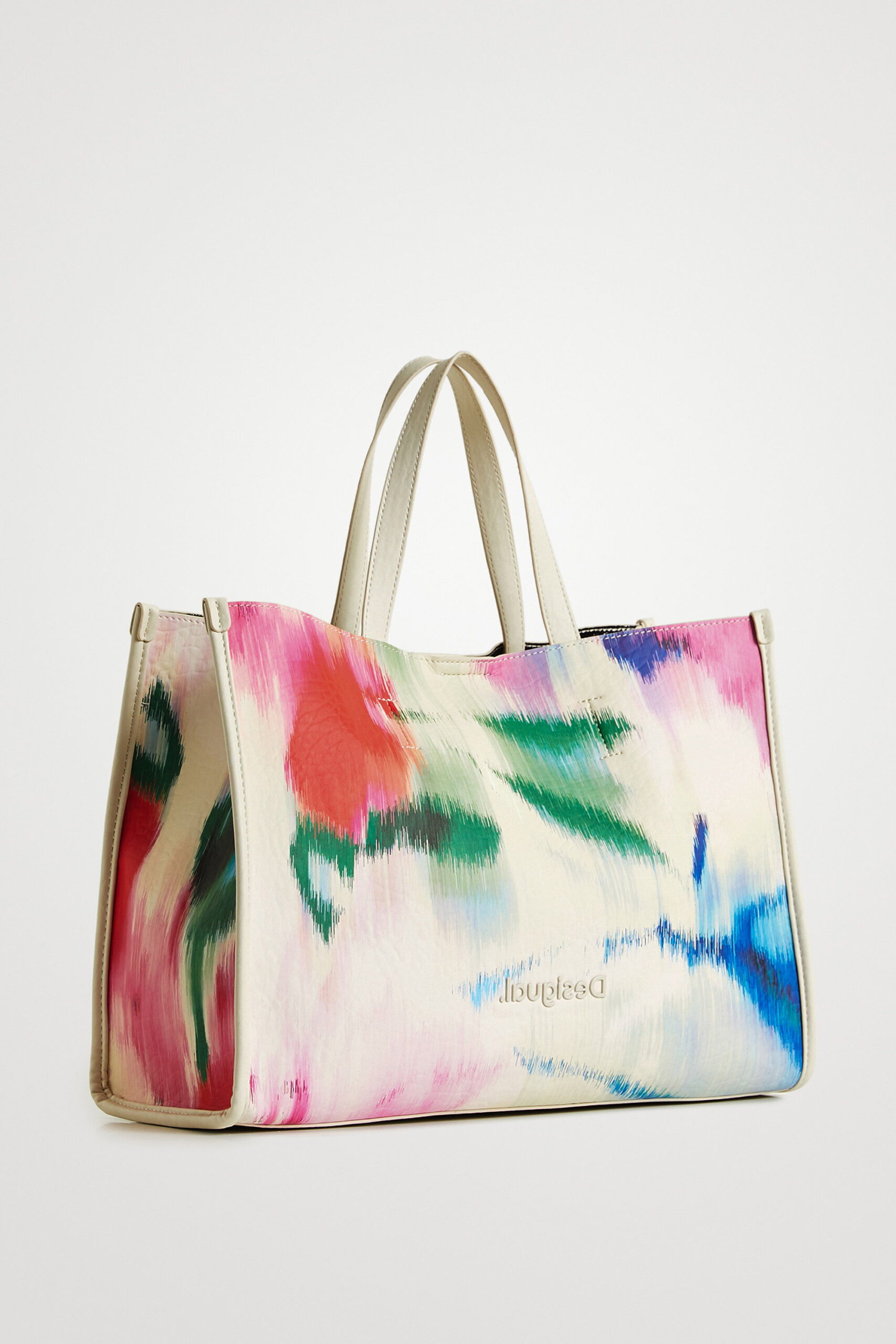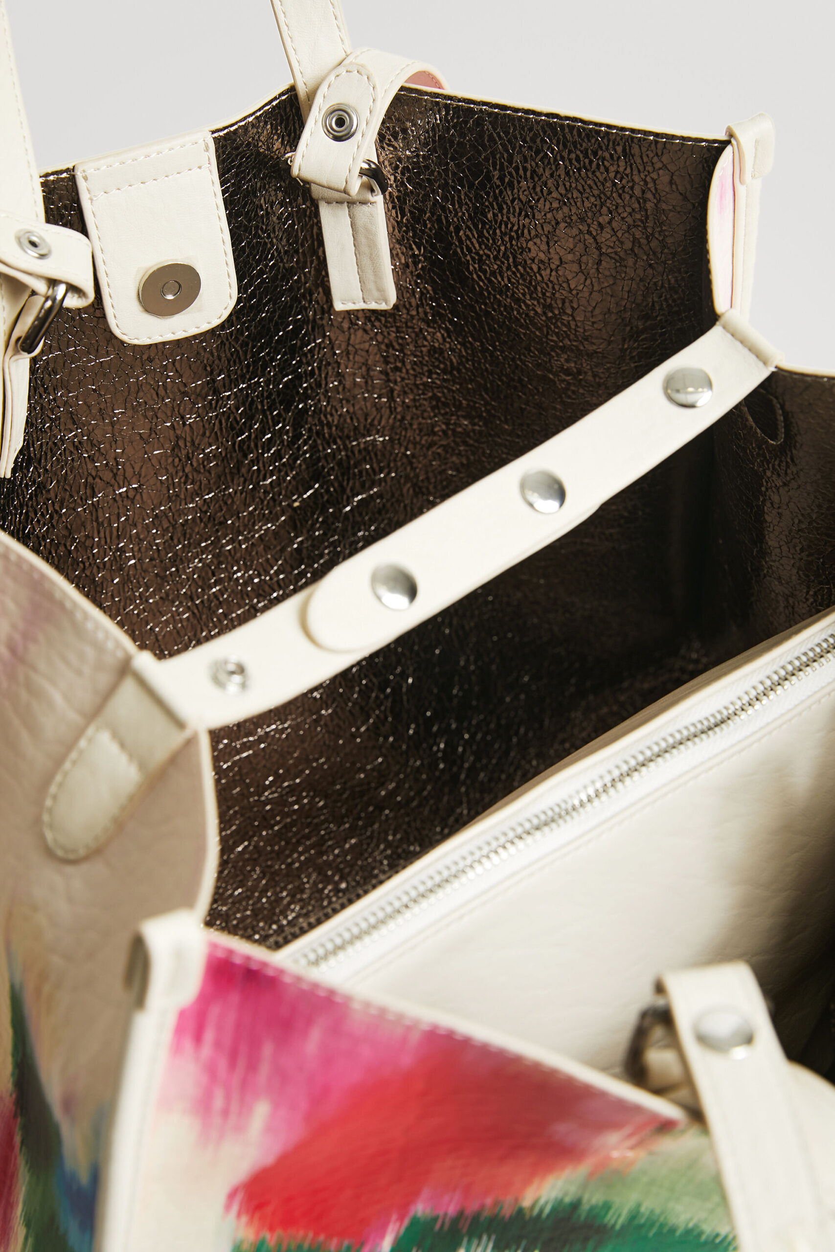 This bag features a unique print with a digital tie-dye effect on a white background. The strap and the bottom part are made from faux leather with an embossed logo. Silver interior, includes a toiletry bag and multiple straps so it can be worn in many ways.
