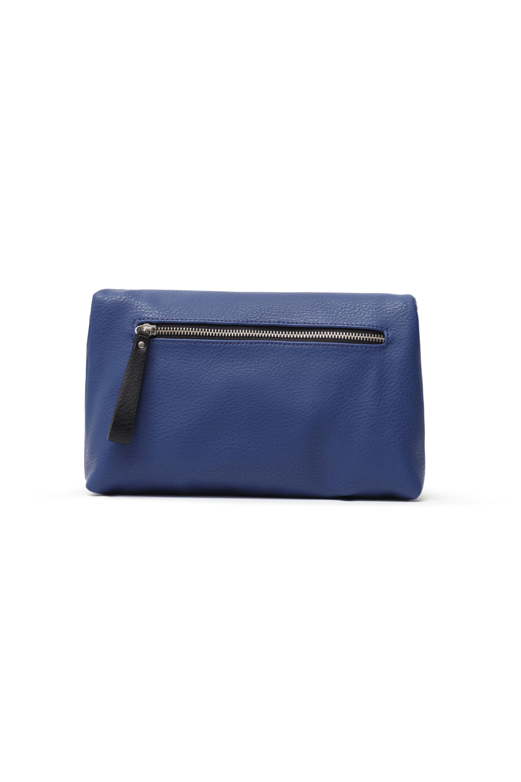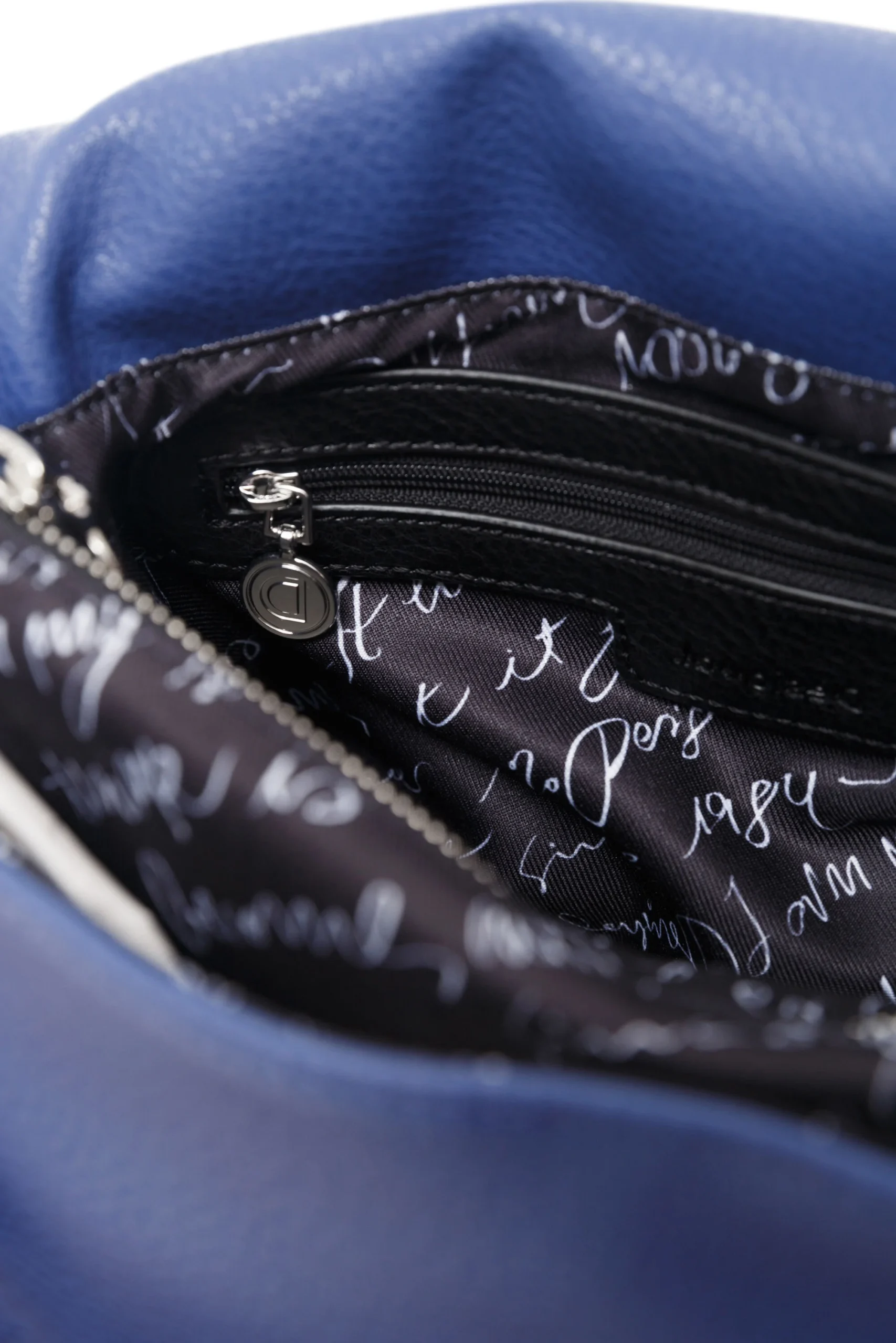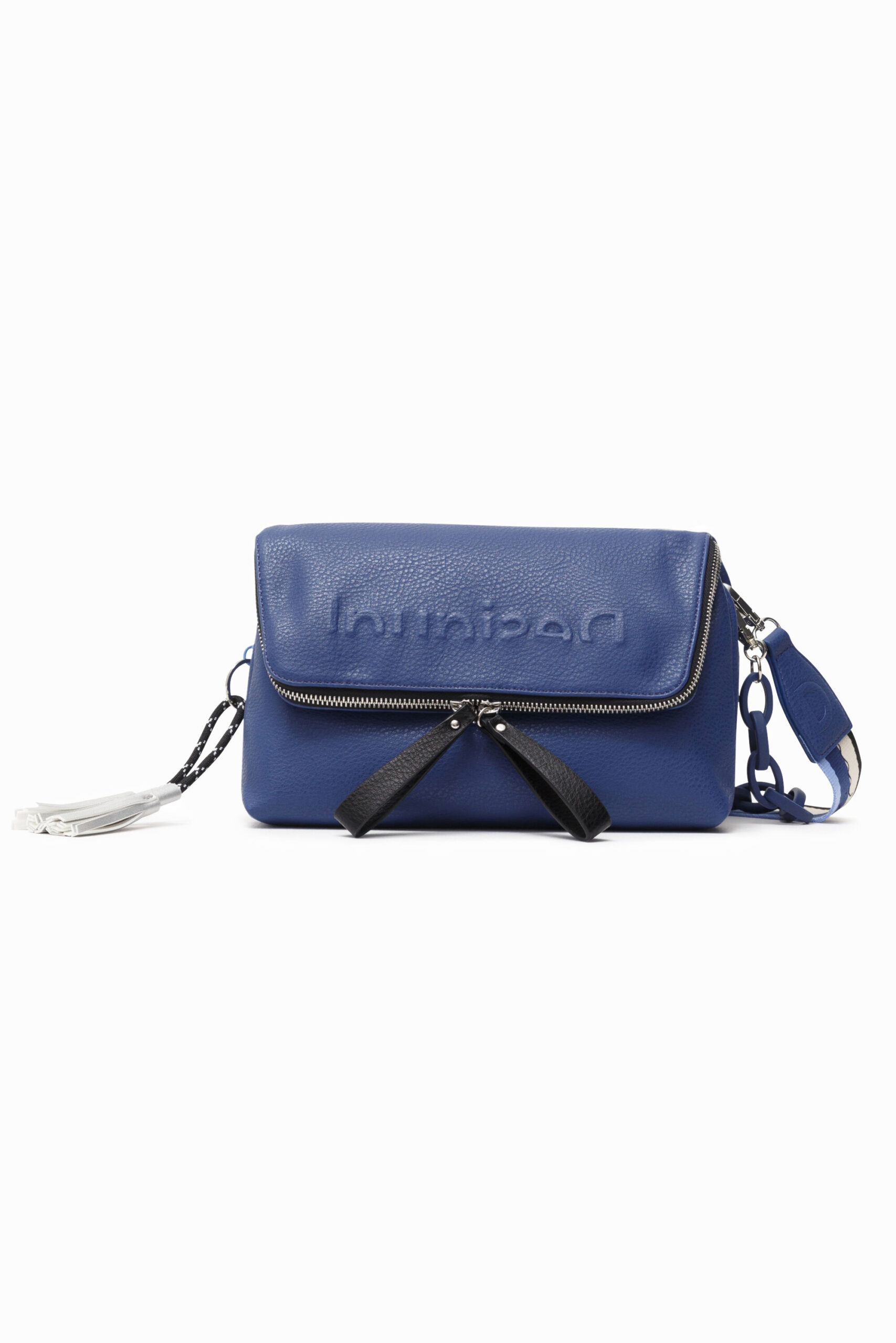 This crossbody bag in leather effect fabric with embossed logo includes a large inner compartment divided into three spaces, two interchangeable straps and flap with pocket and zipper.