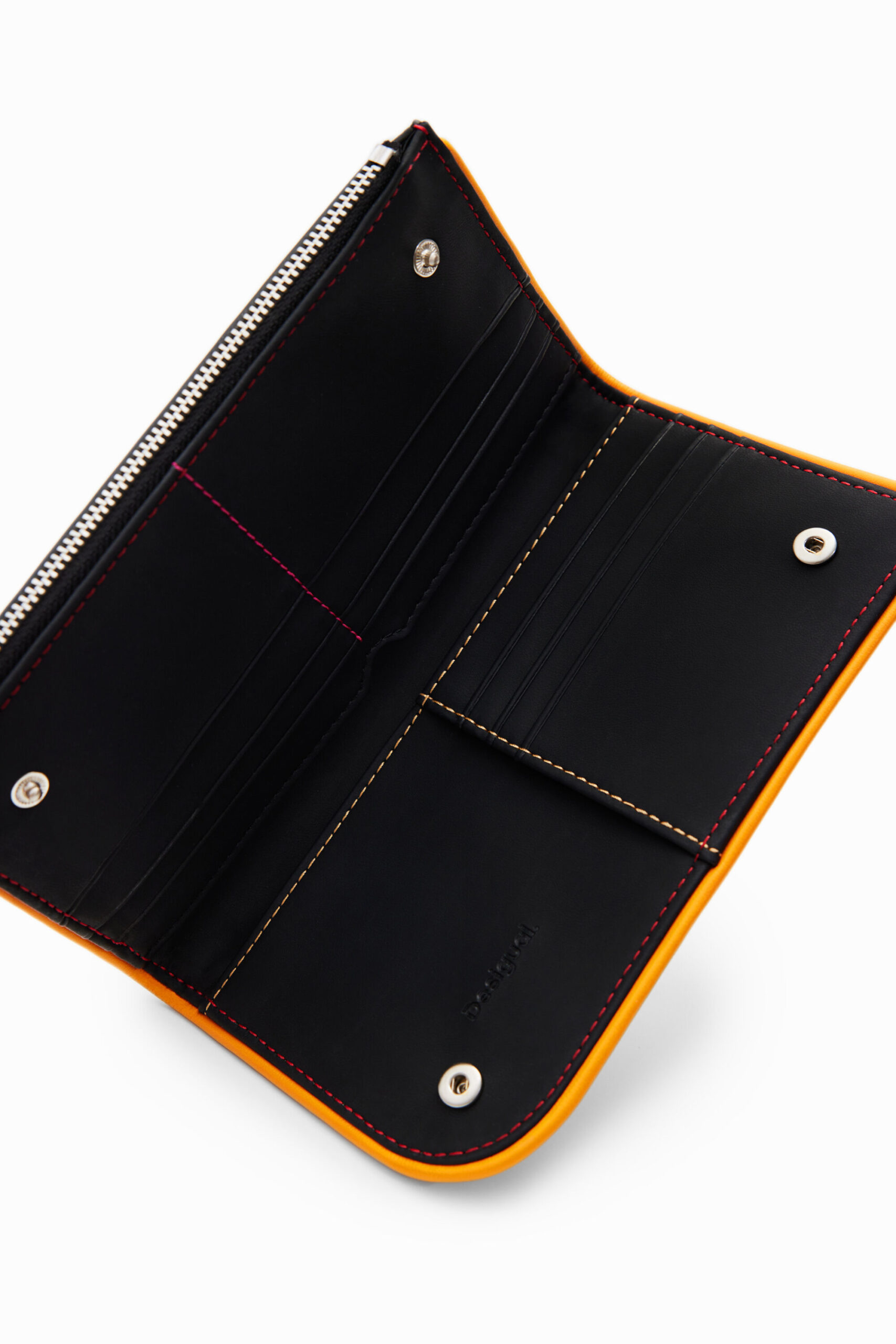 A large rectangular wallet in leather-effect fabric with contrasting details and several compartments and pockets.
