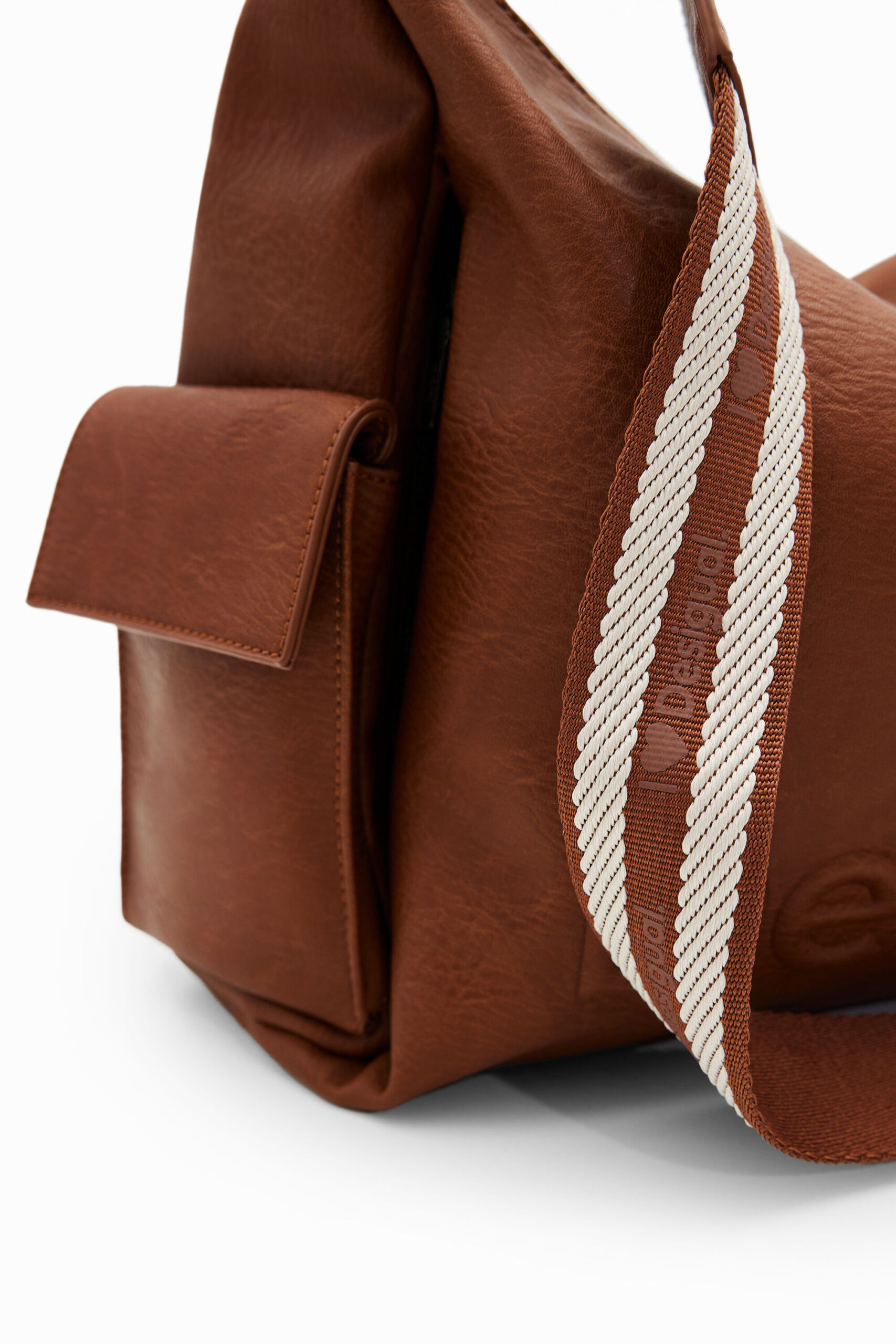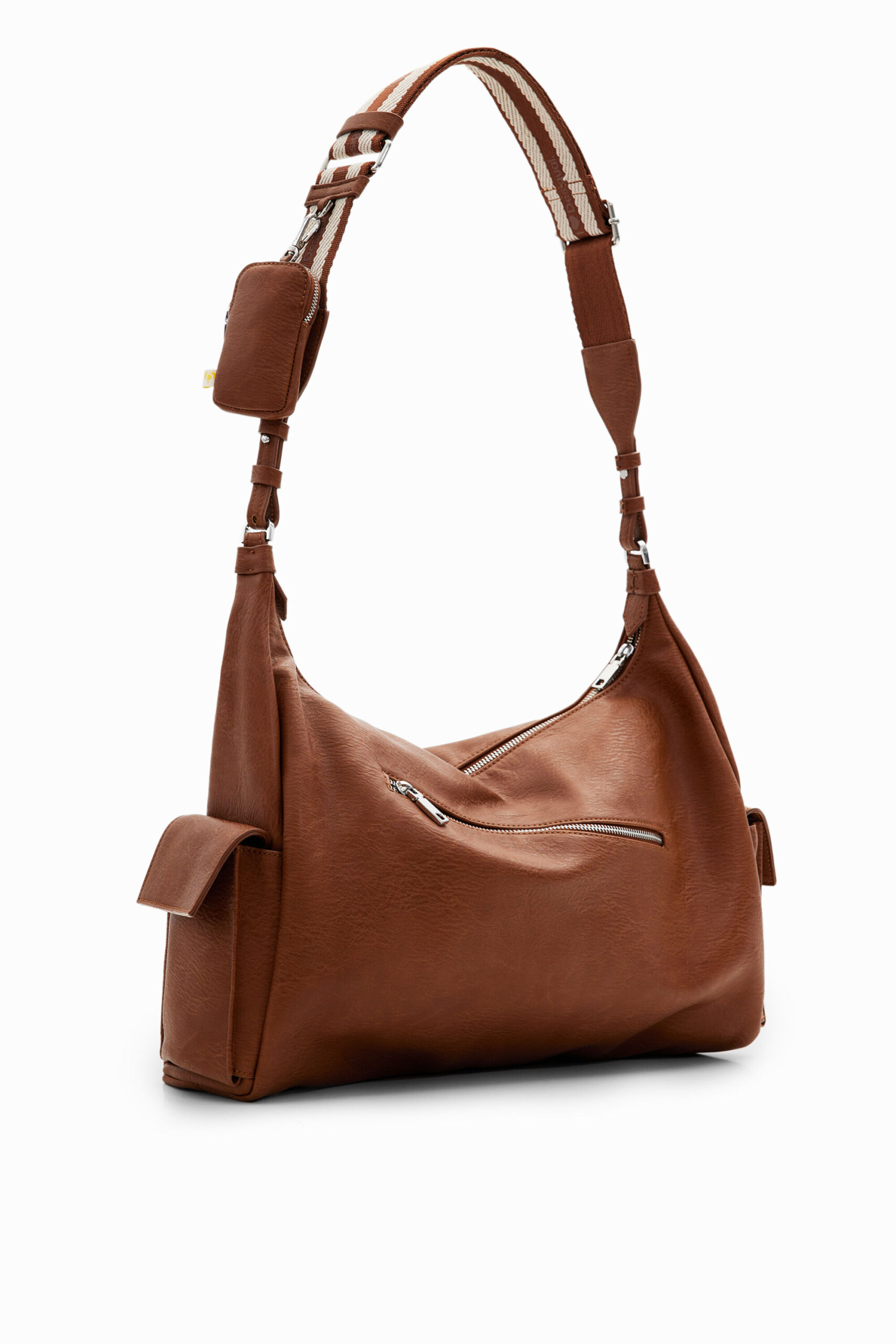 - Two detachable straps: a short leather-effect shoulder strap and a long, adjustable, woven crossbody strap