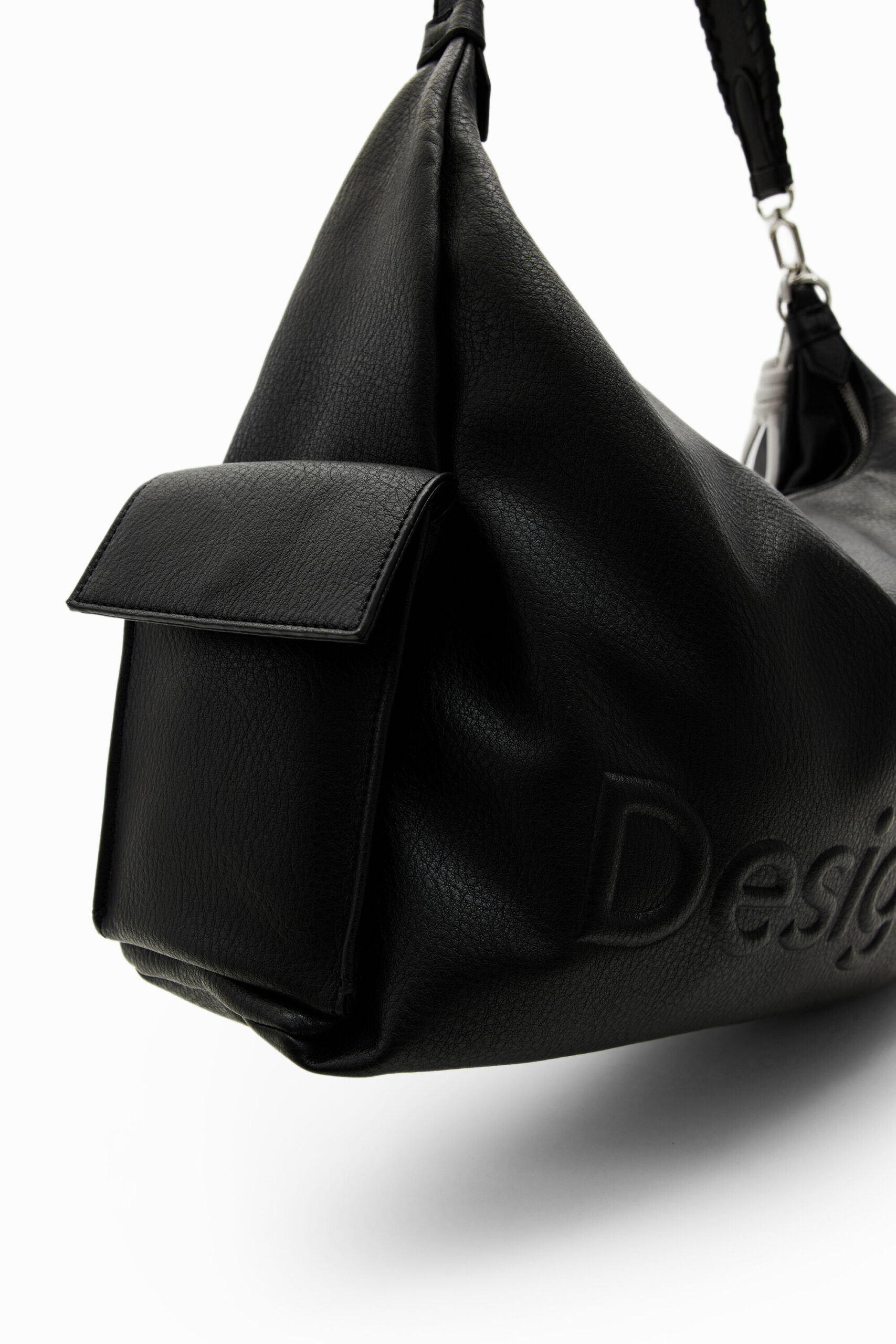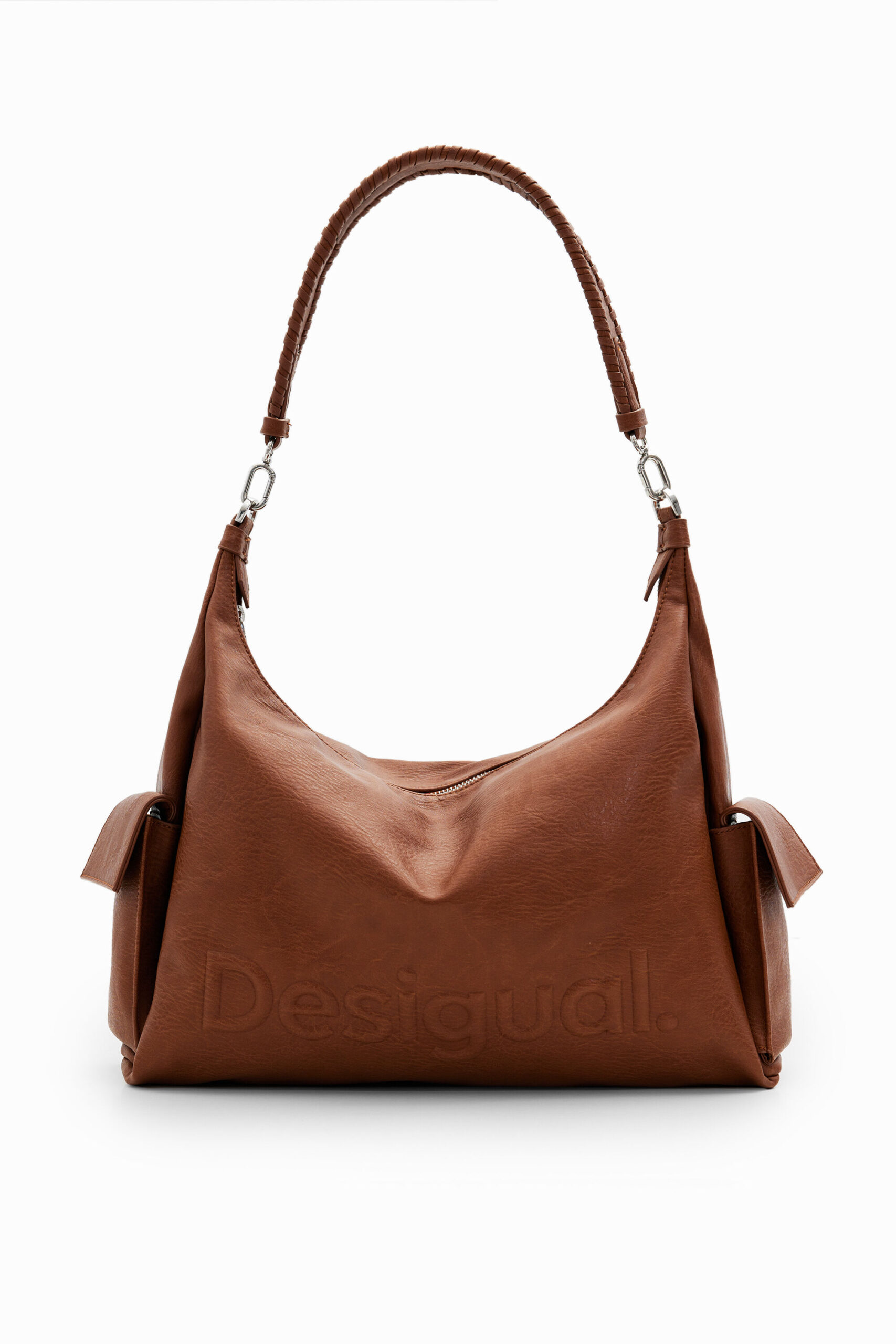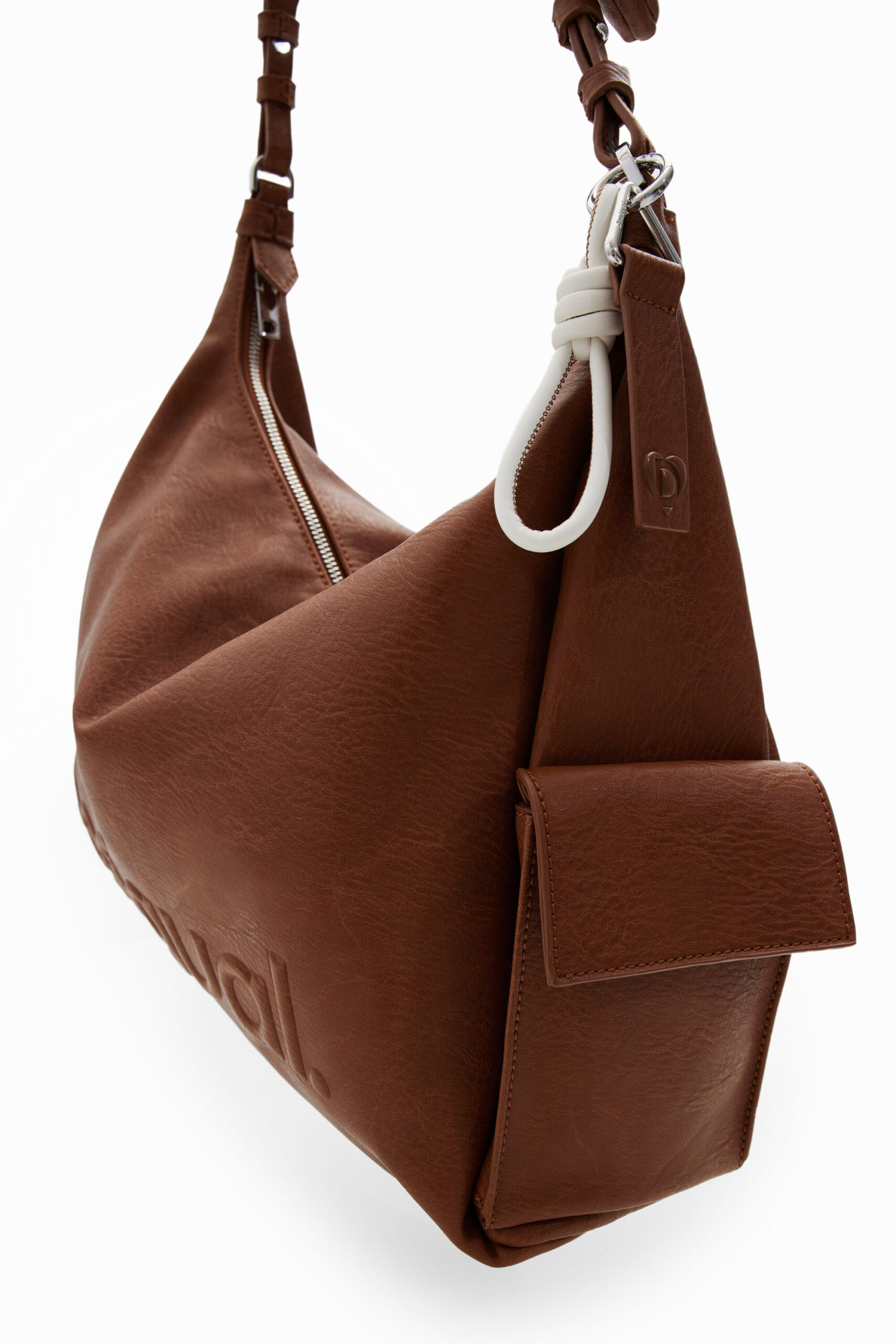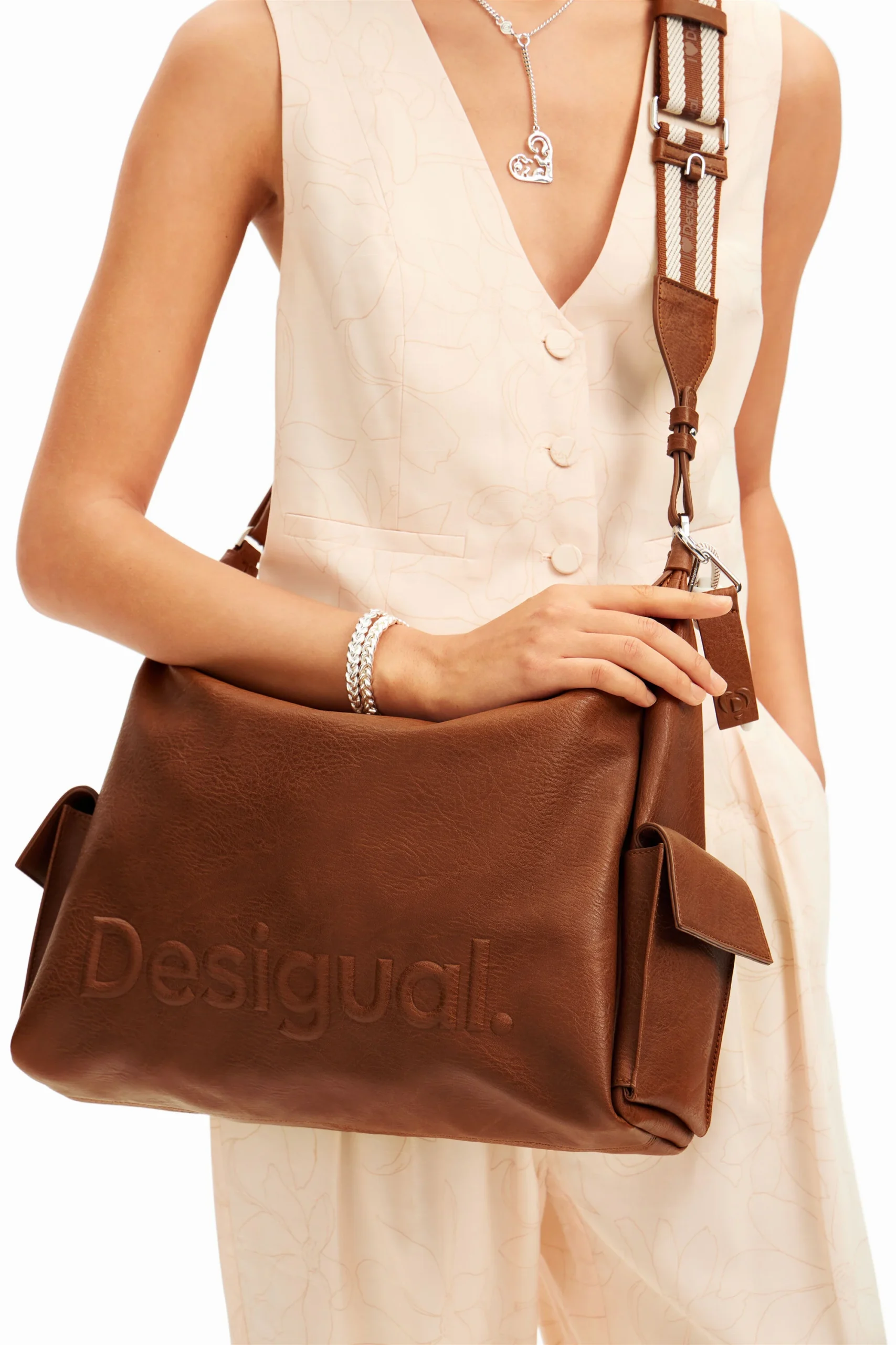 A large handbag in plain leather-effect fabric with an embossed front logo detail. Featuring several straps and and pockets