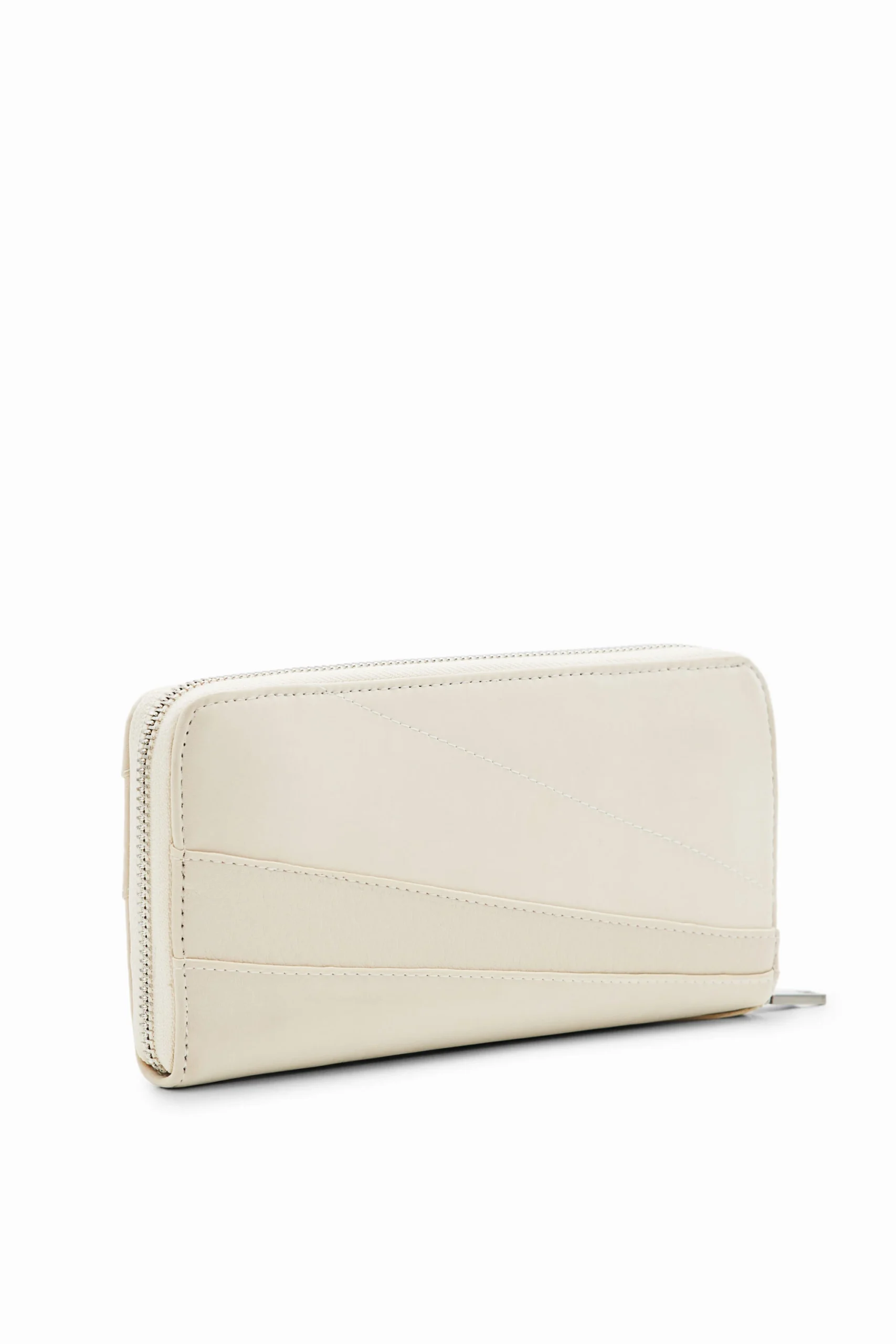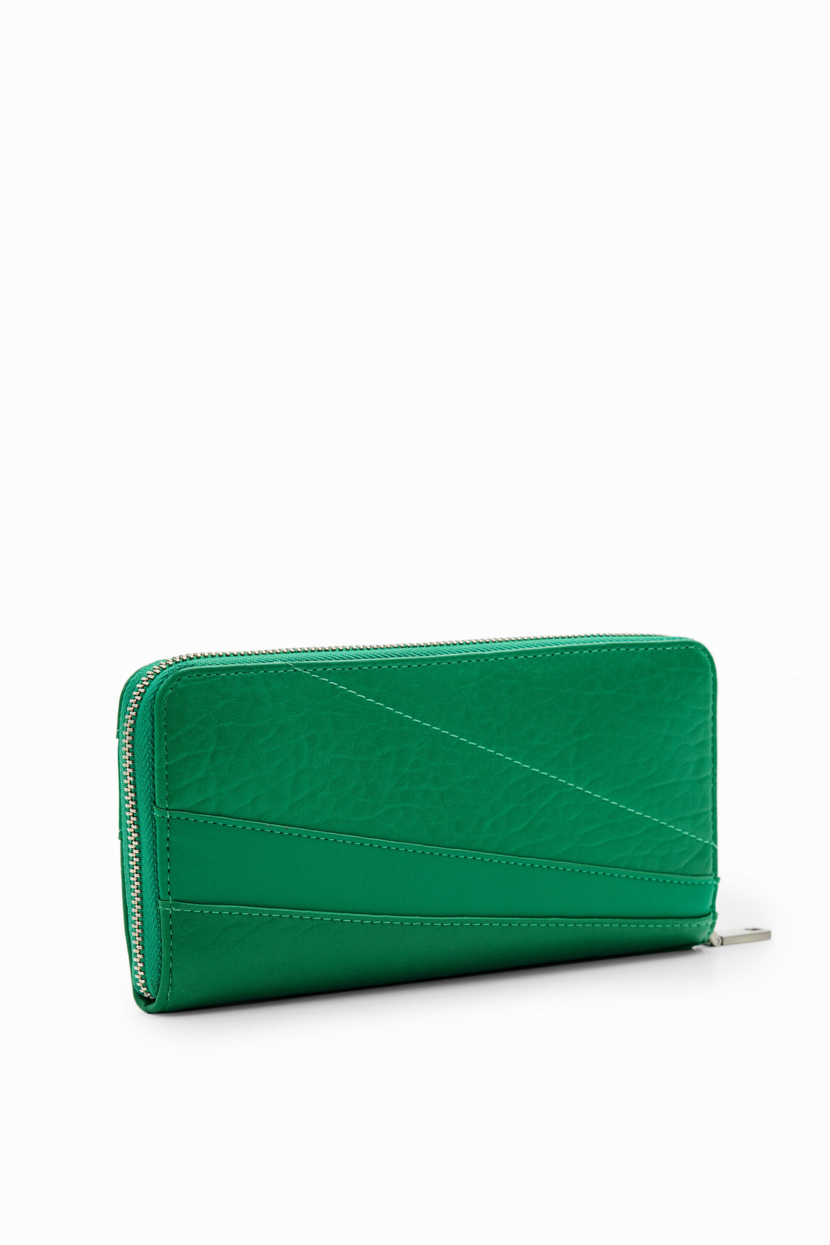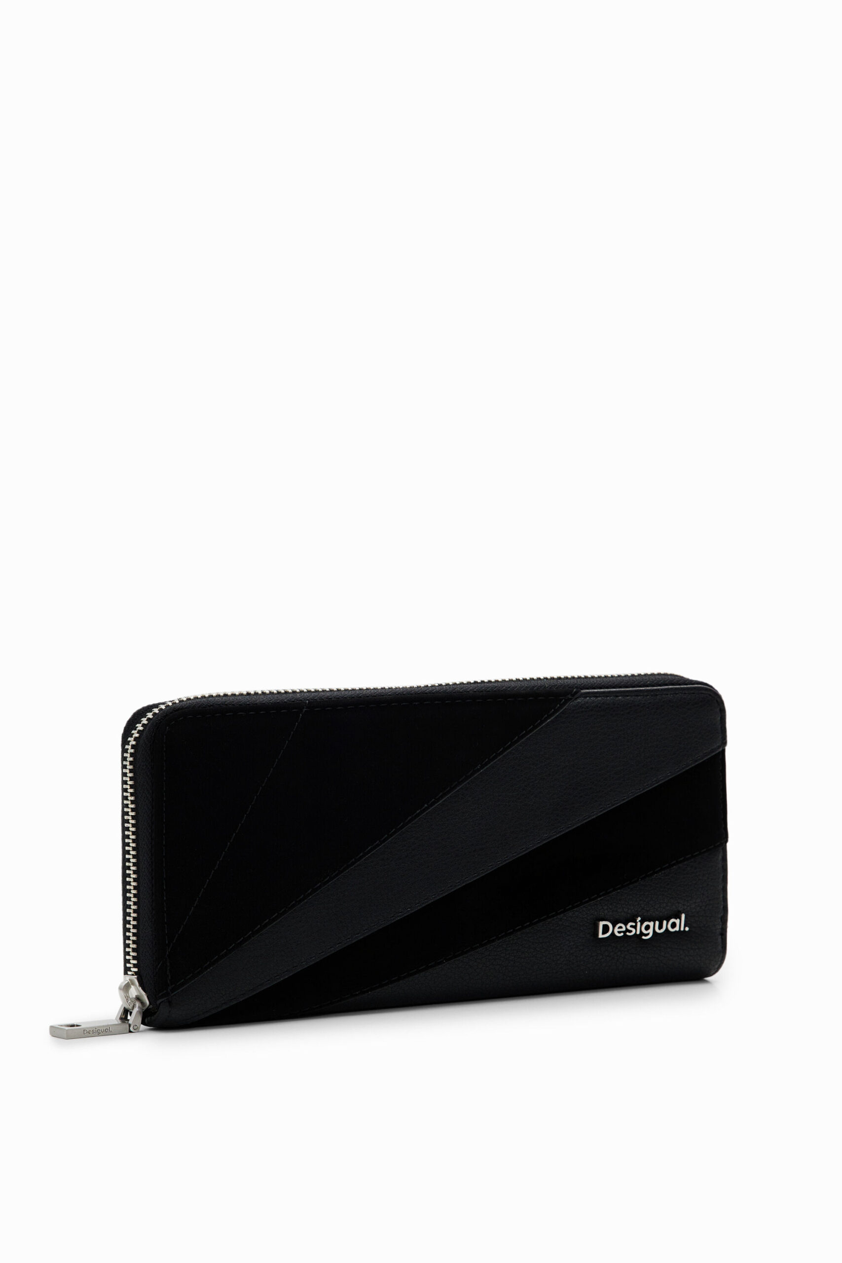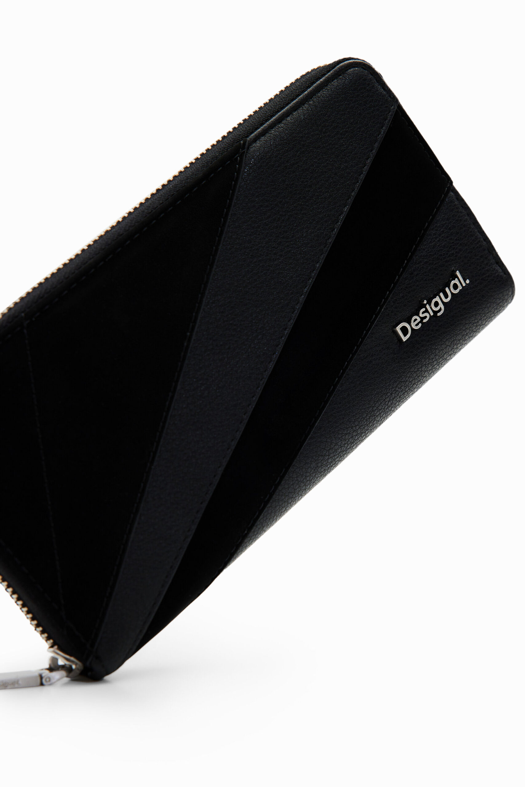 A large rectangular wallet in leather-effect fabric with a patchwork of different textures. Featuring several compartments and pockets.