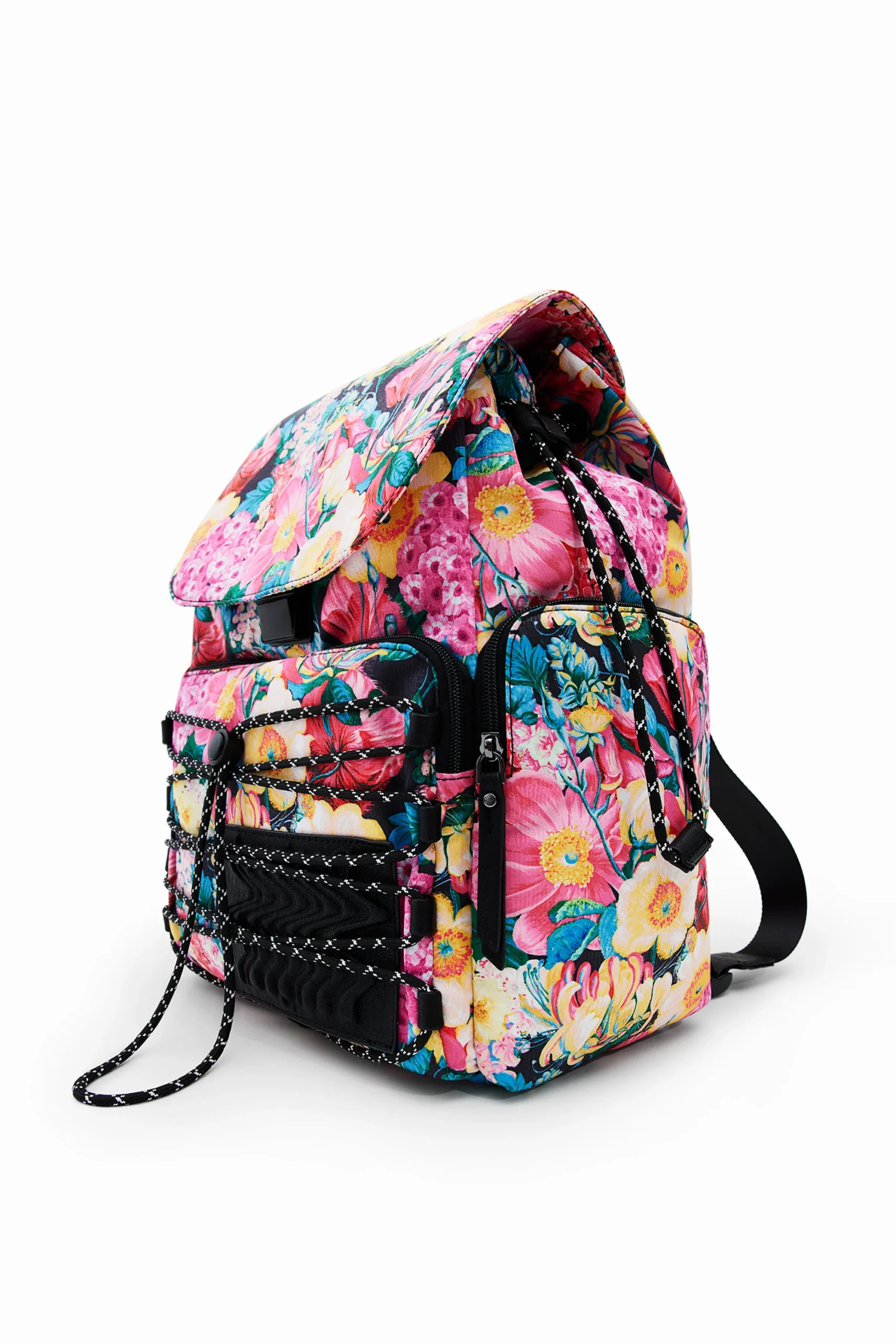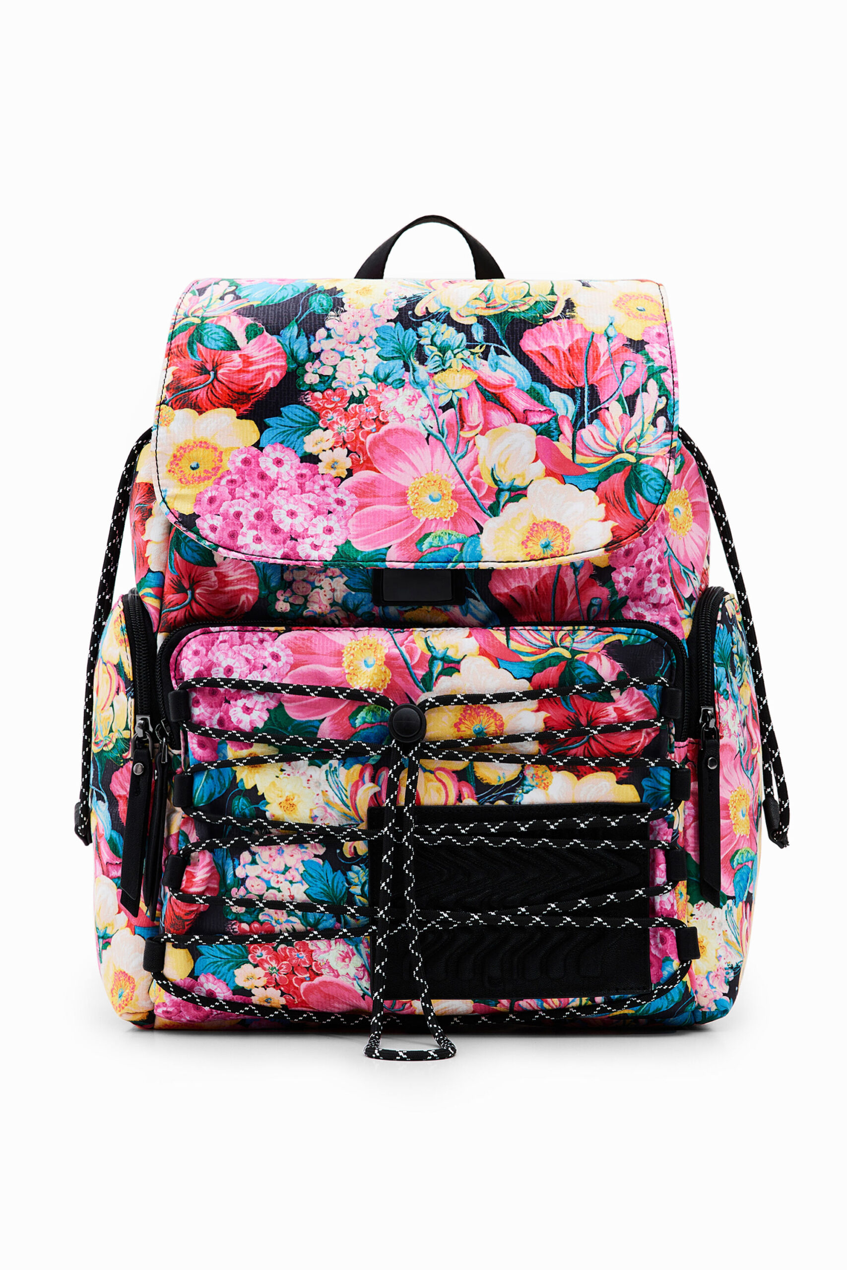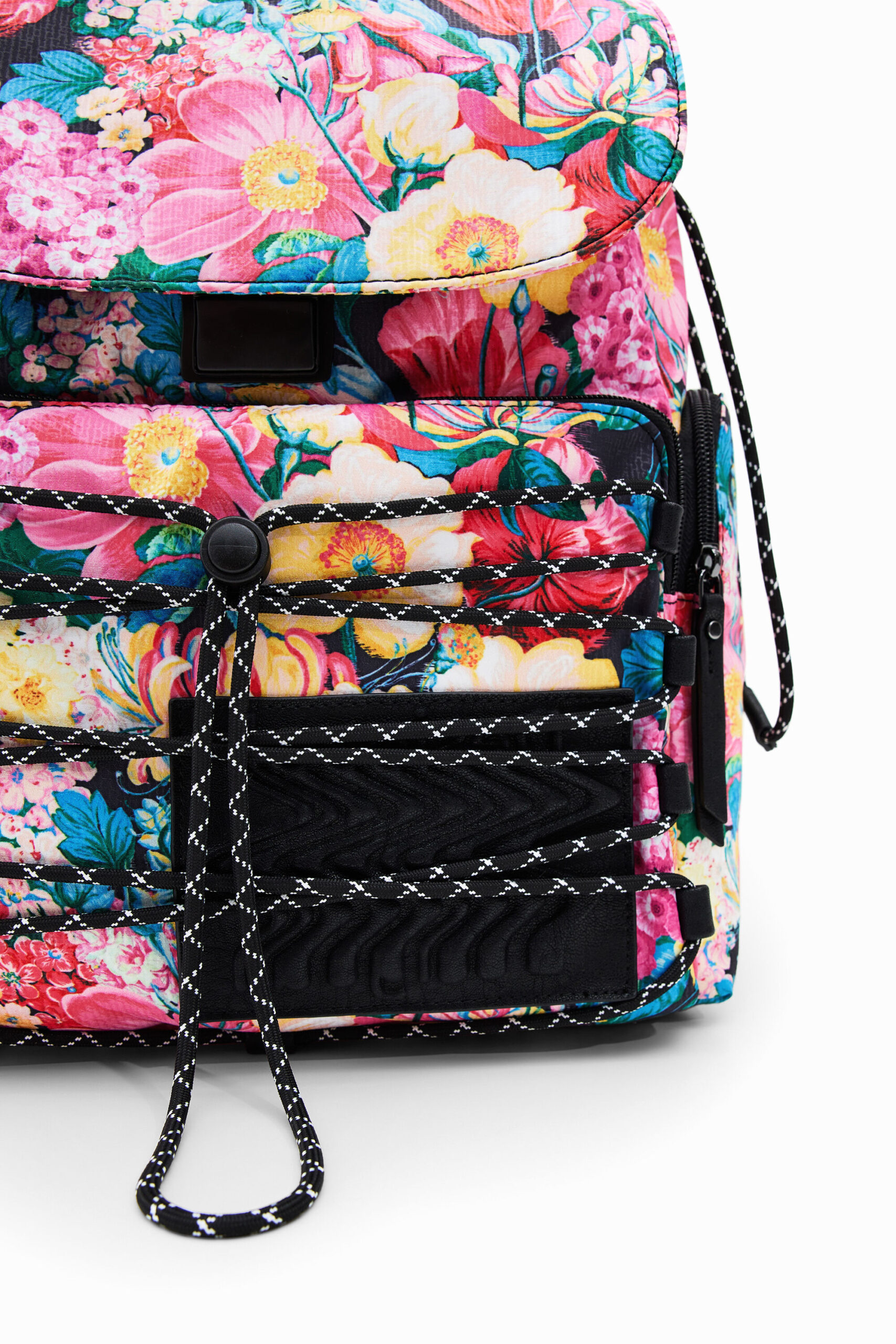 Large backpack with three outside pockets and a spacious interior. Features a print of large flowers and drawstrings on the front pocket. Very light and flexible.