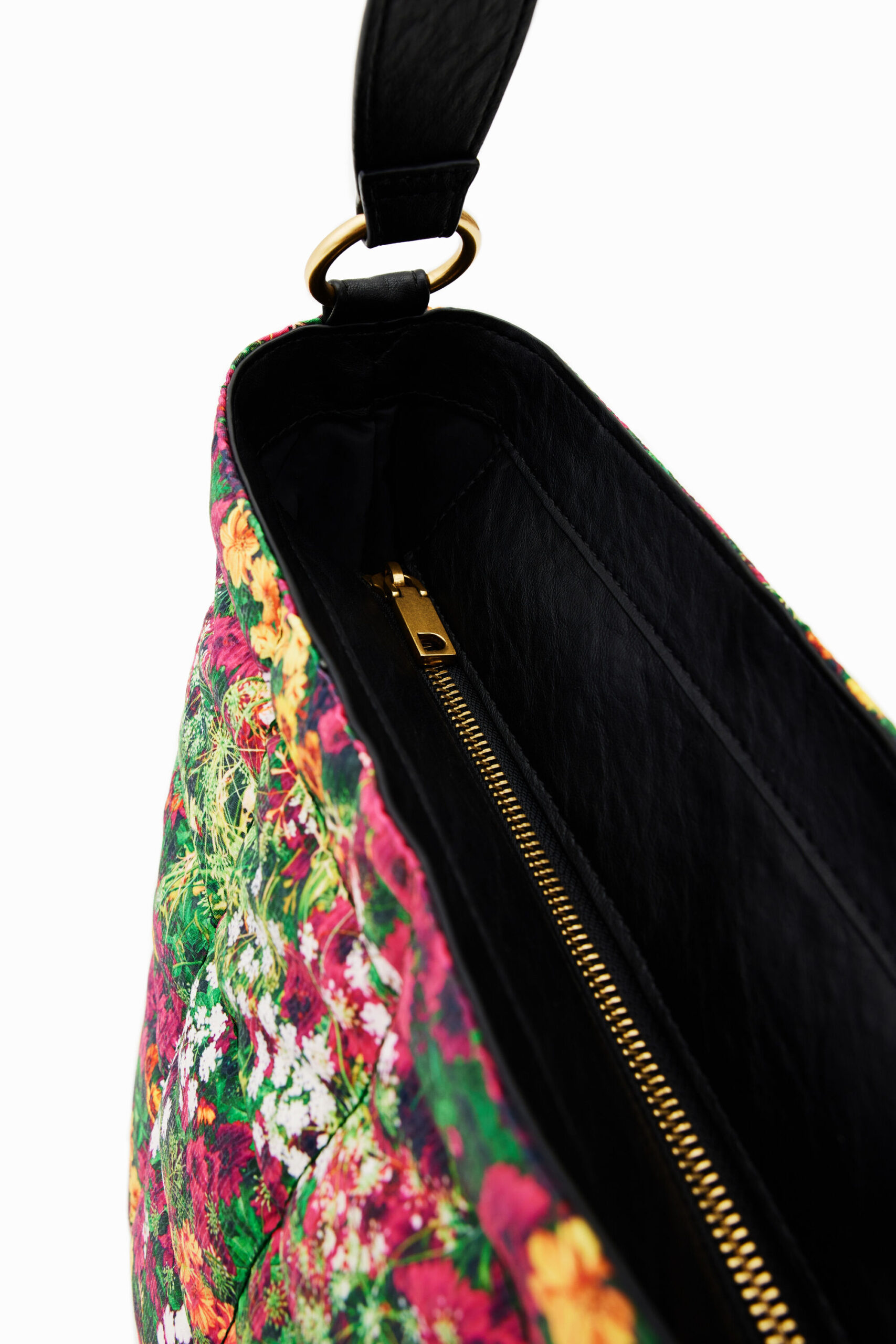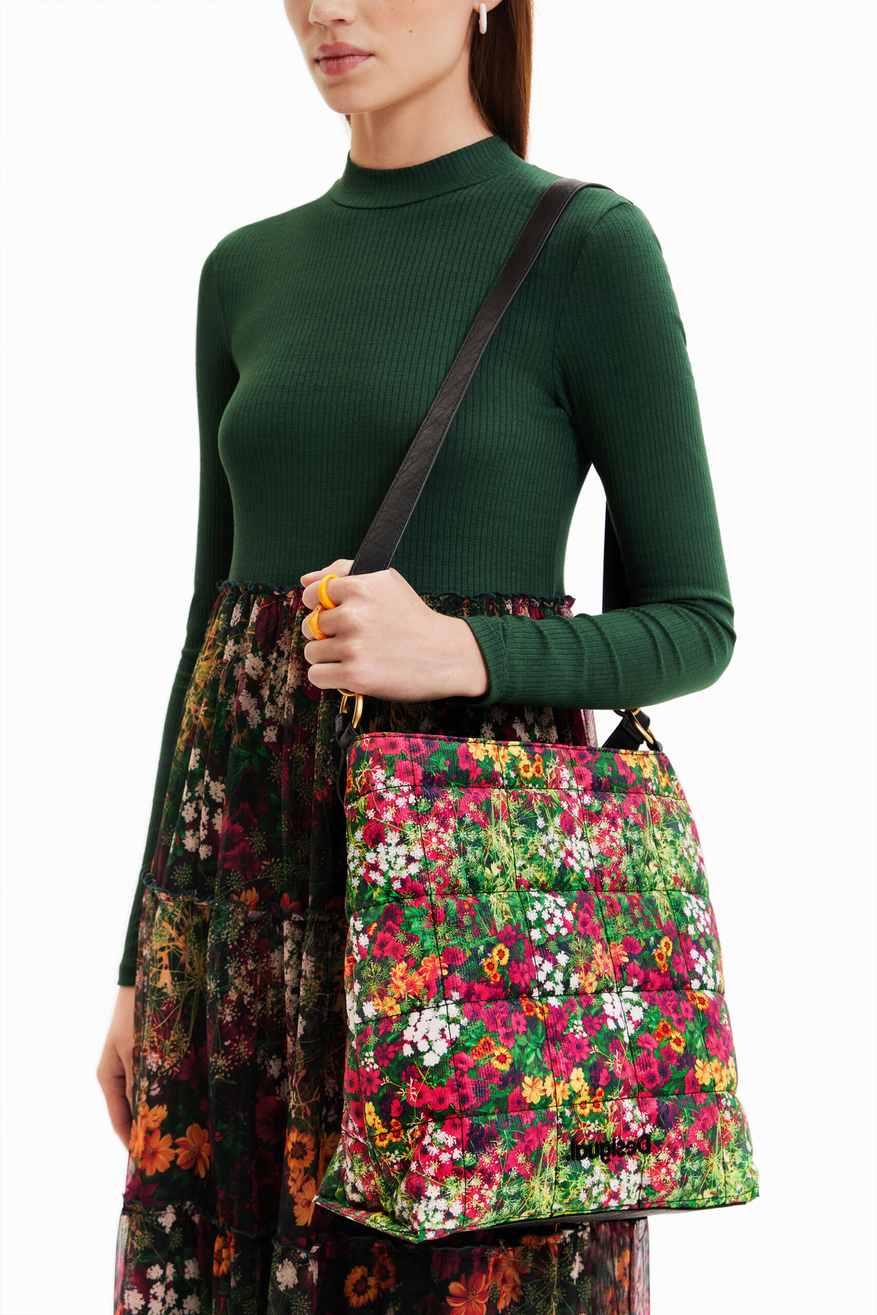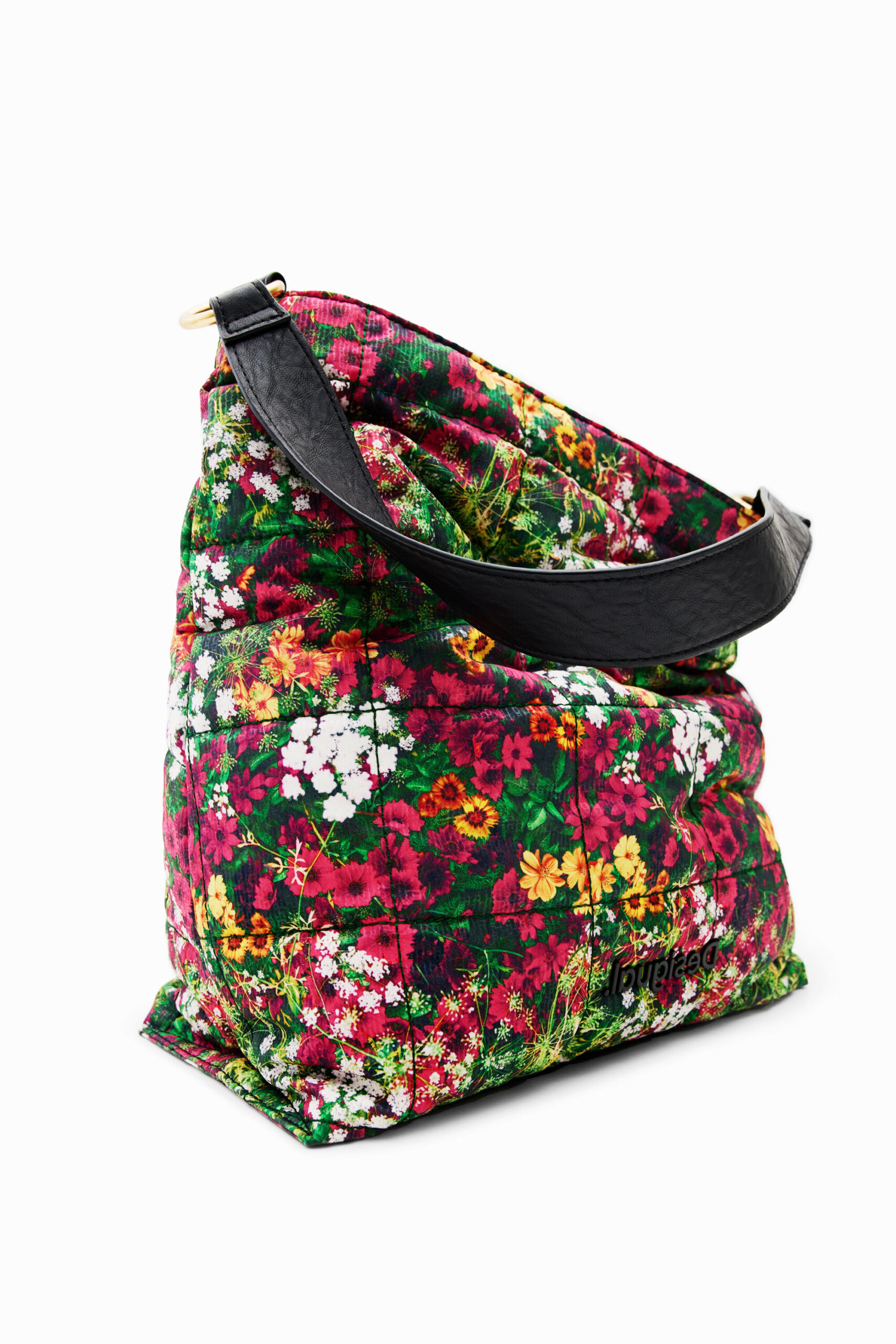 A very light shoulder bag with a mini flower print made from recycled fibres. Features backstitching that creates bands on the outside. The Interior has multiple pockets.