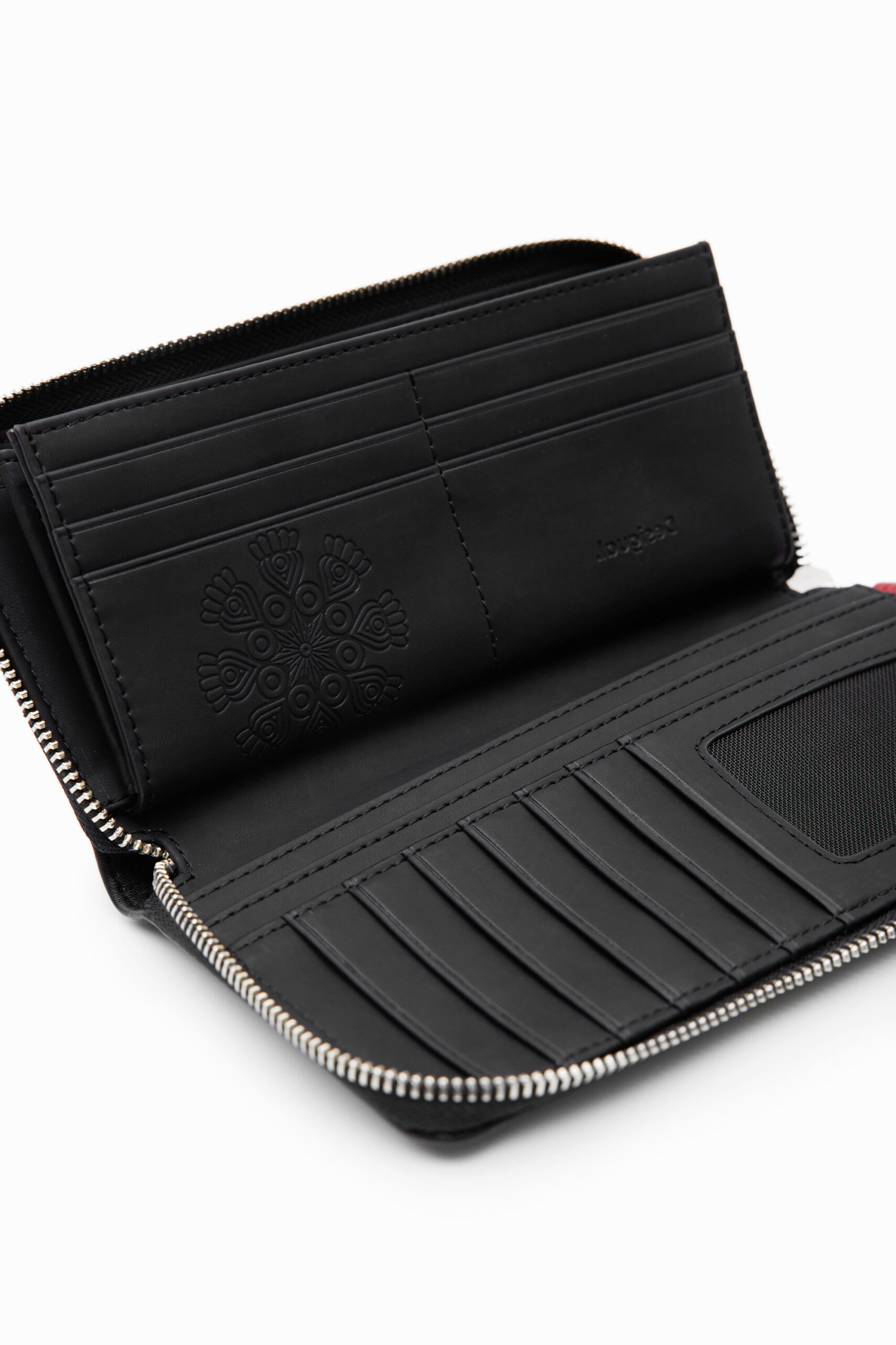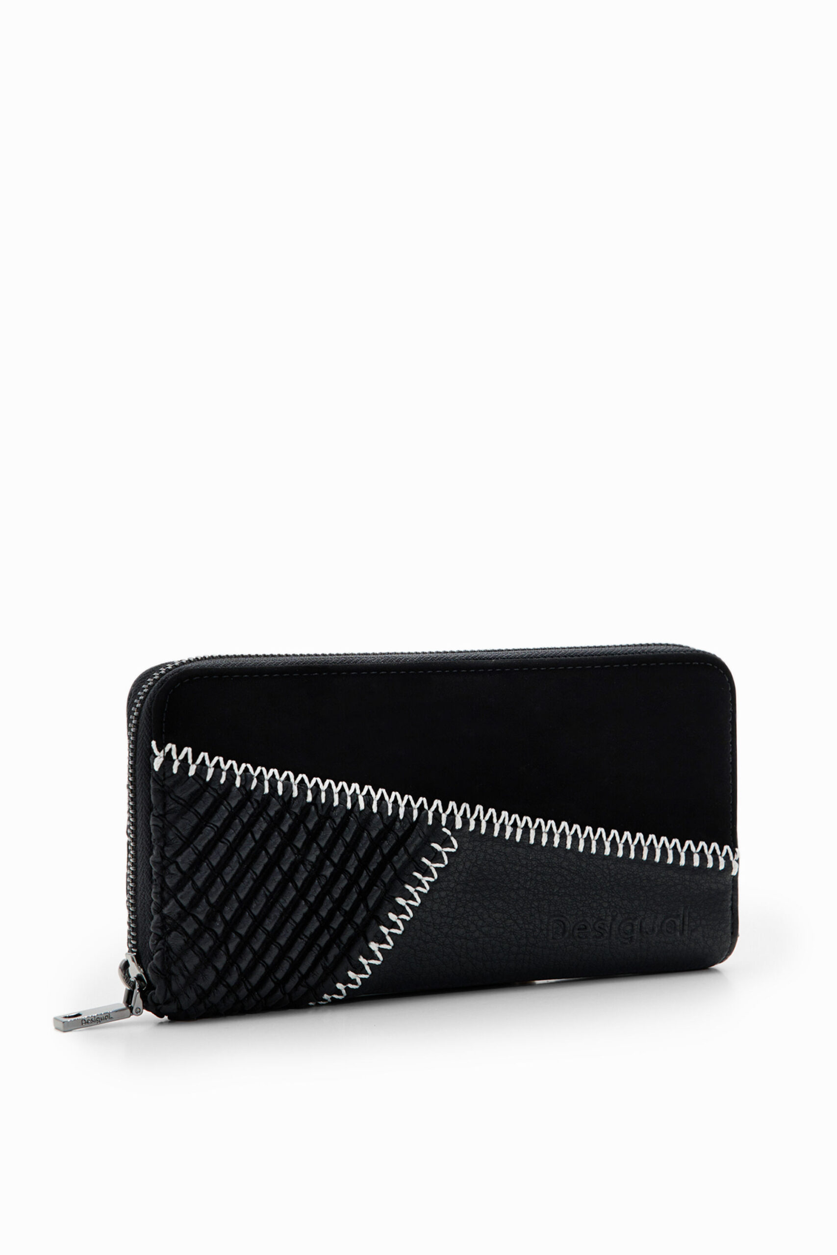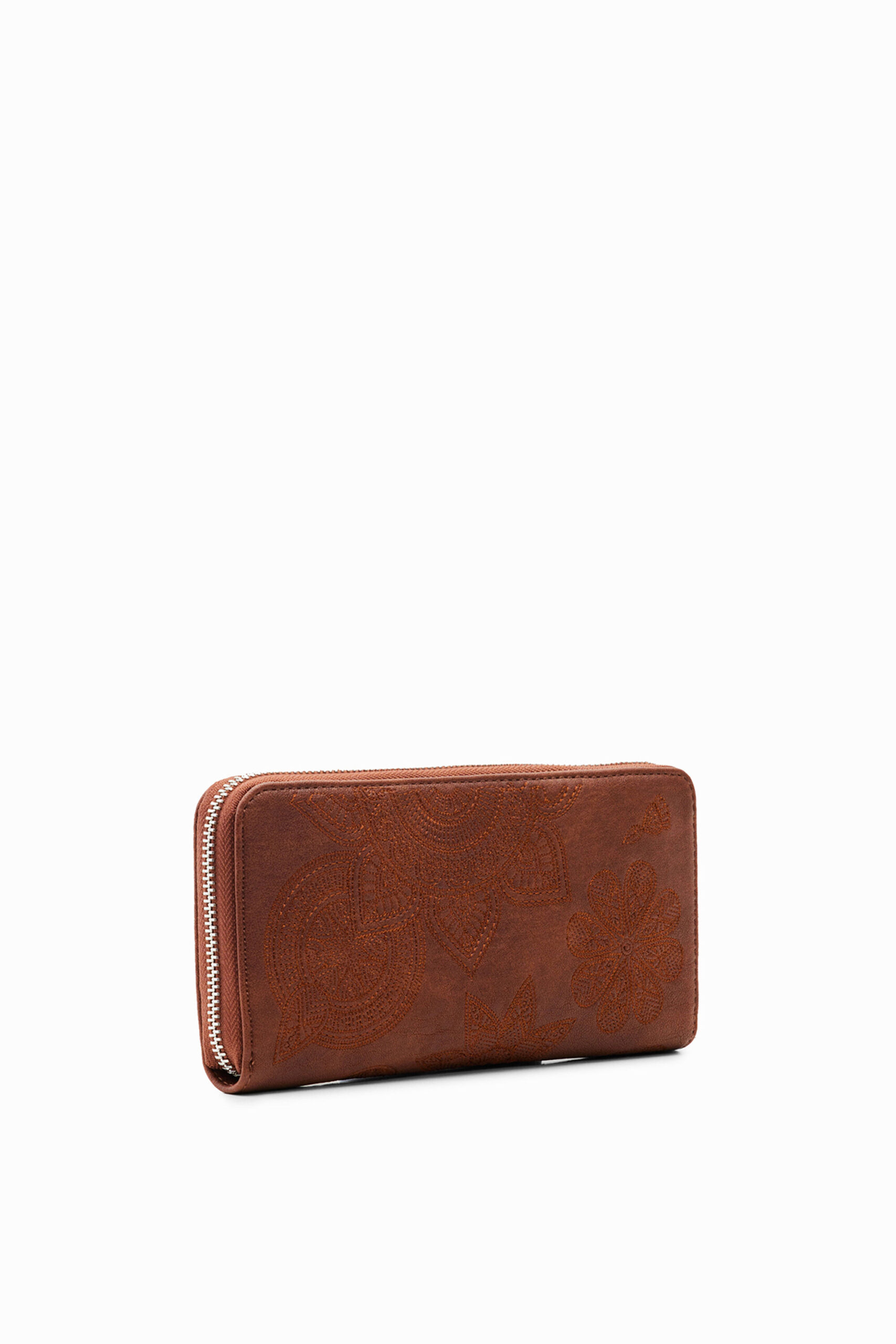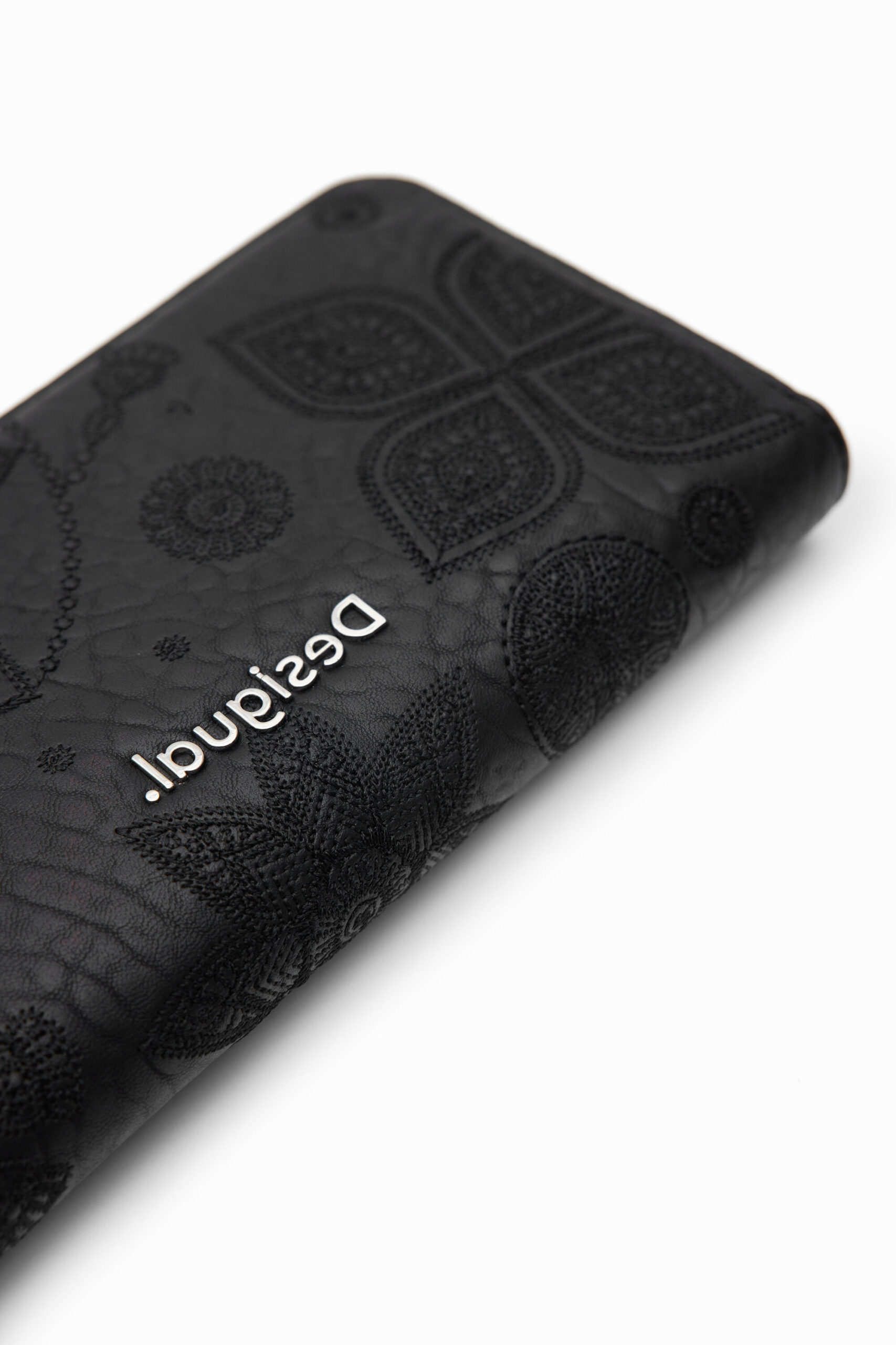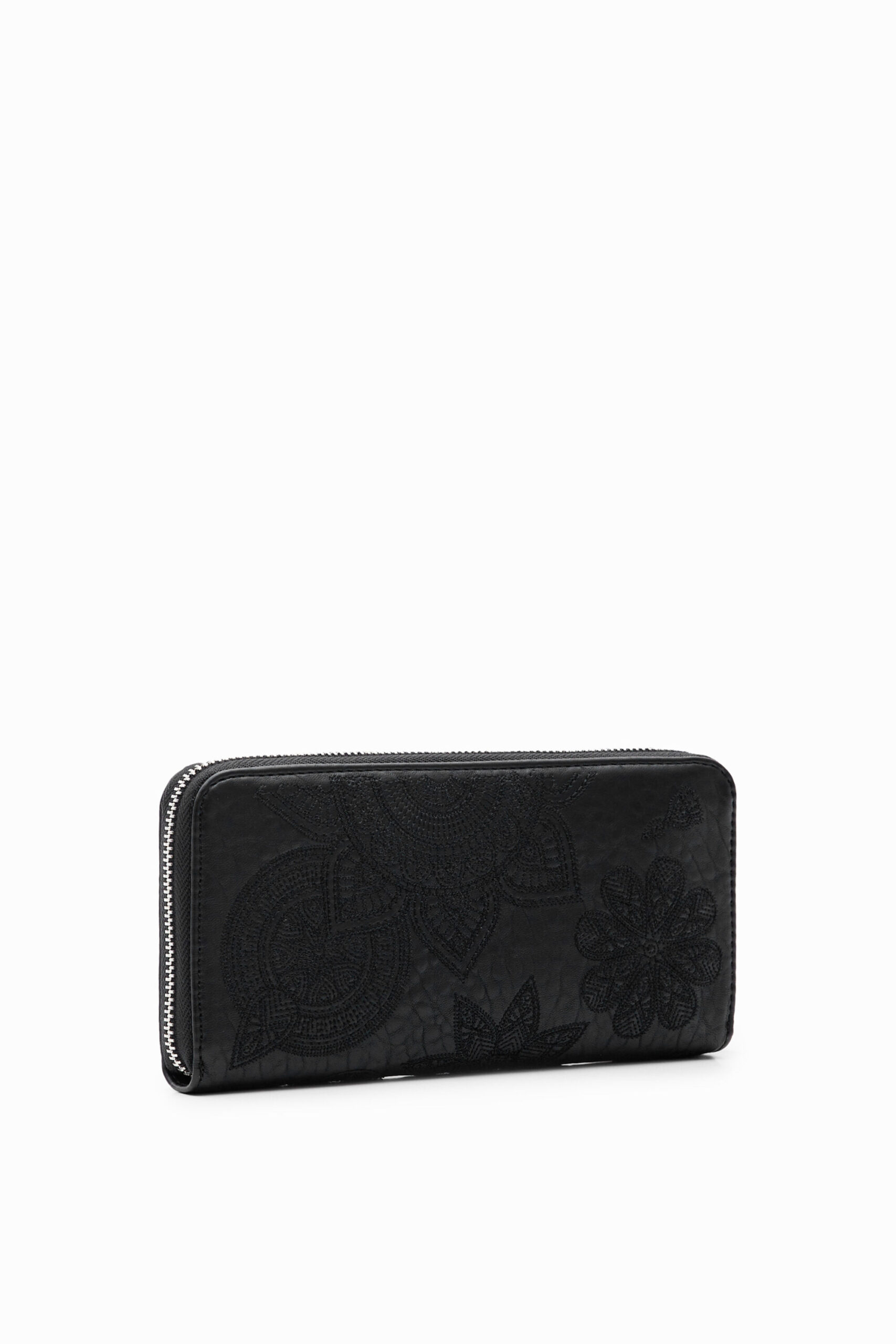 A large rectangular wallet in leather-effect fabric with geometric floral embroidery.