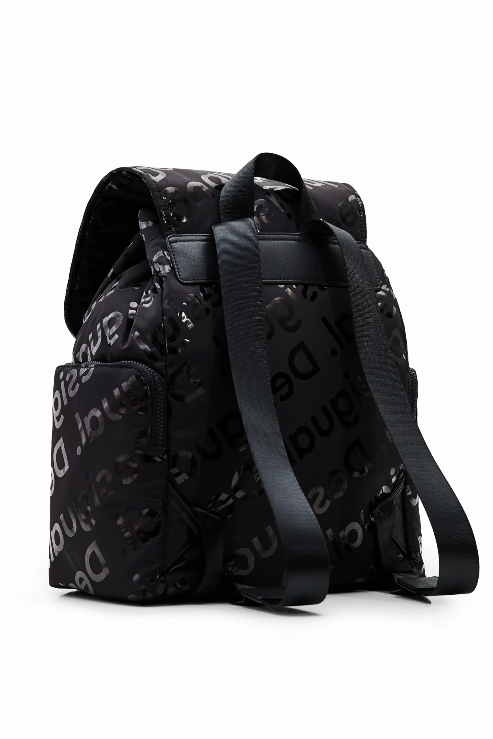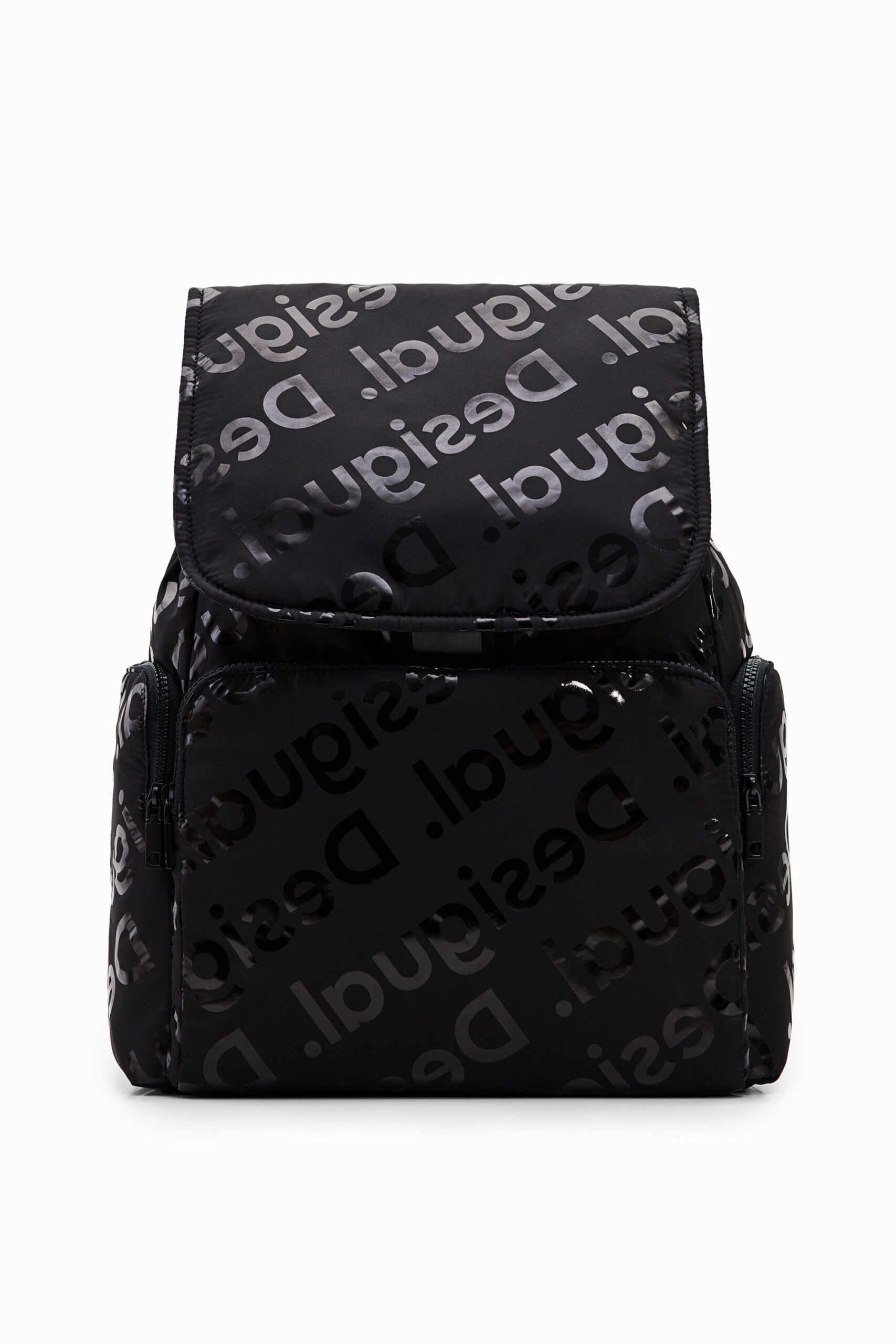 Large backpack with three outside pockets and a spacious interior. Covered in large iridescent logos. Very light and flexible.