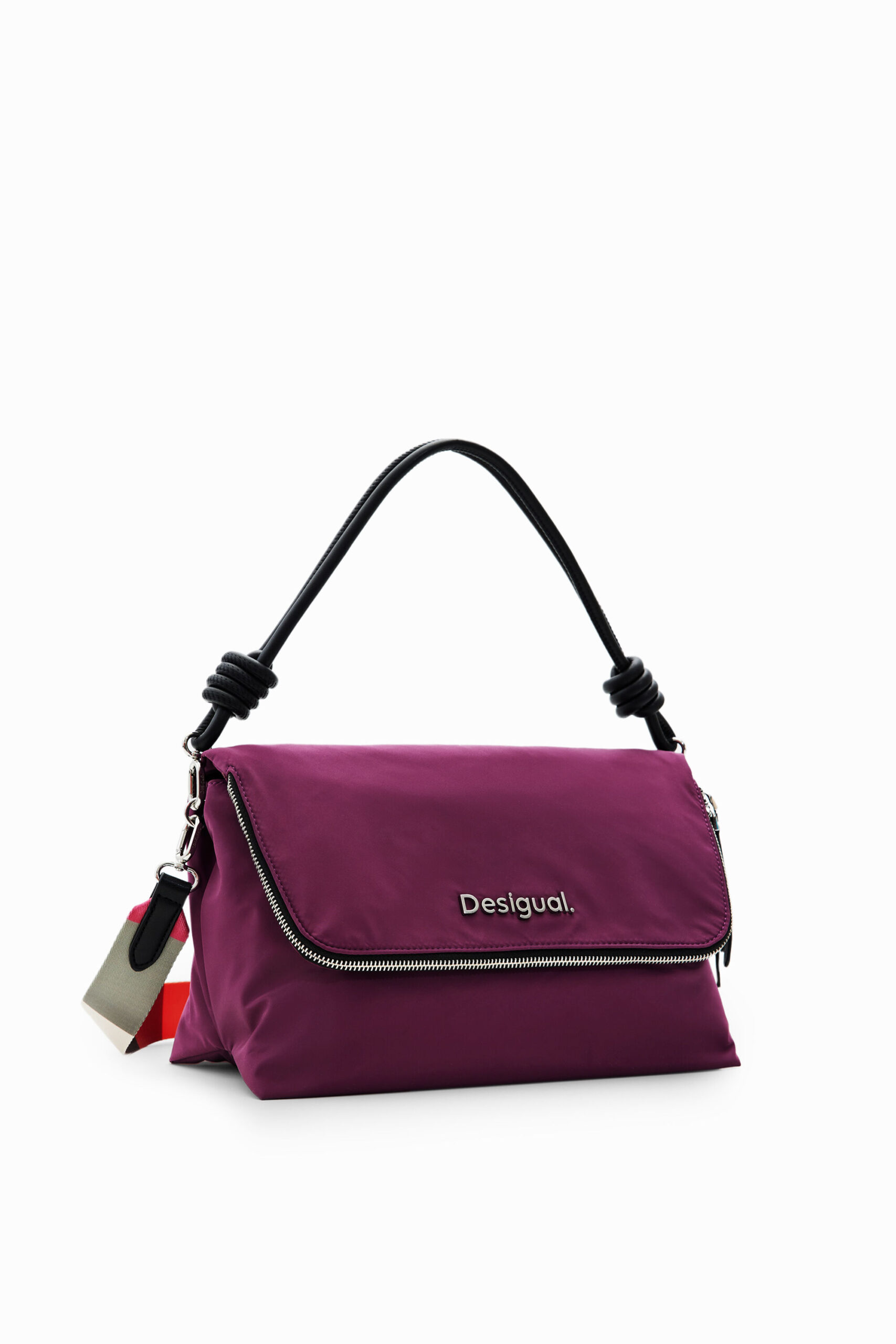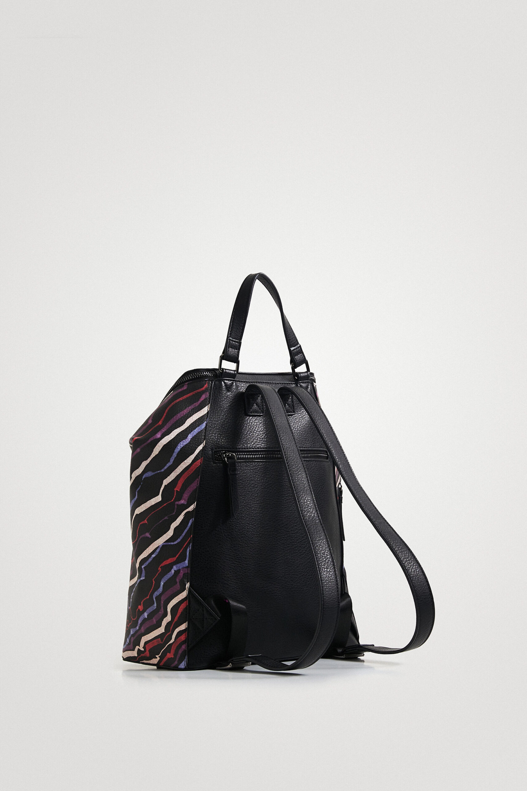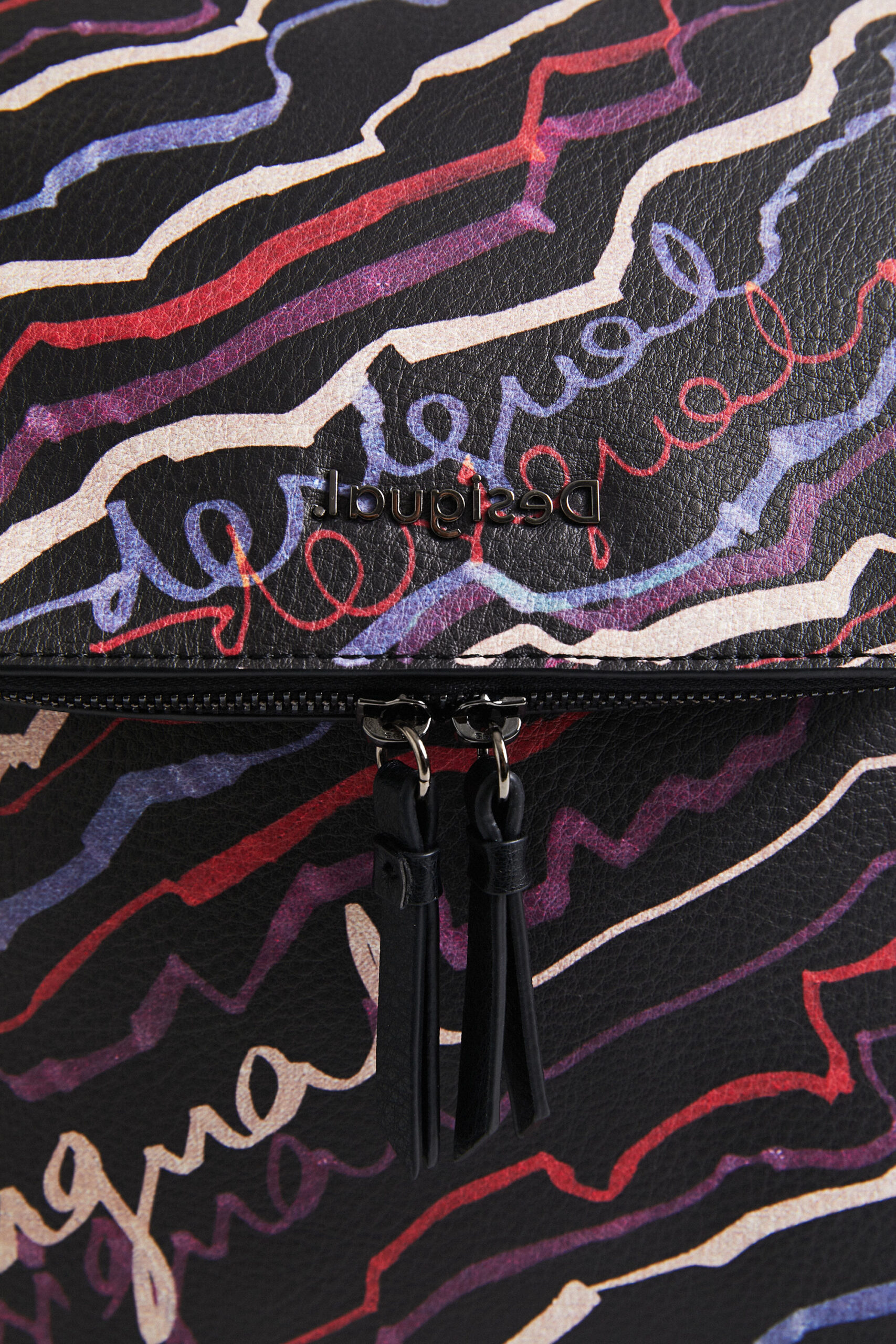 This medium backpack is not like the others. Its slightly folded upper part gives originality to your silhouette. With painted lines of colours that end with the Desigual logo written in colours.