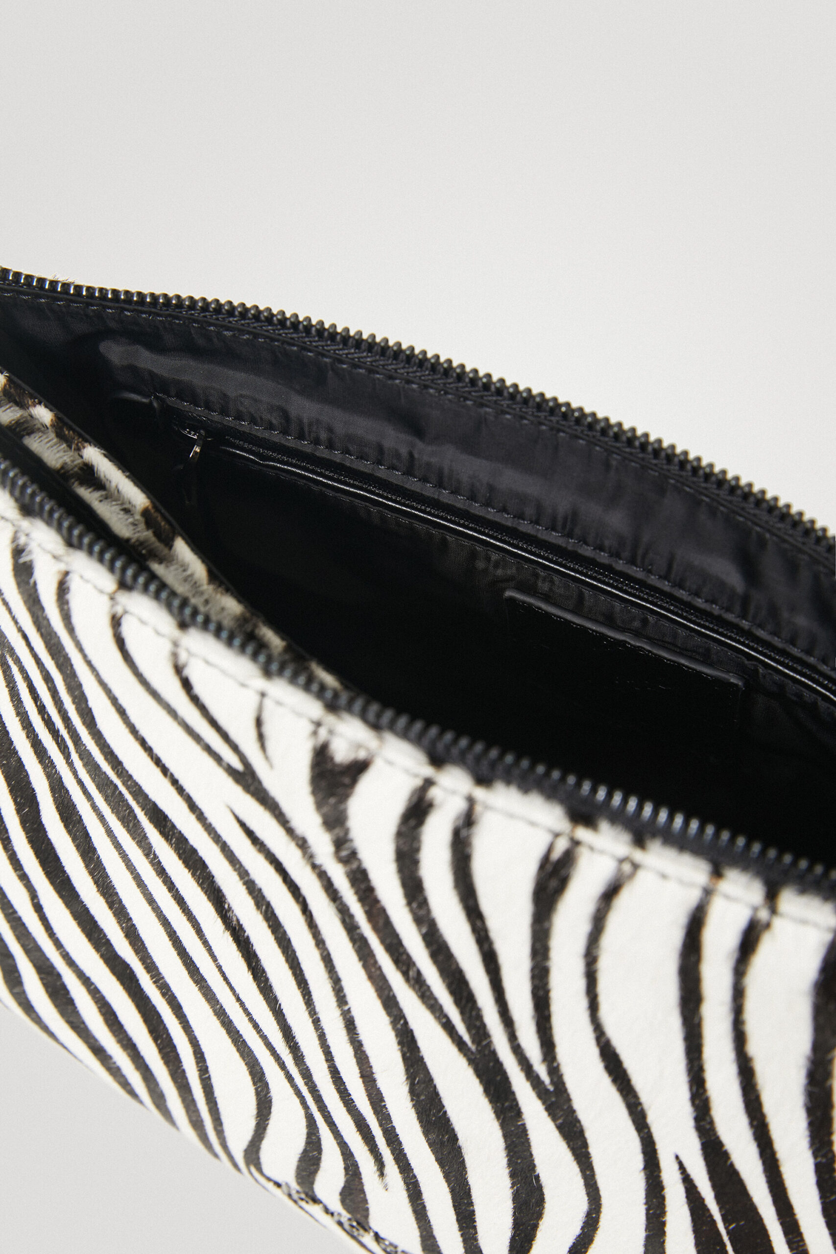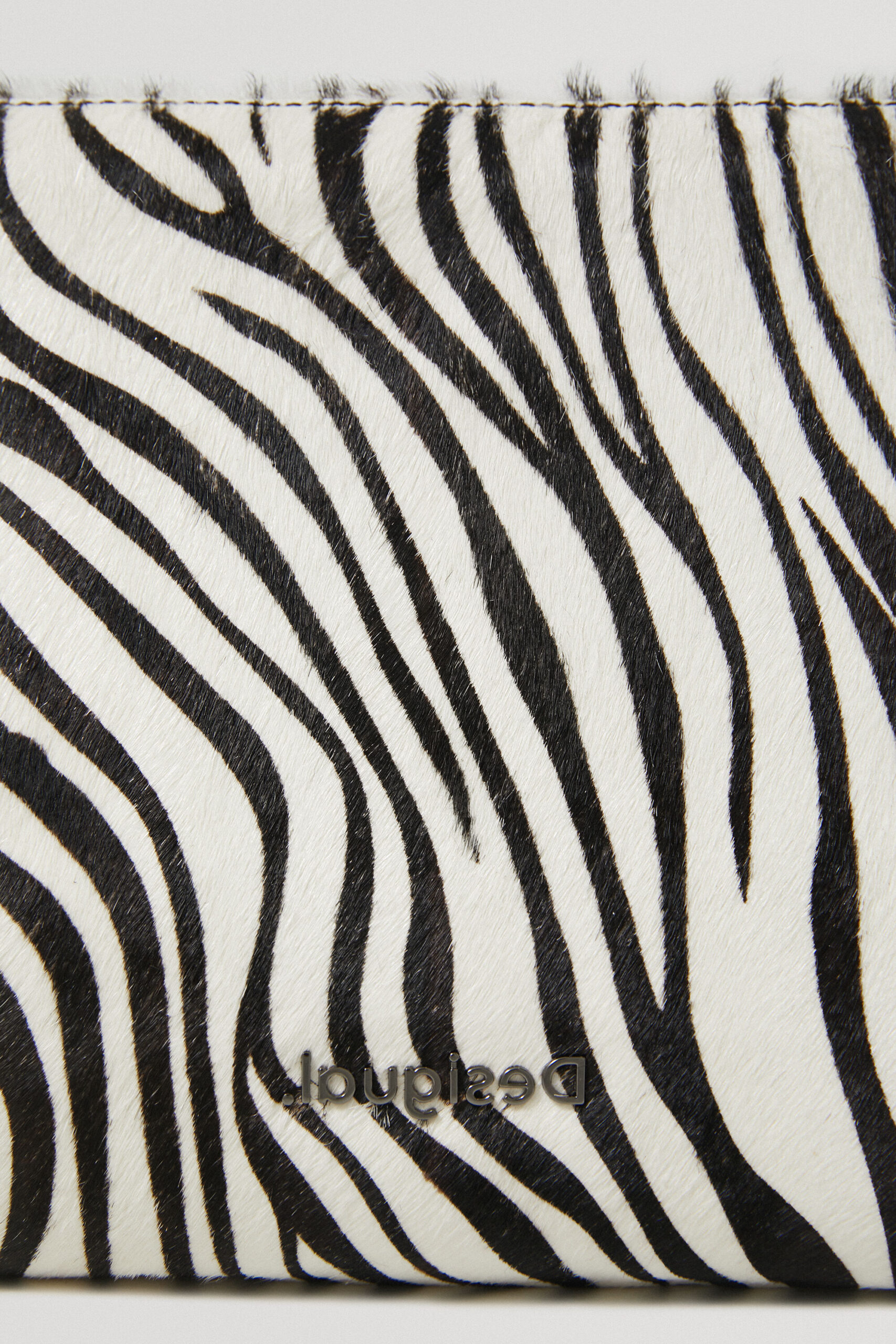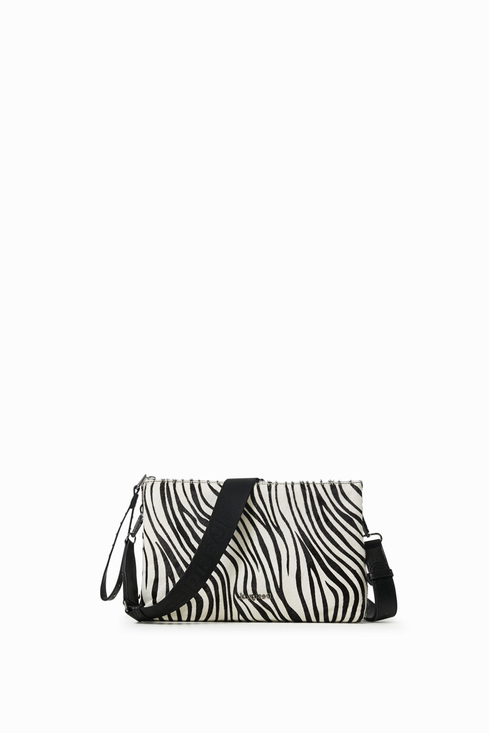Leather bag with zebra animal print on one side, and of stains on the other, with two compartments and zip fastener. With puller strap with studs for carrying as a handbag.