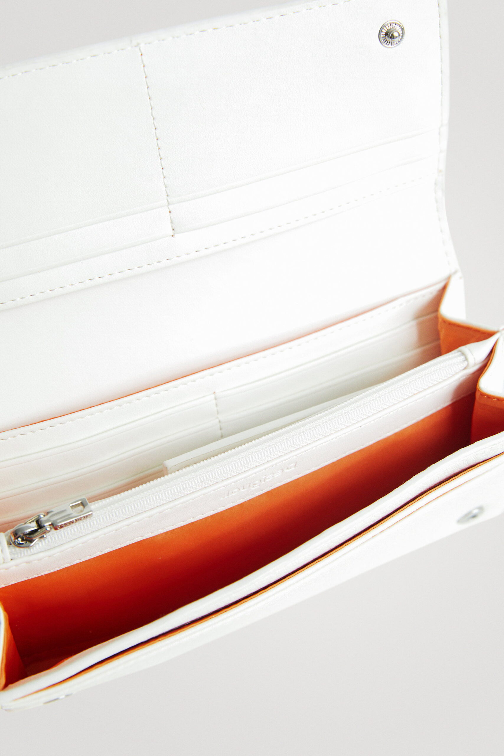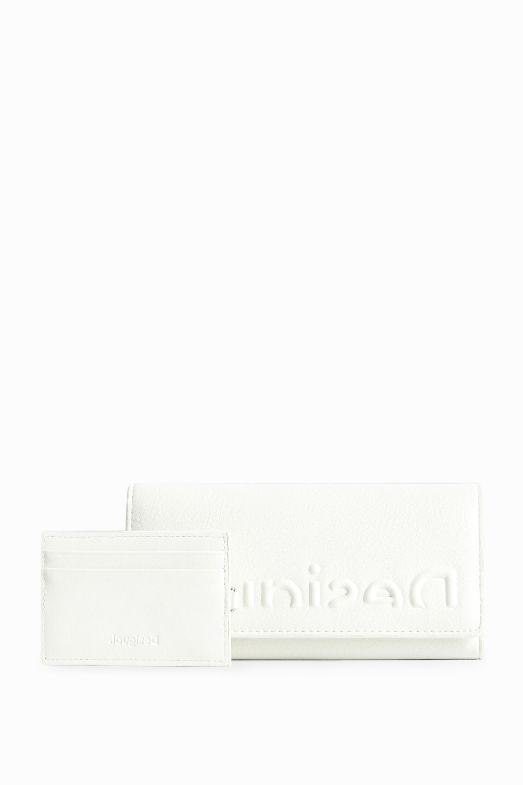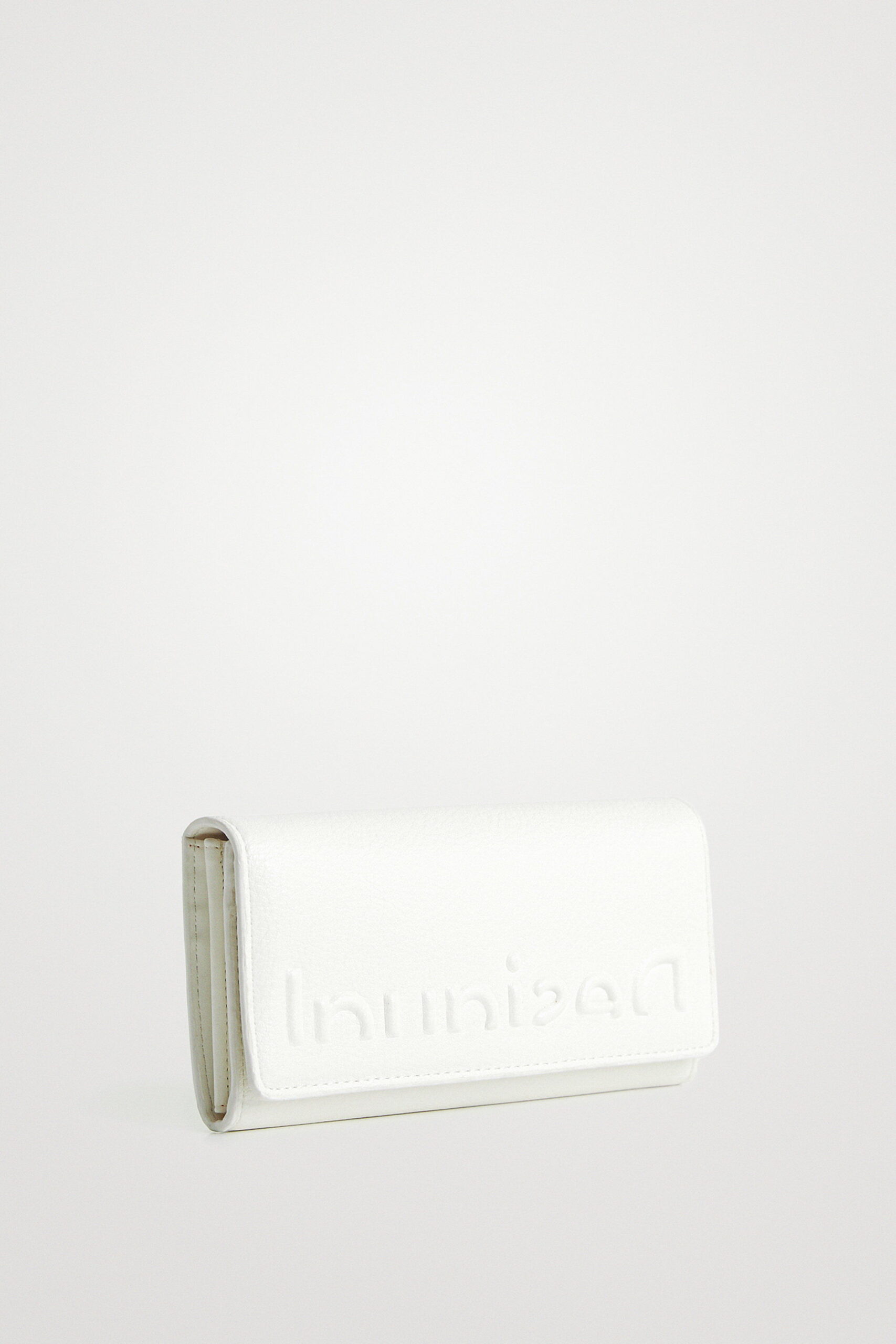 A large Desigual logo with an embossed effect on a very soft white wallet with a flap. Inside divided into compartments for coins, cards and notes.