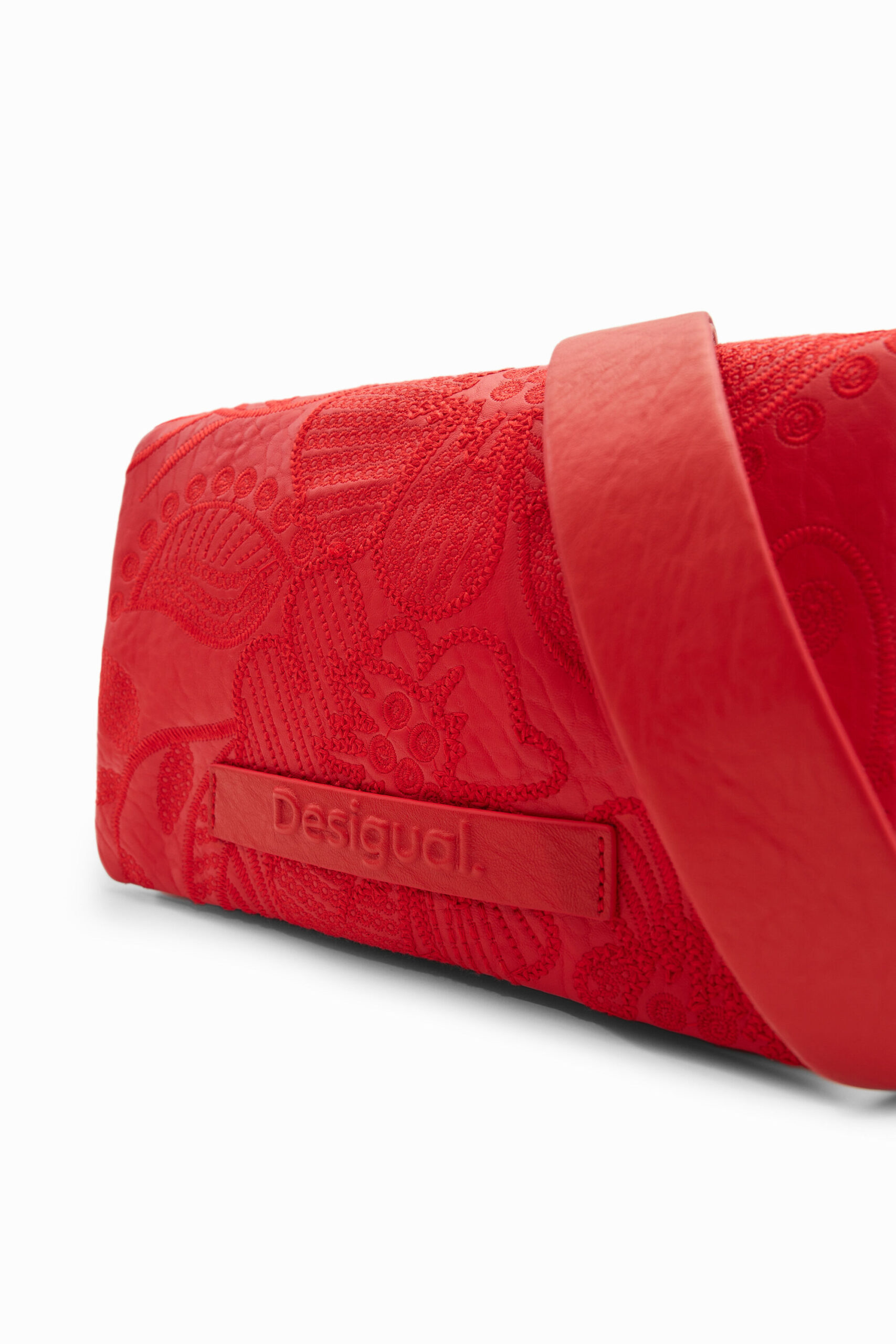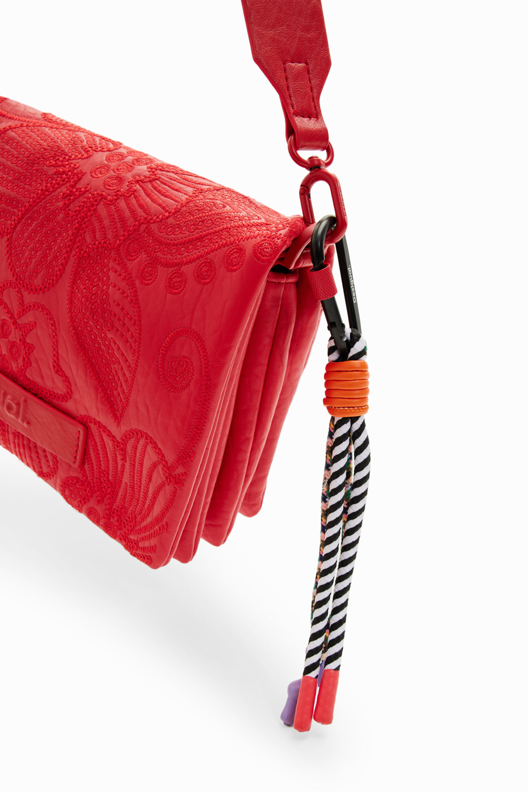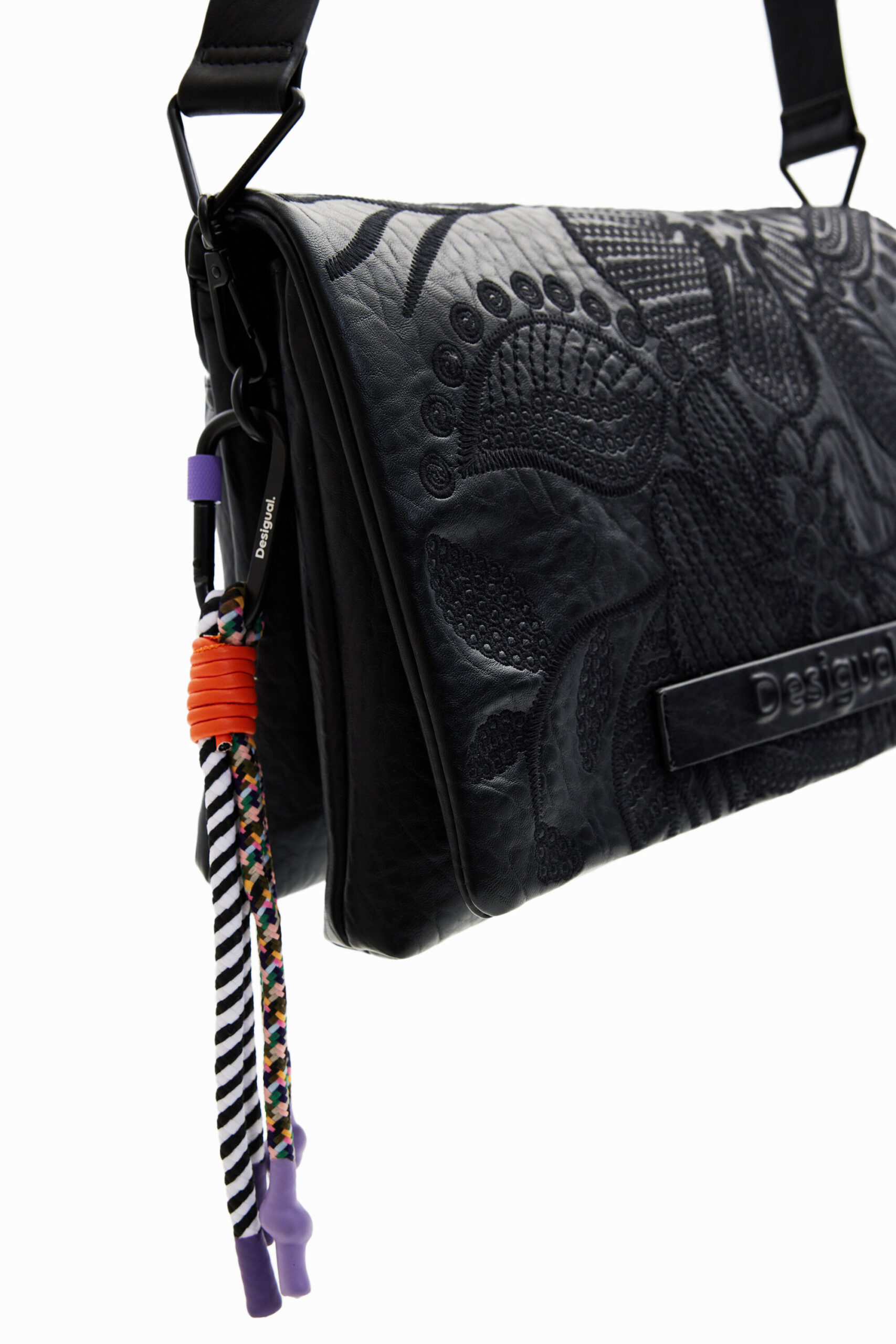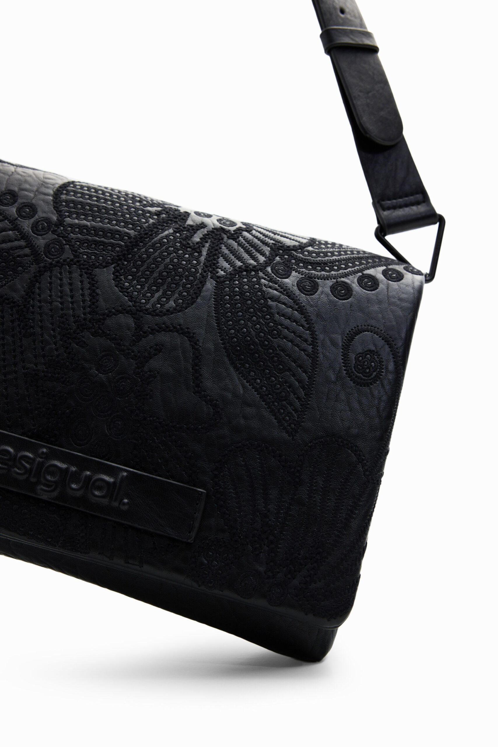 A midsize leather-effect crossbody bag with tone-on-tone floral embroidery, several compartments and pockets.