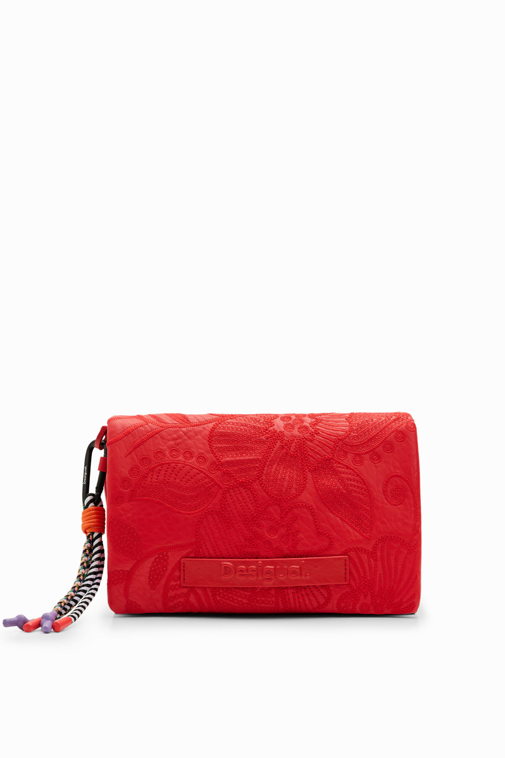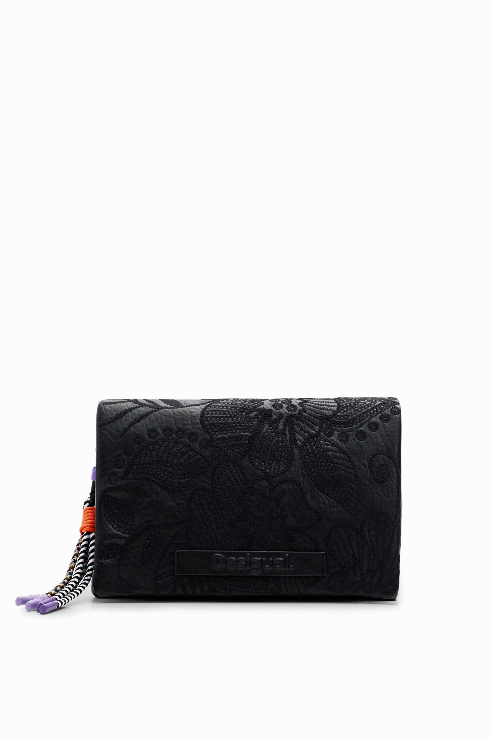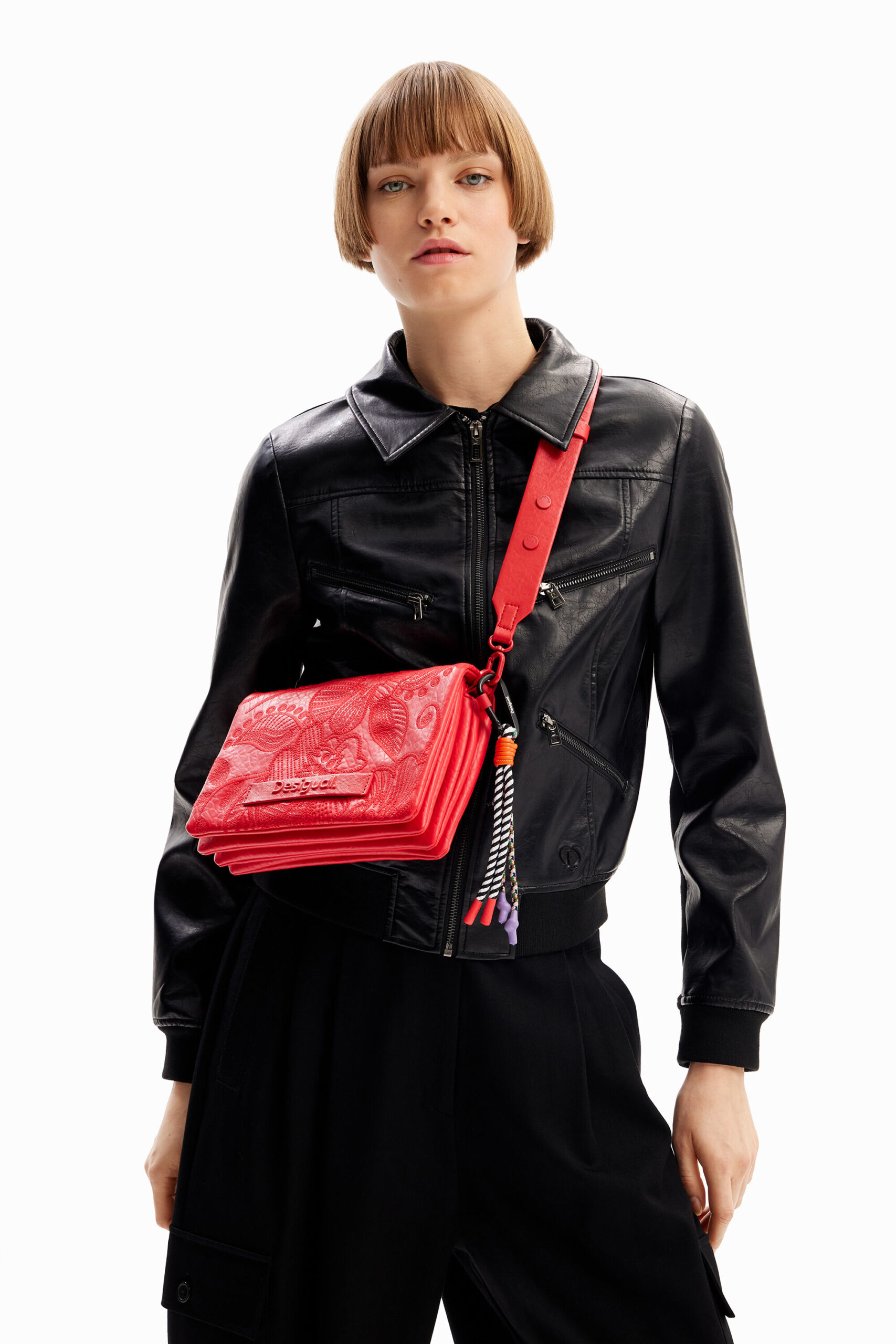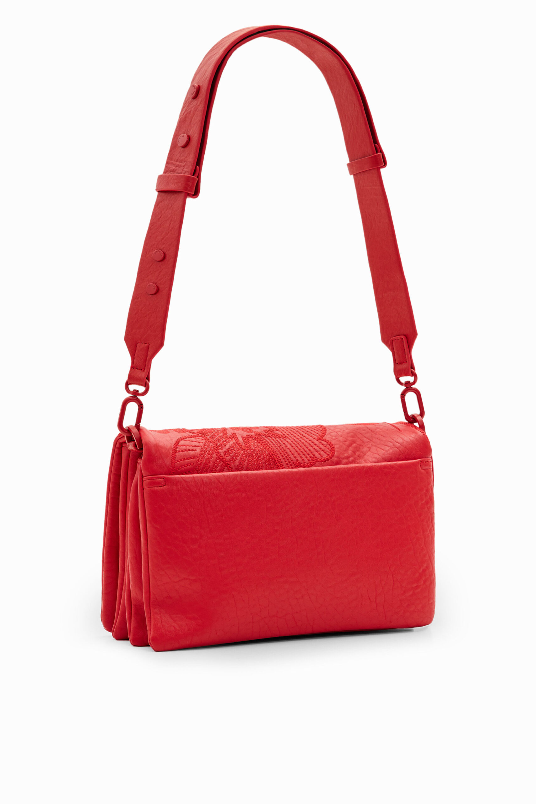 A midsize leather-effect crossbody bag with tone-on-tone floral embroidery, several compartments and pockets.