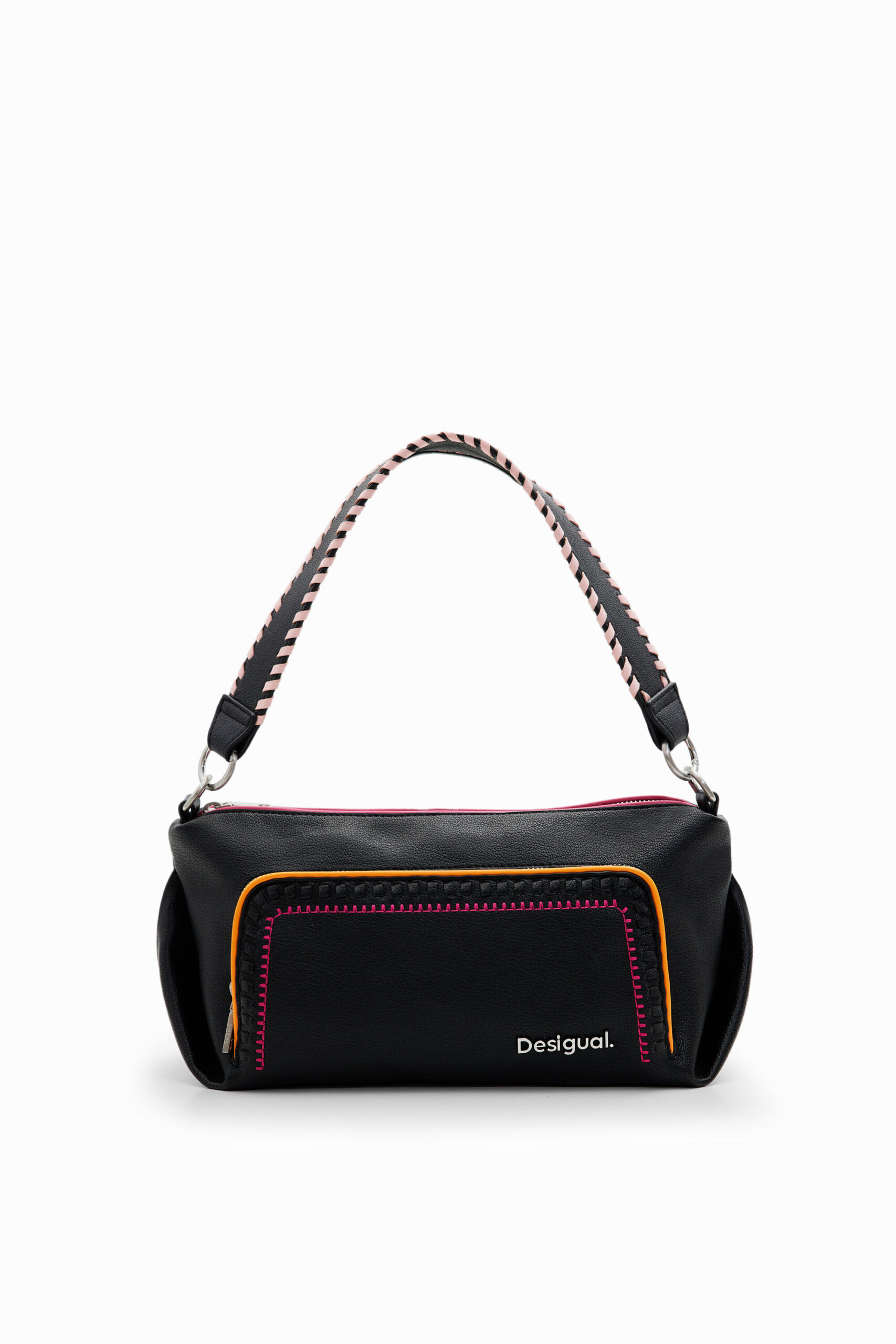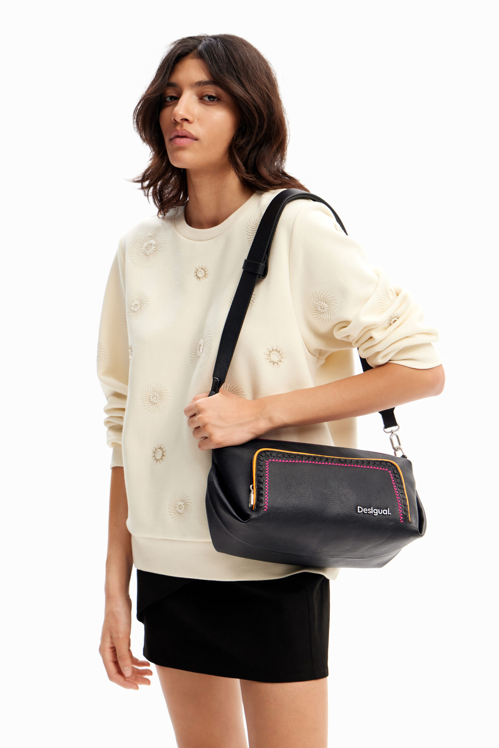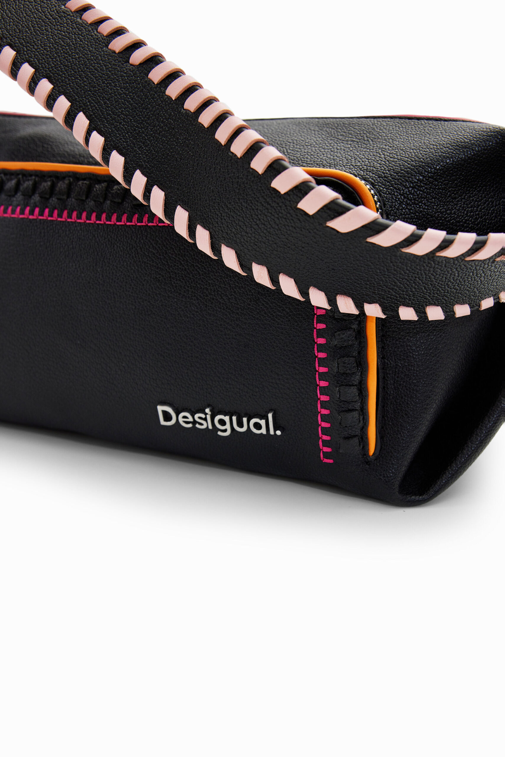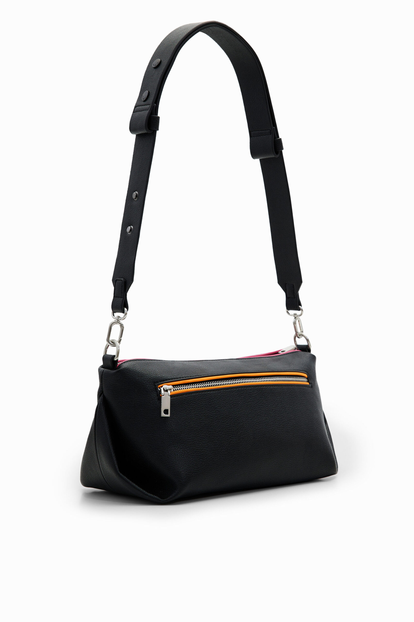 - Two detachable leather-effect straps: a short shoulder strap and a long adjustable crossbody strap