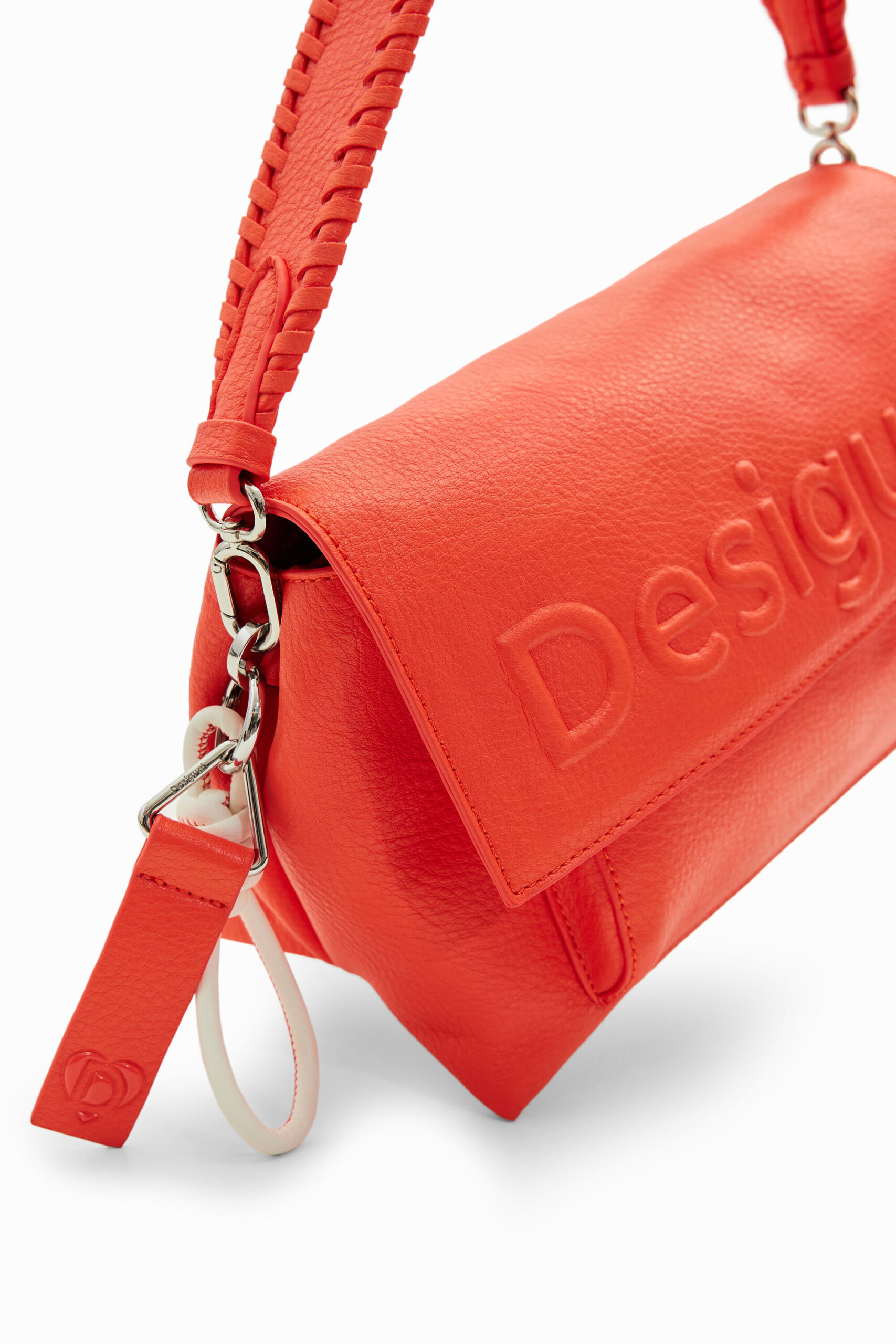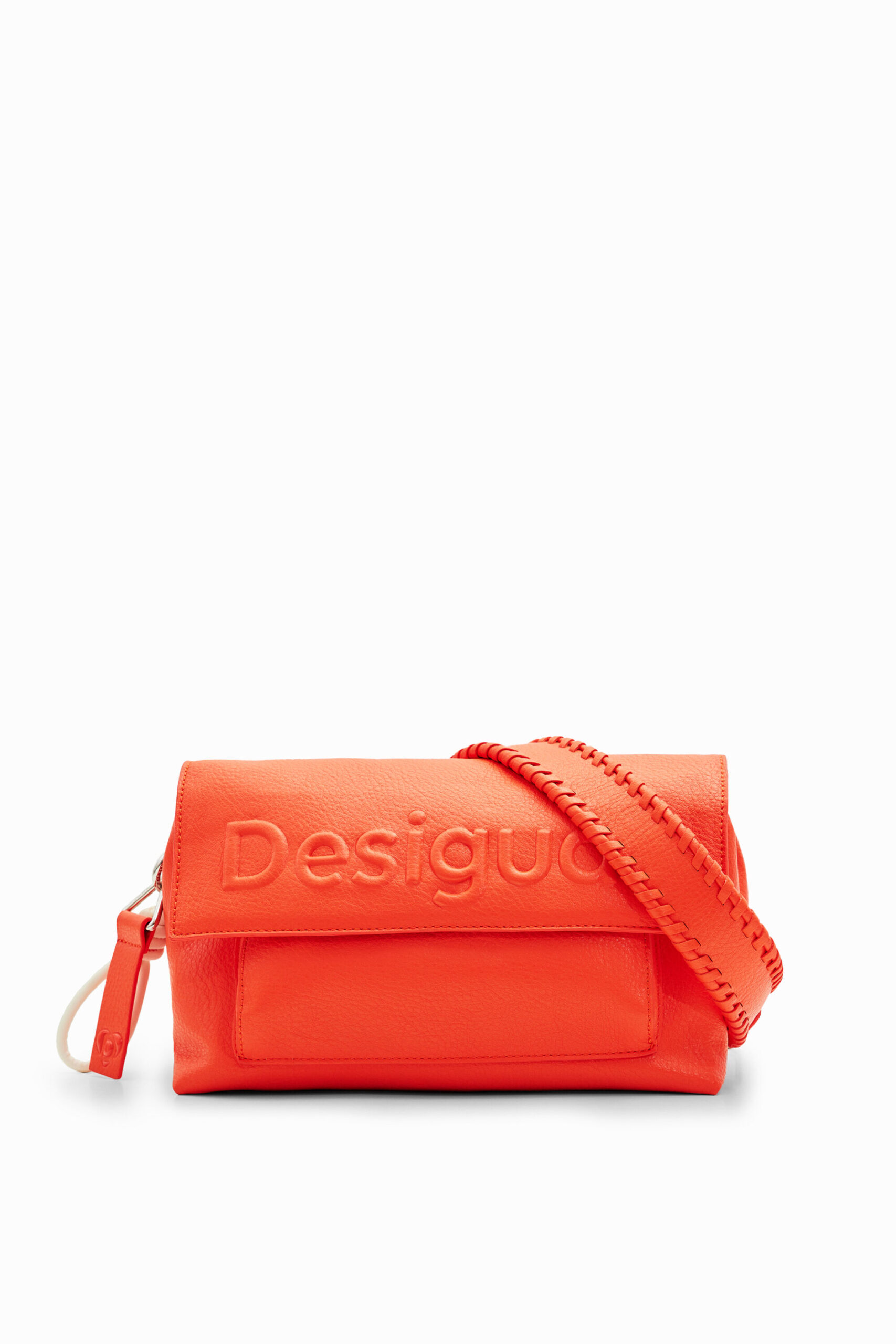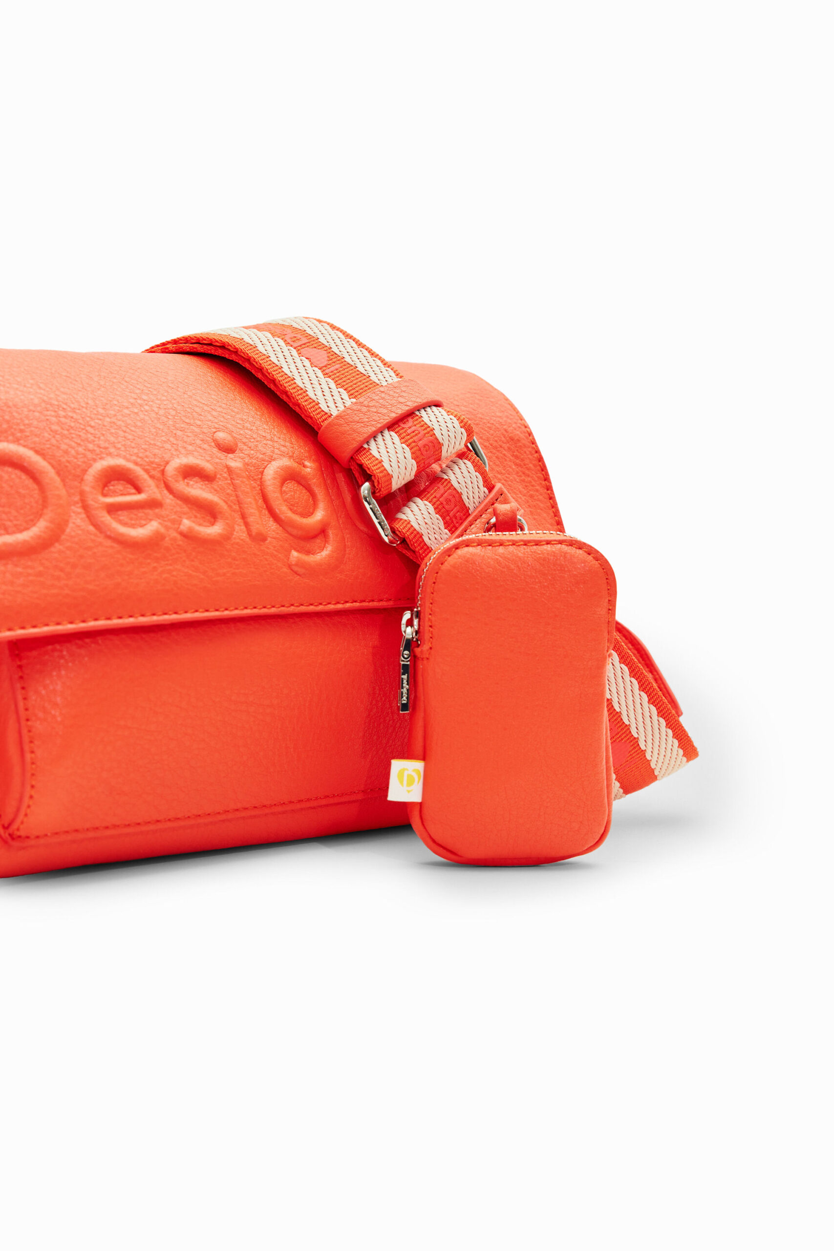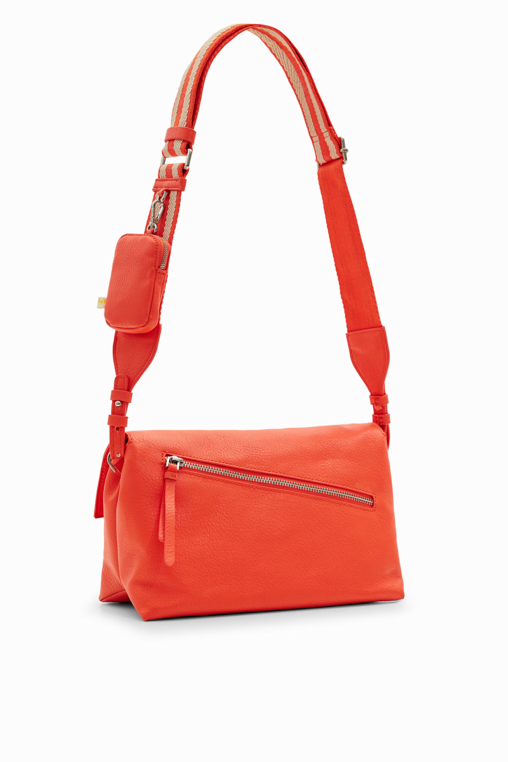 中型斜挎包,采用纯色皮革效果面料制成,带有浮雕正面徽标细节、多条背带和口袋。
