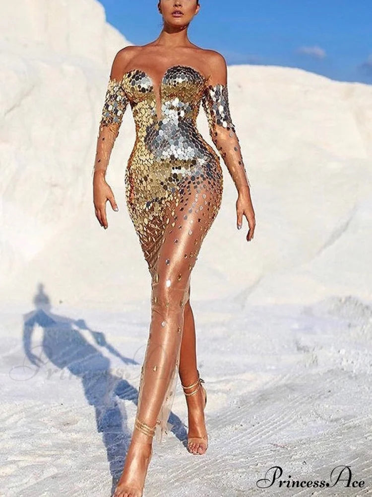Sequin Mesh Off Shoulder Bodycon Maxi Party Dress