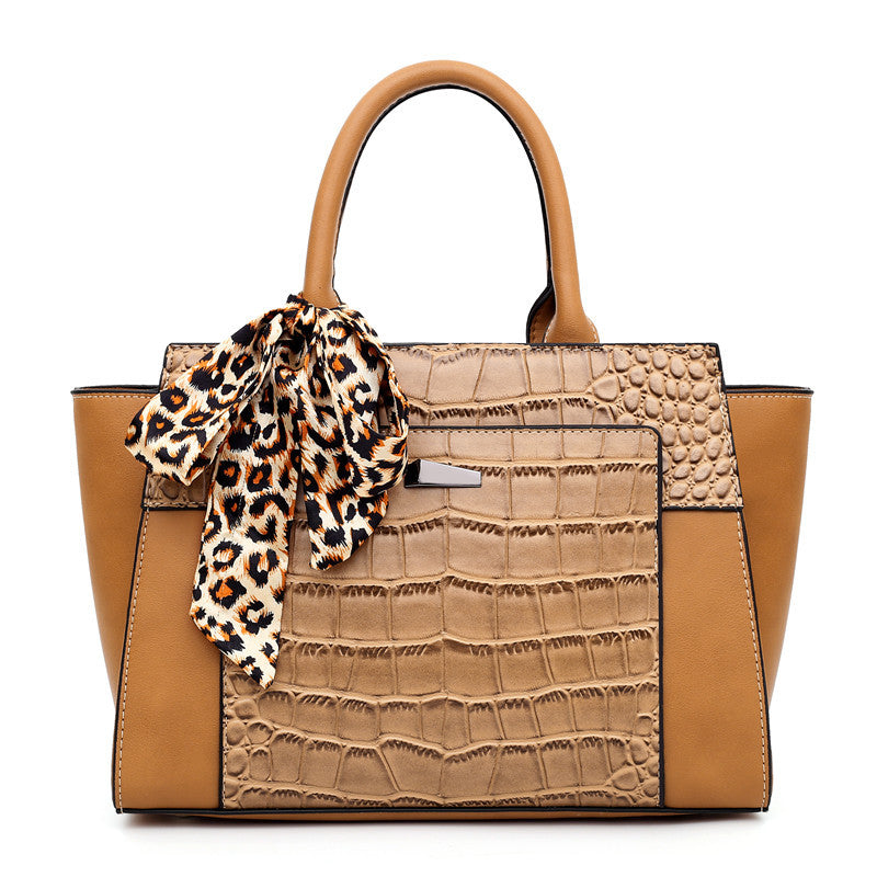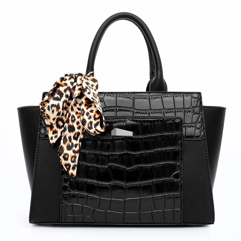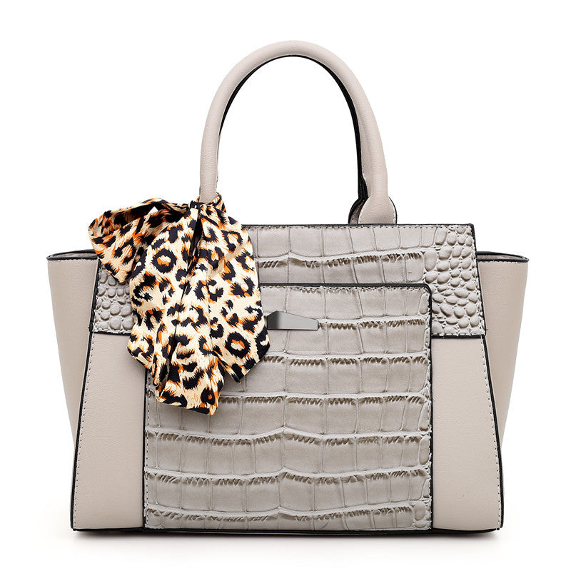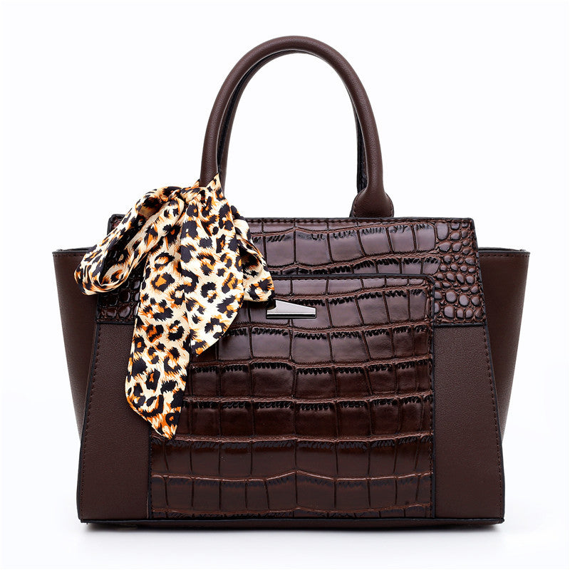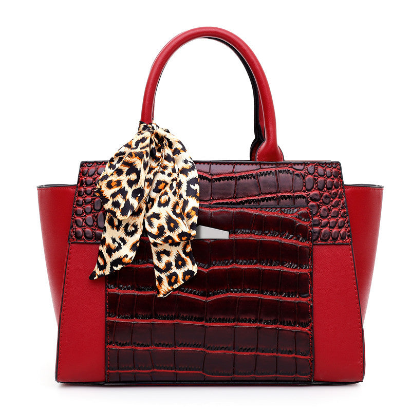 Women’s Crocodile Pattern Hand Shoulder Bag with Tied Leopard Silk Scarf