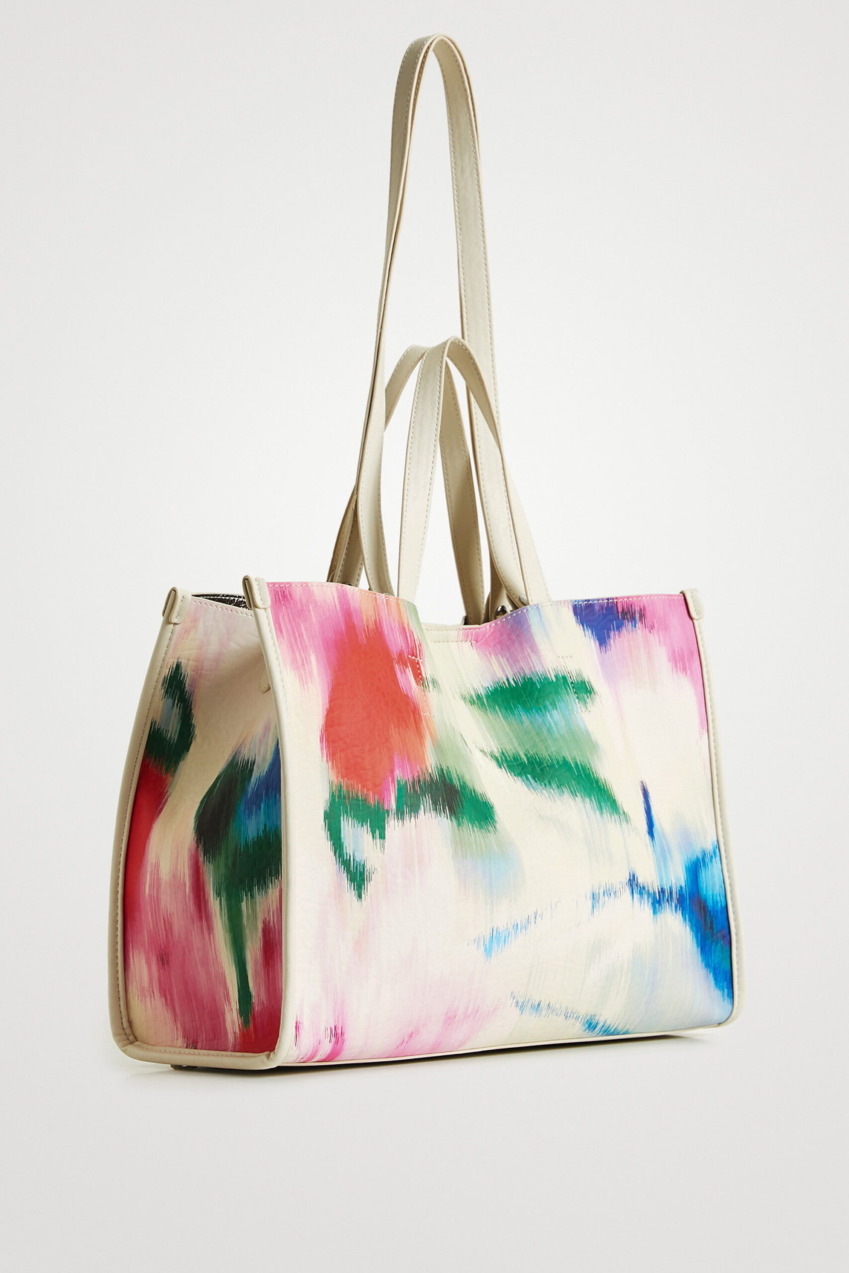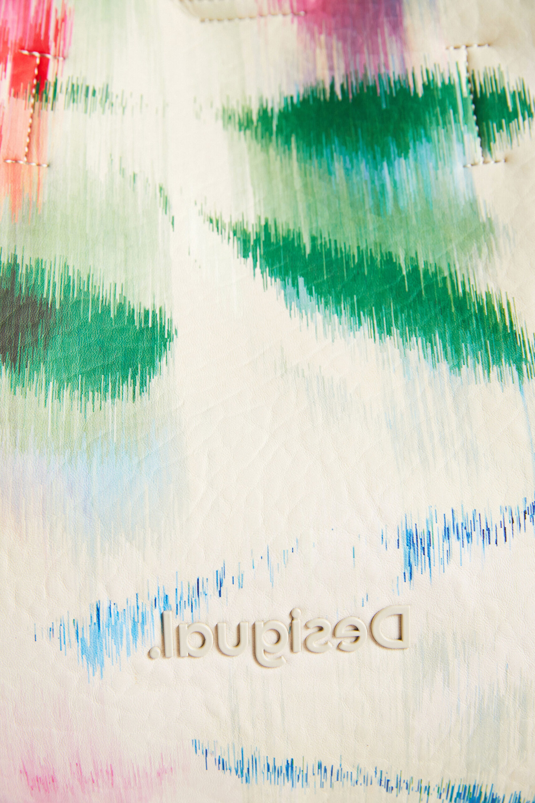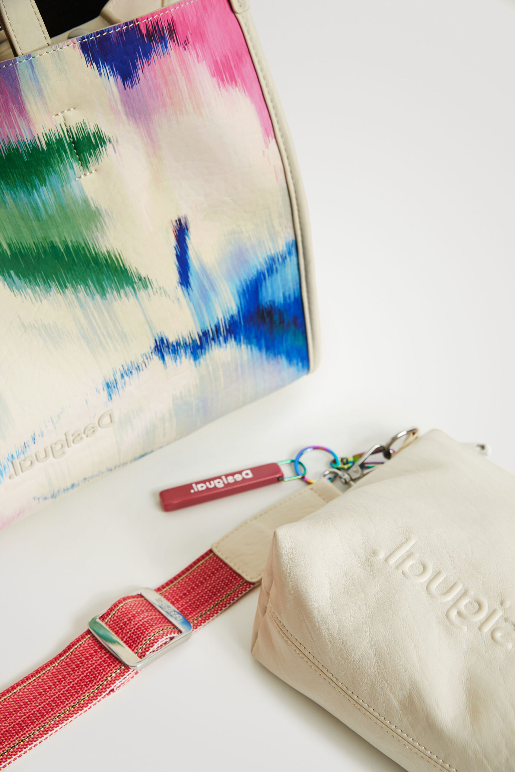 This bag features a unique print with a digital tie-dye effect on a white background. The strap and the bottom part are made from faux leather with an embossed logo. Silver interior, includes a toiletry bag and multiple straps so it can be worn in many ways.