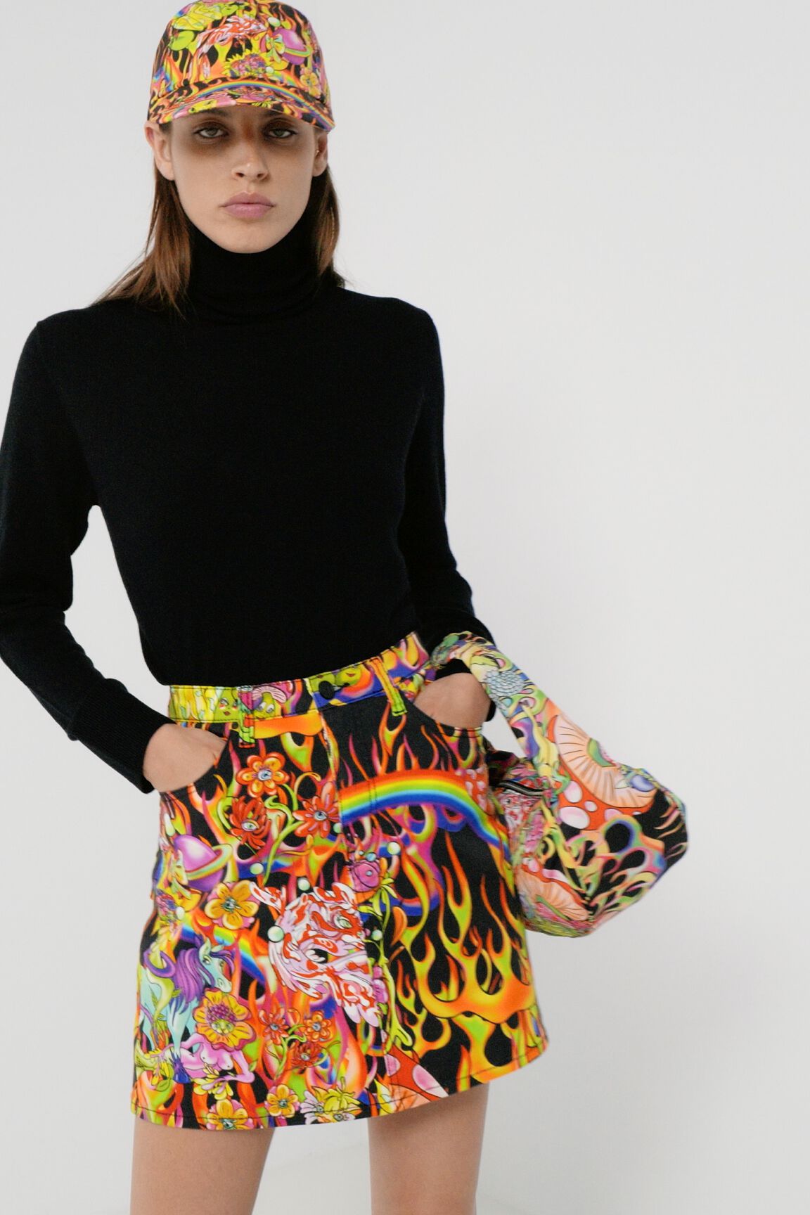 - Arty flame print with characters and surreal motifs