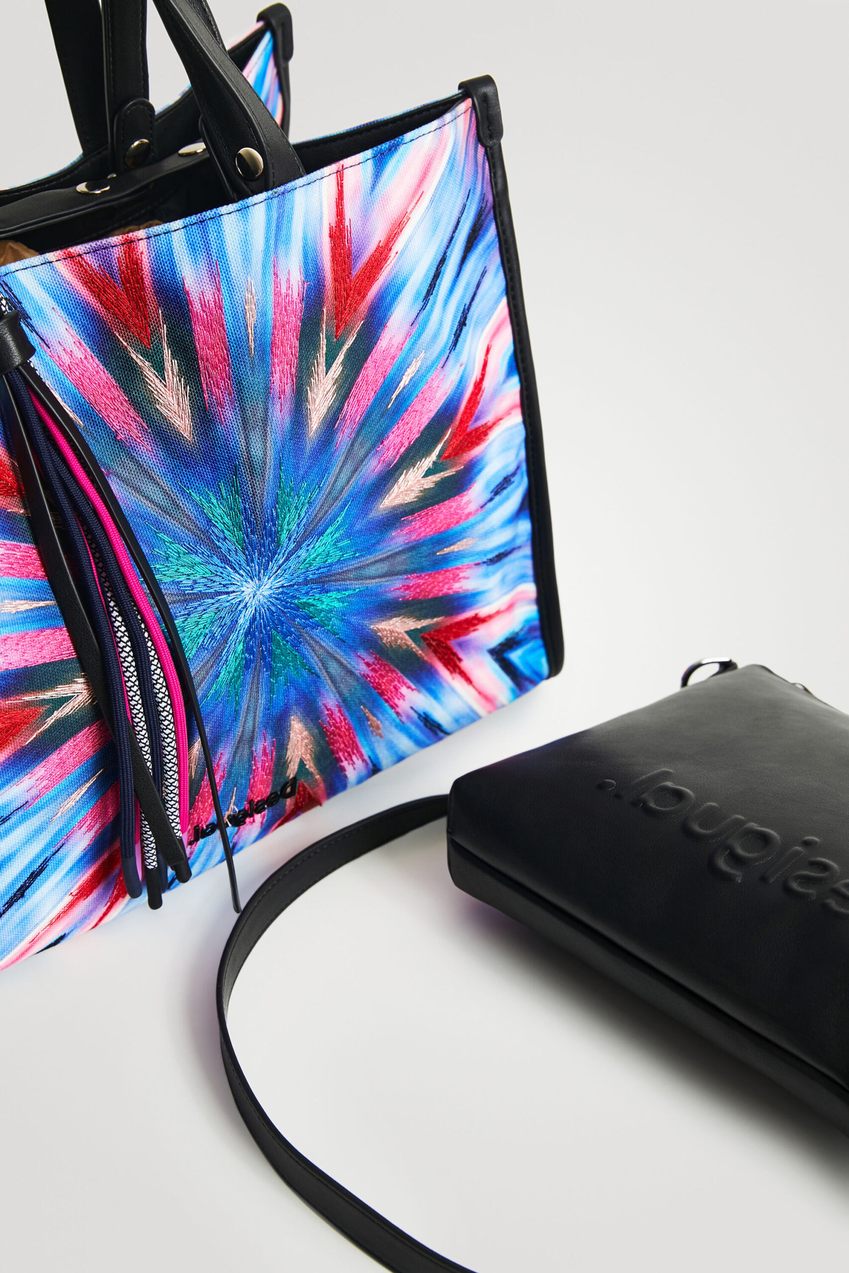 The unique print in blue and pink tones creates a kaleidoscope and is embossed with an embroidery in the same tones. The strap and the bottom part is made from faux leather and features an embossed message from the collection. Comes with a charm and multiple straps for wearing in many different ways.