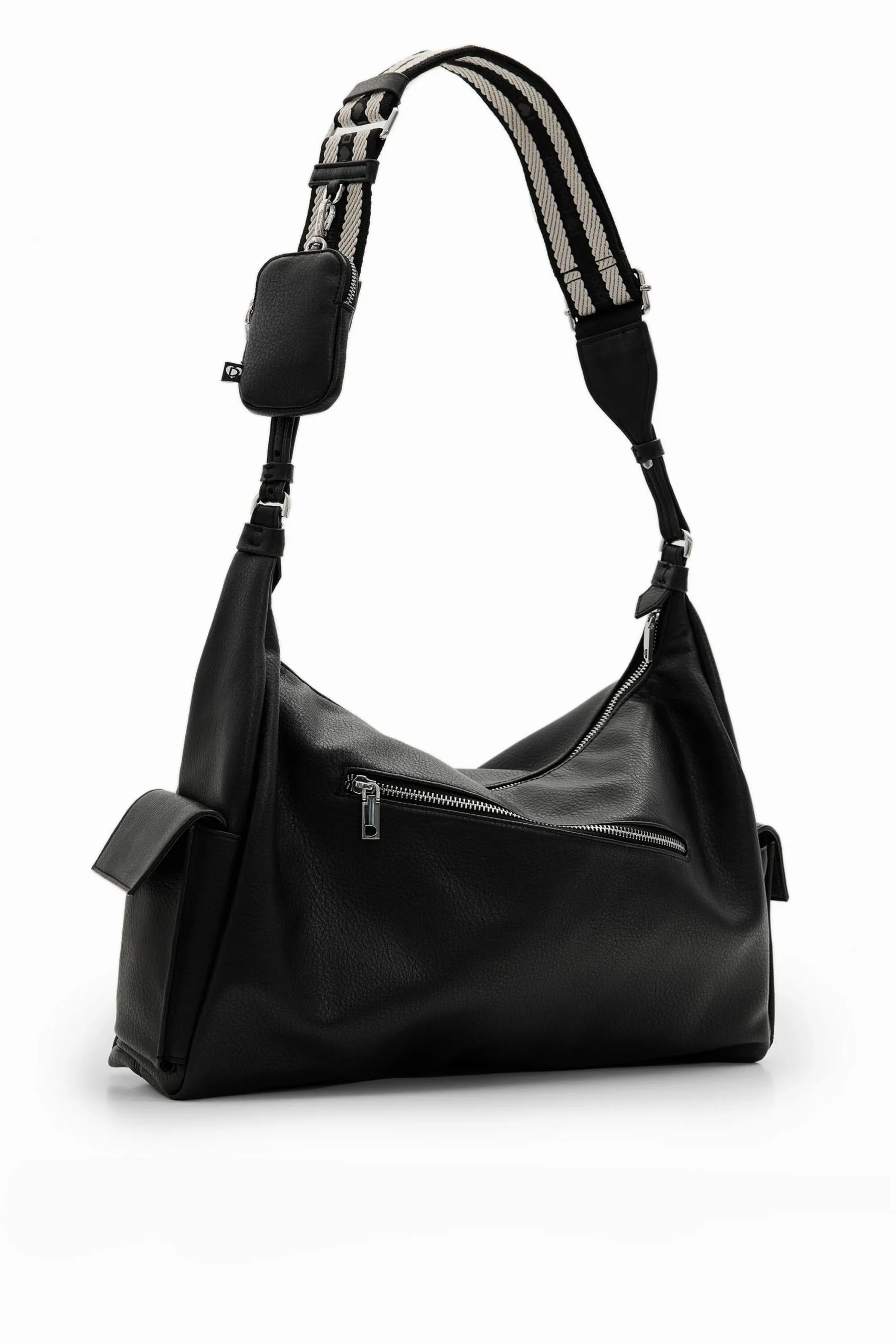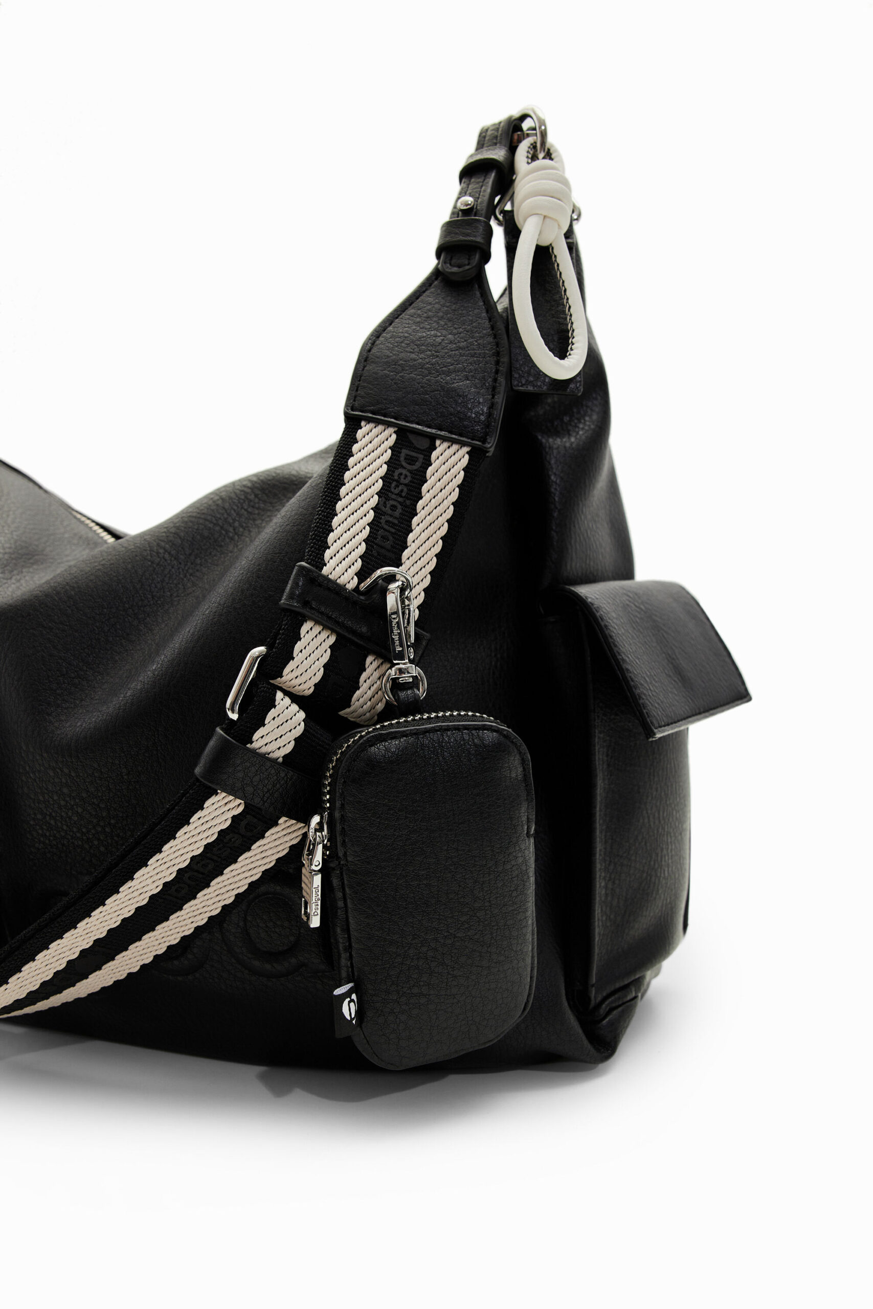 - Two detachable straps: a short leather-effect shoulder strap and a long, adjustable, woven crossbody strap