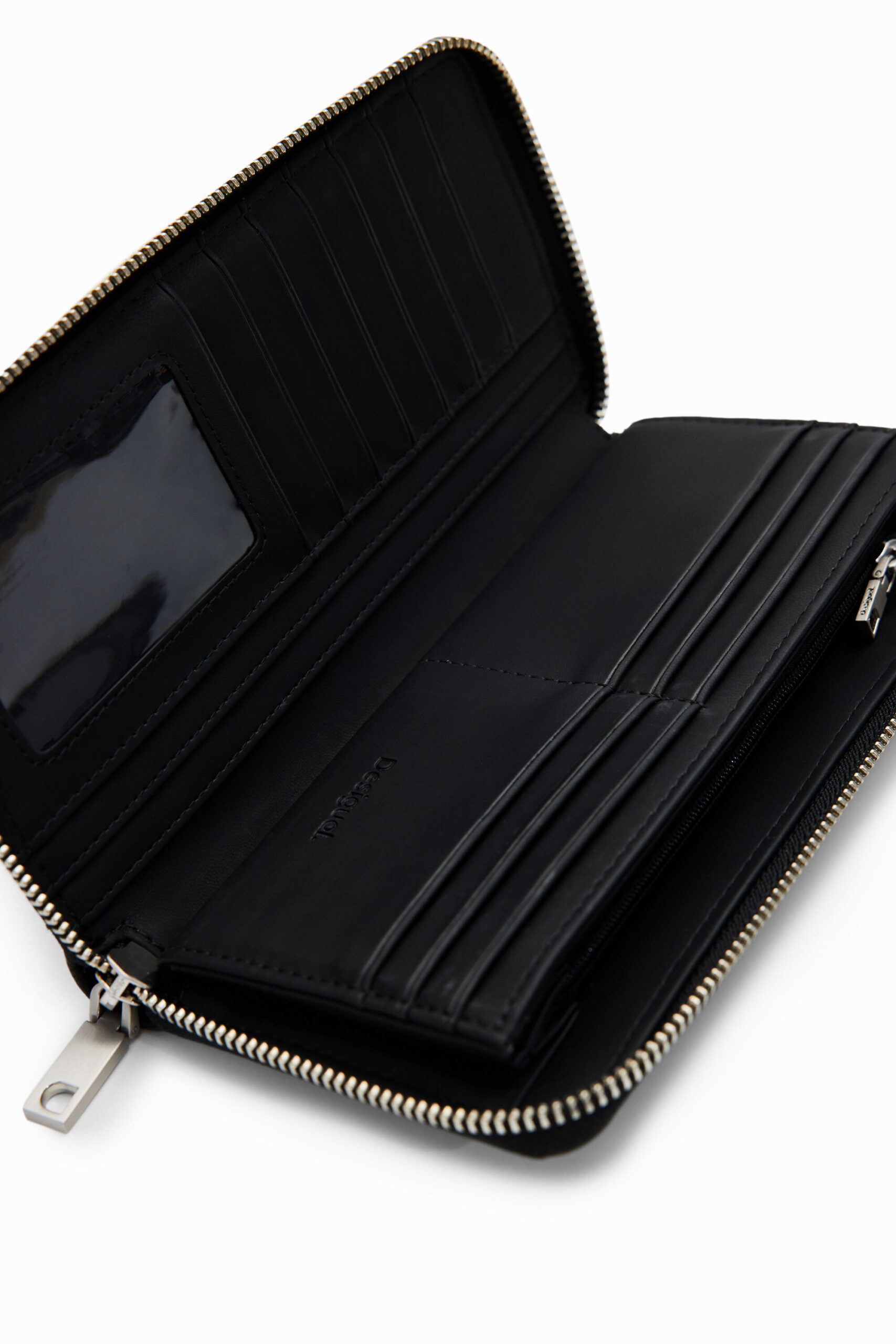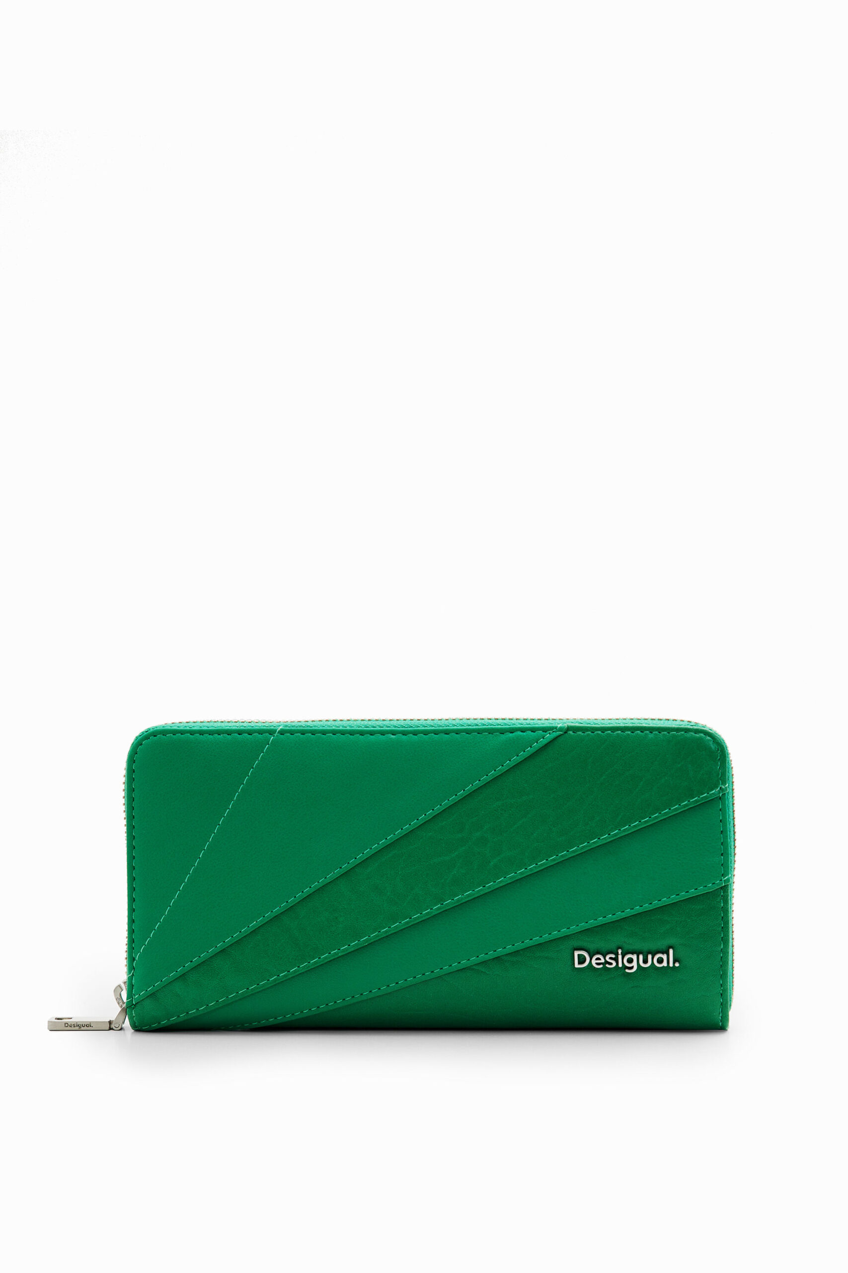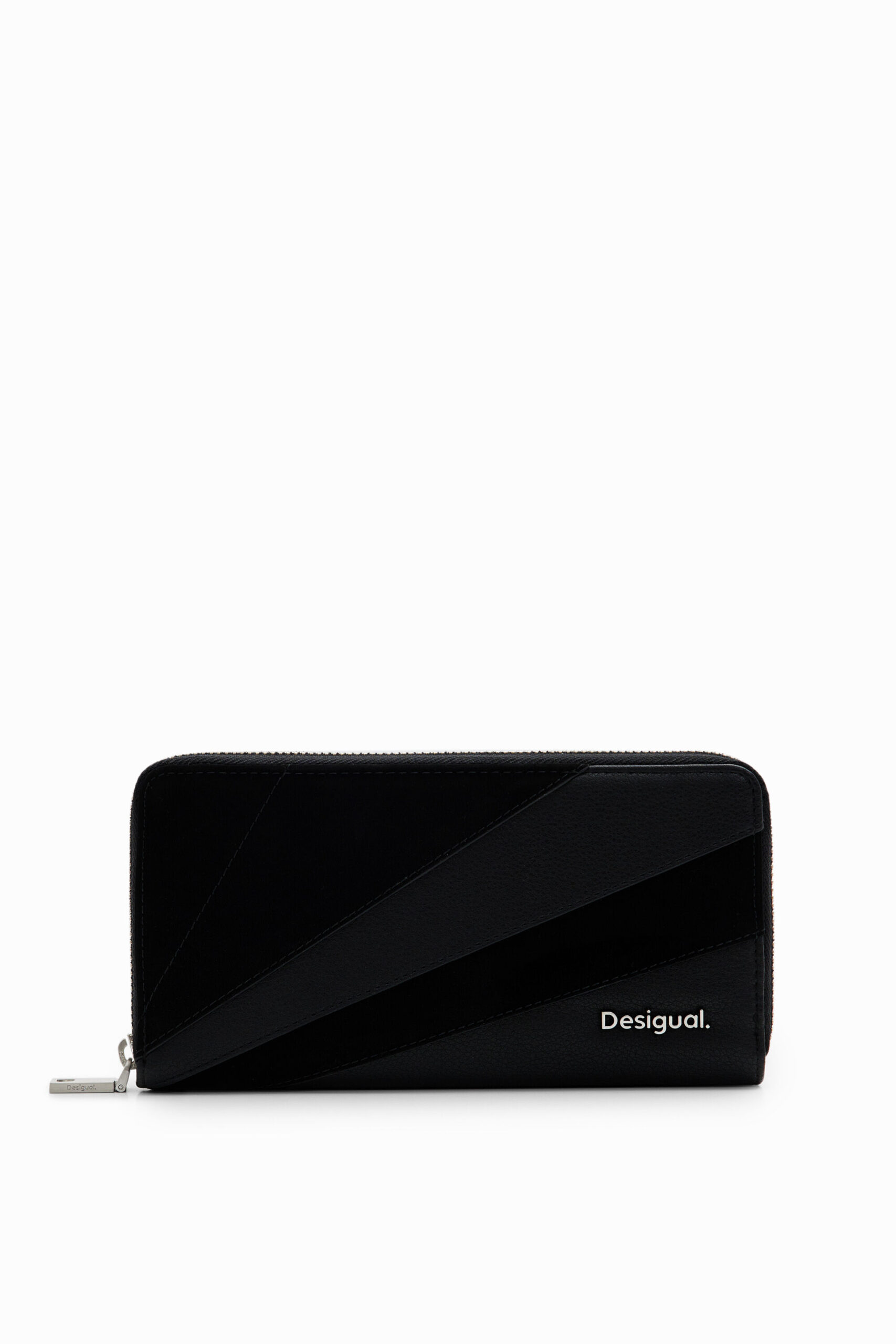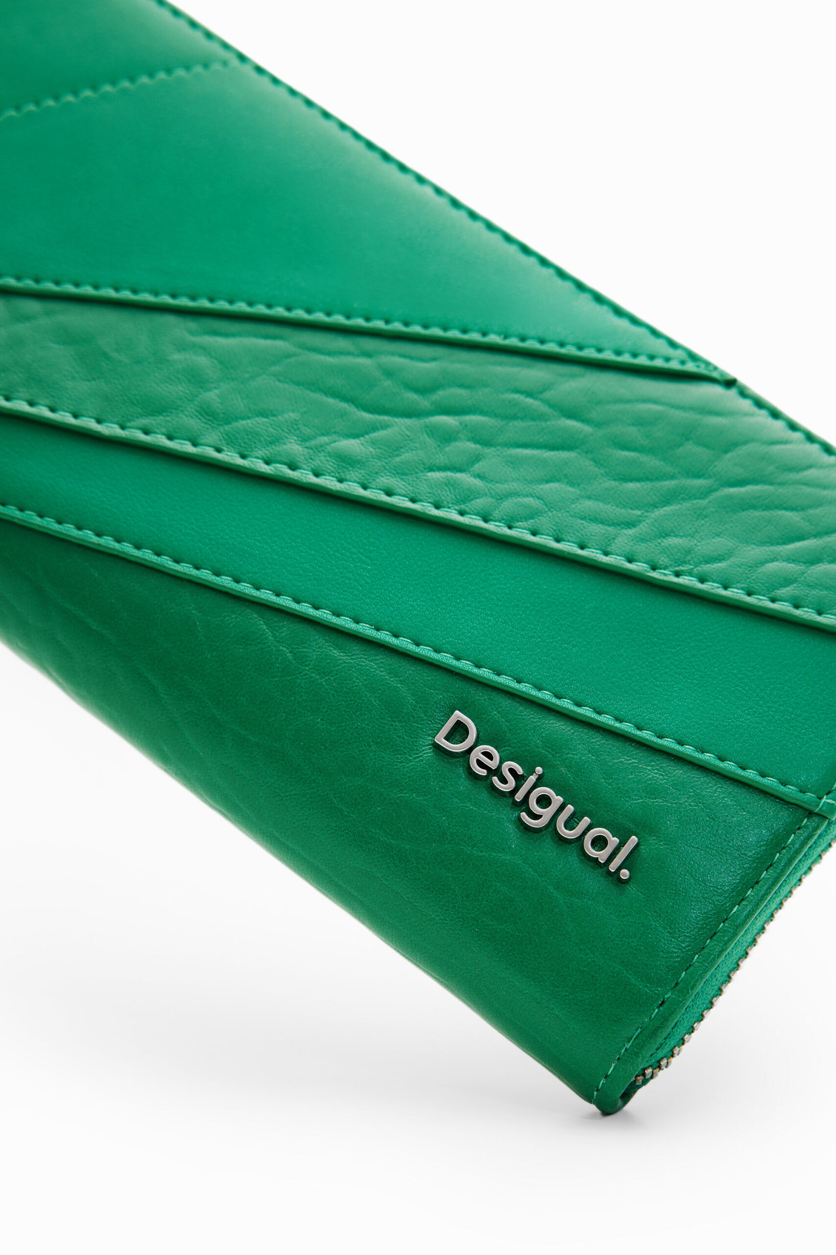 A large rectangular wallet in leather-effect fabric with a patchwork of different textures. Featuring several compartments and pockets.