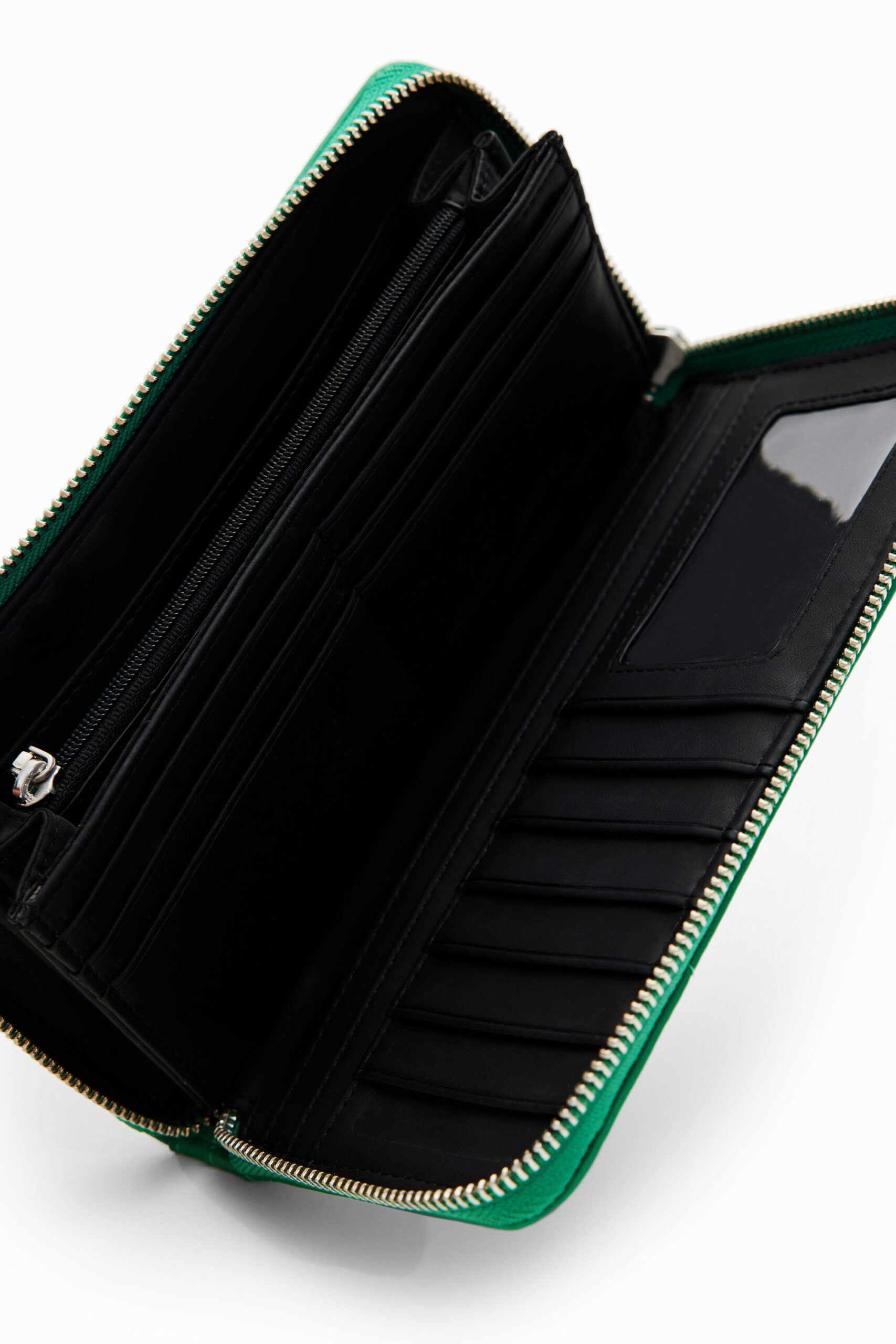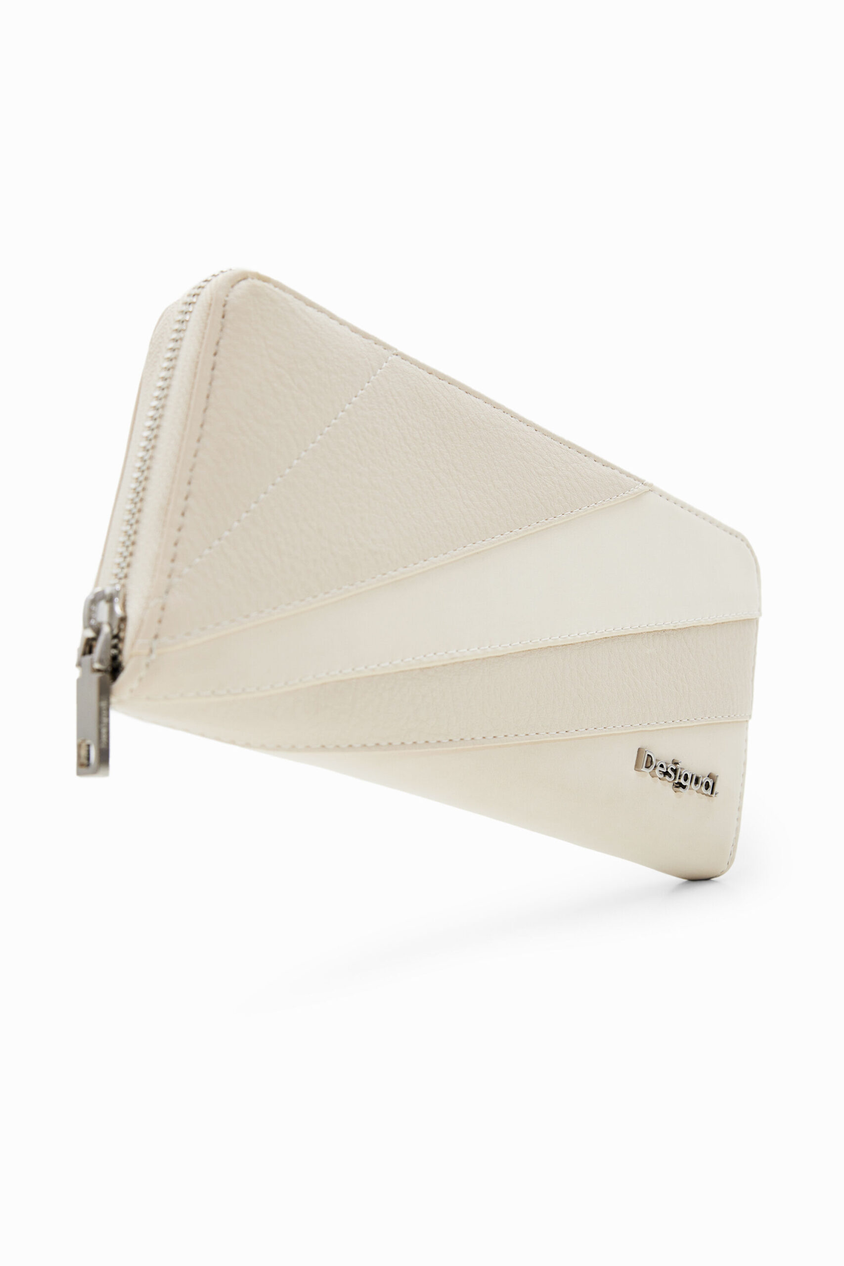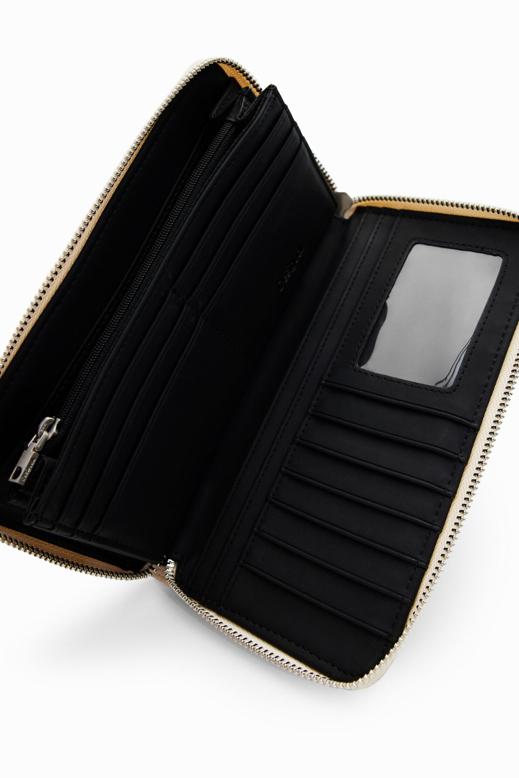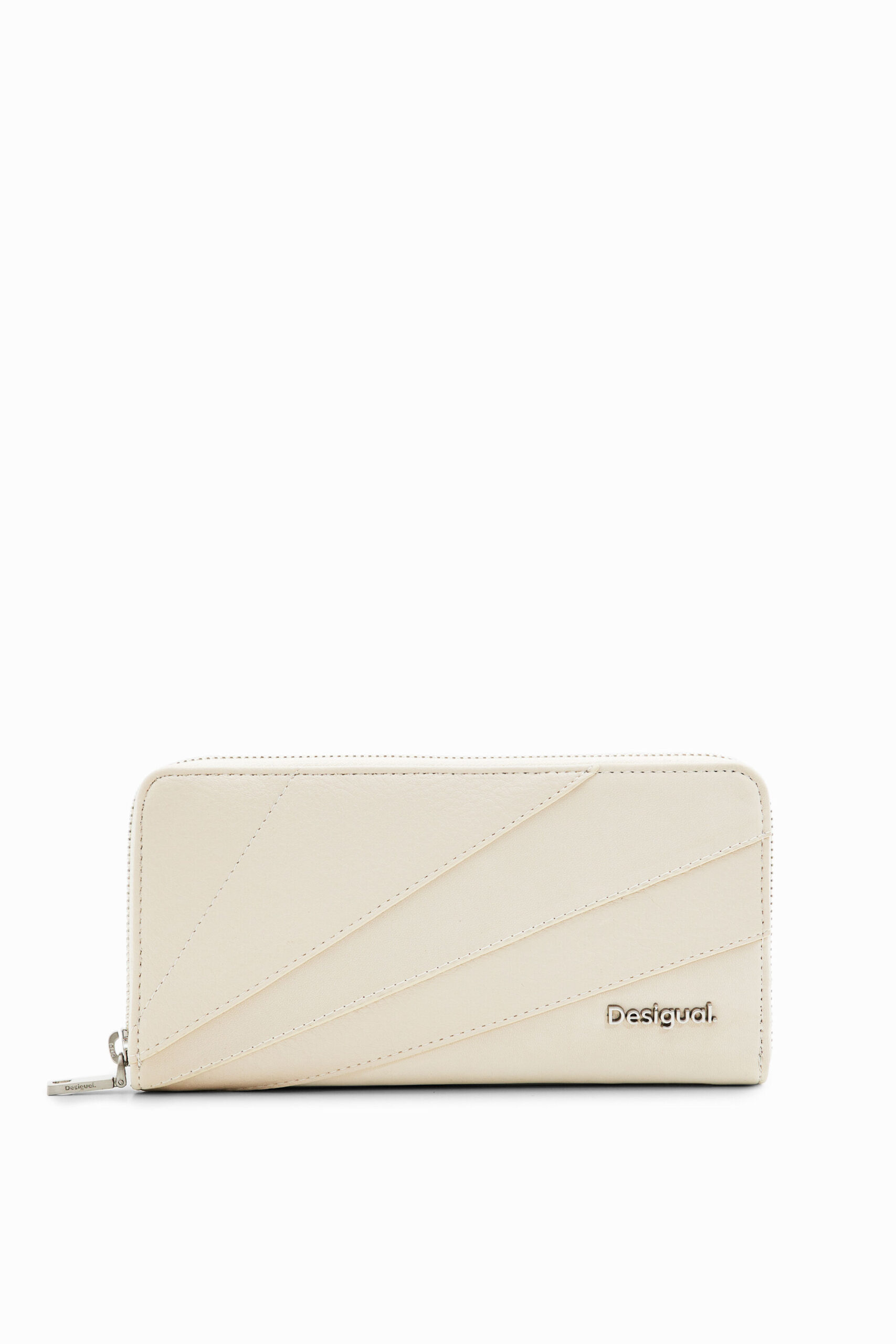 A large rectangular wallet in leather-effect fabric with a patchwork of different textures. Featuring several compartments and pockets.