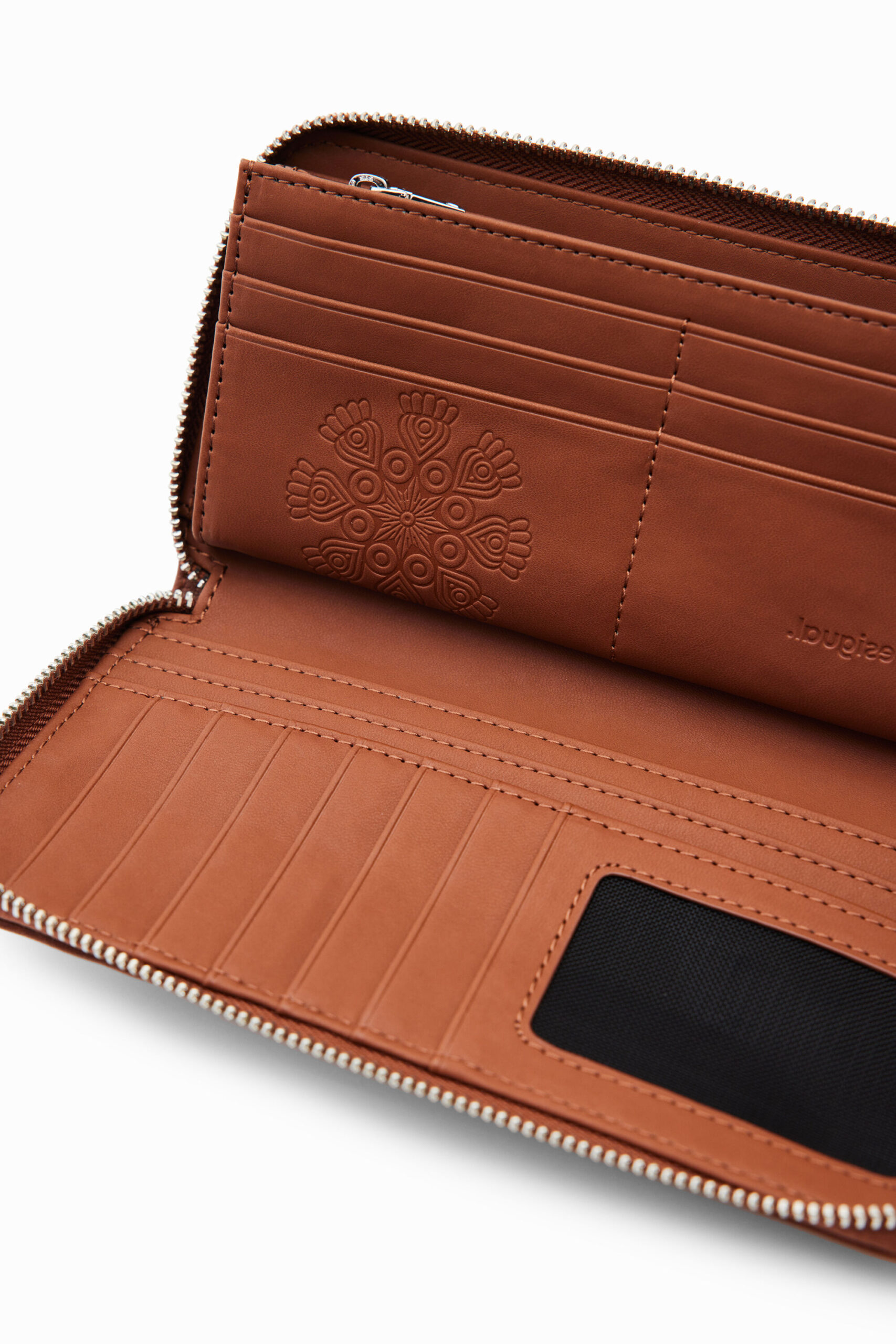 A large rectangular wallet in leather-effect fabric with geometric floral embroidery.