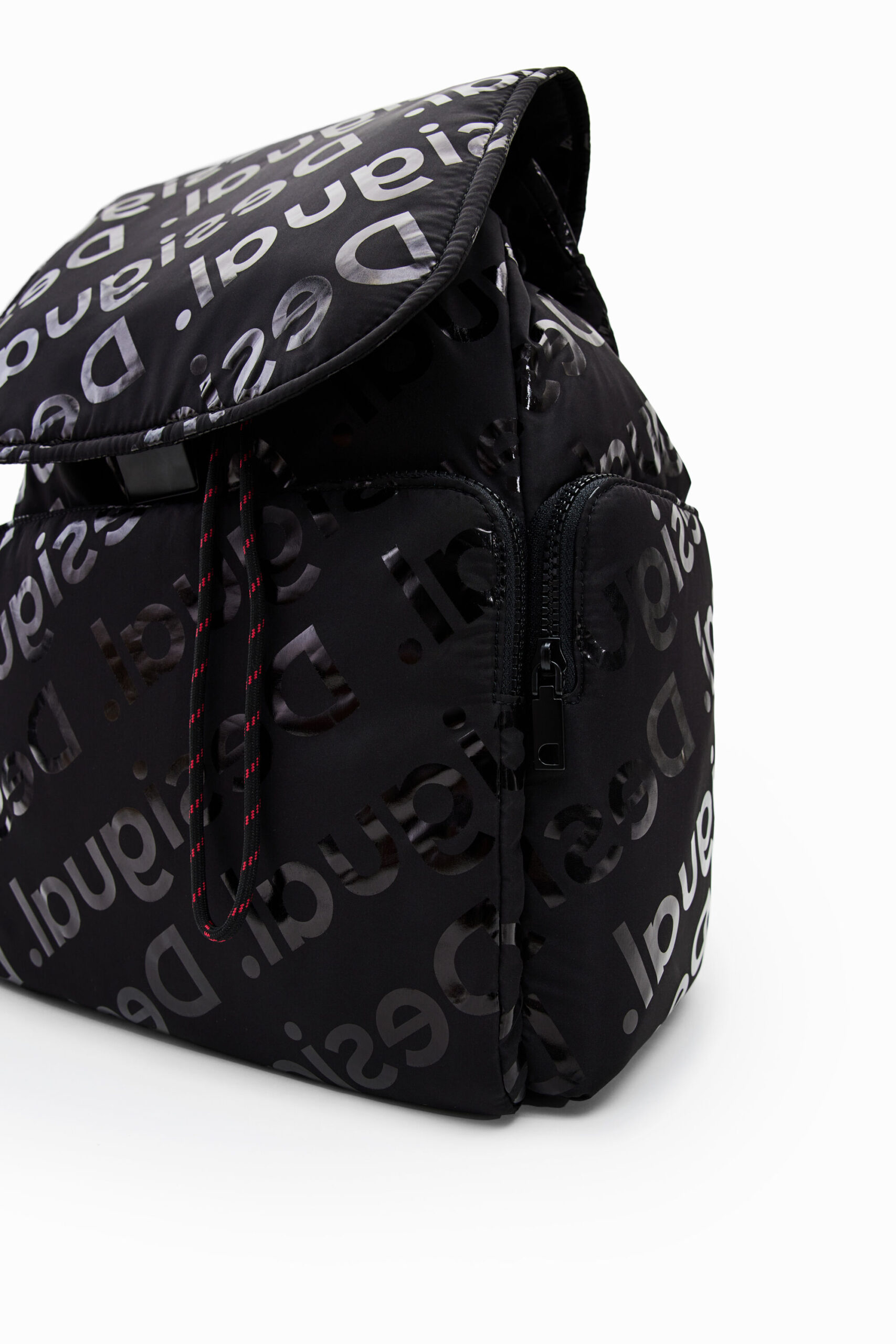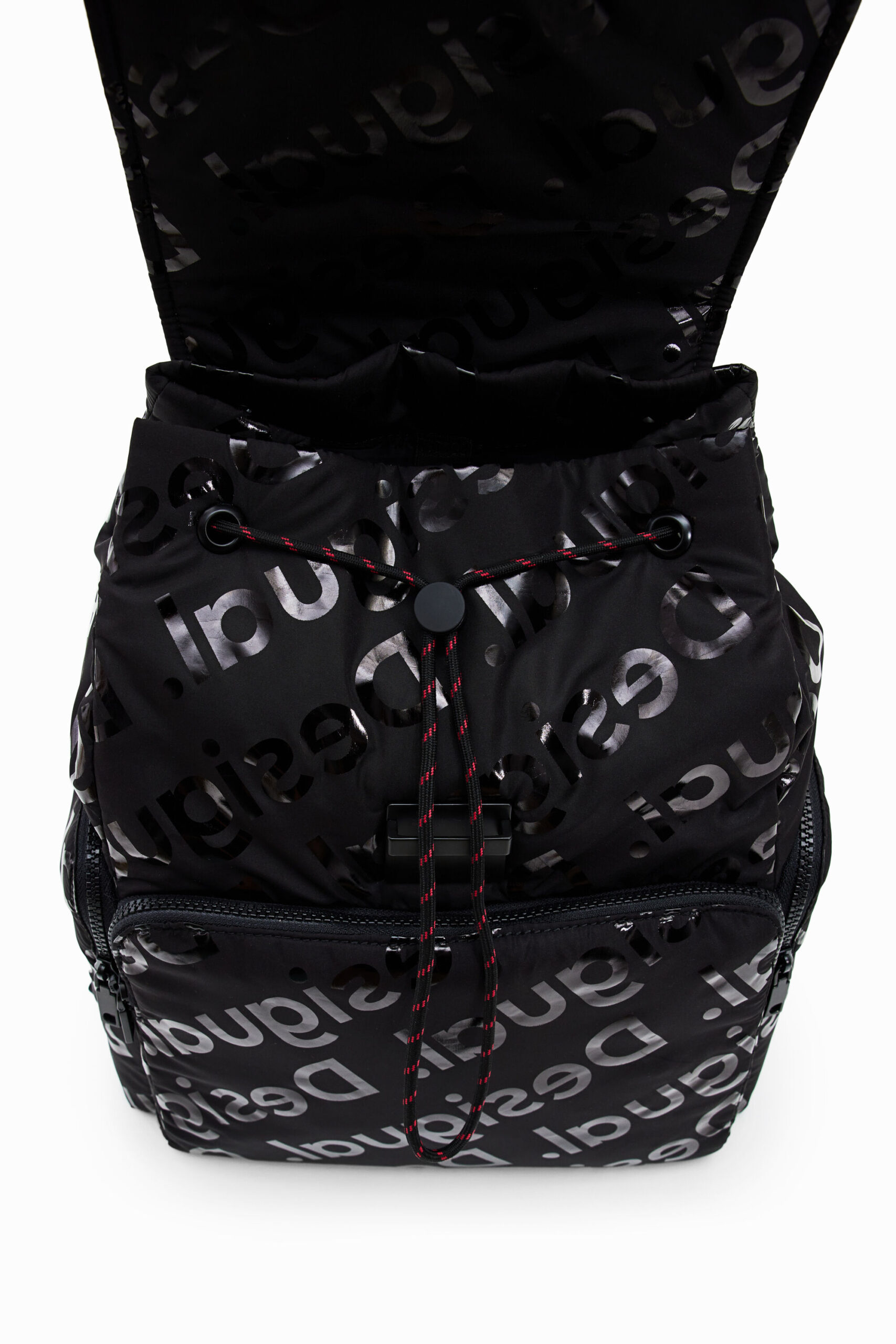 Large backpack with three outside pockets and a spacious interior. Covered in large iridescent logos. Very light and flexible.