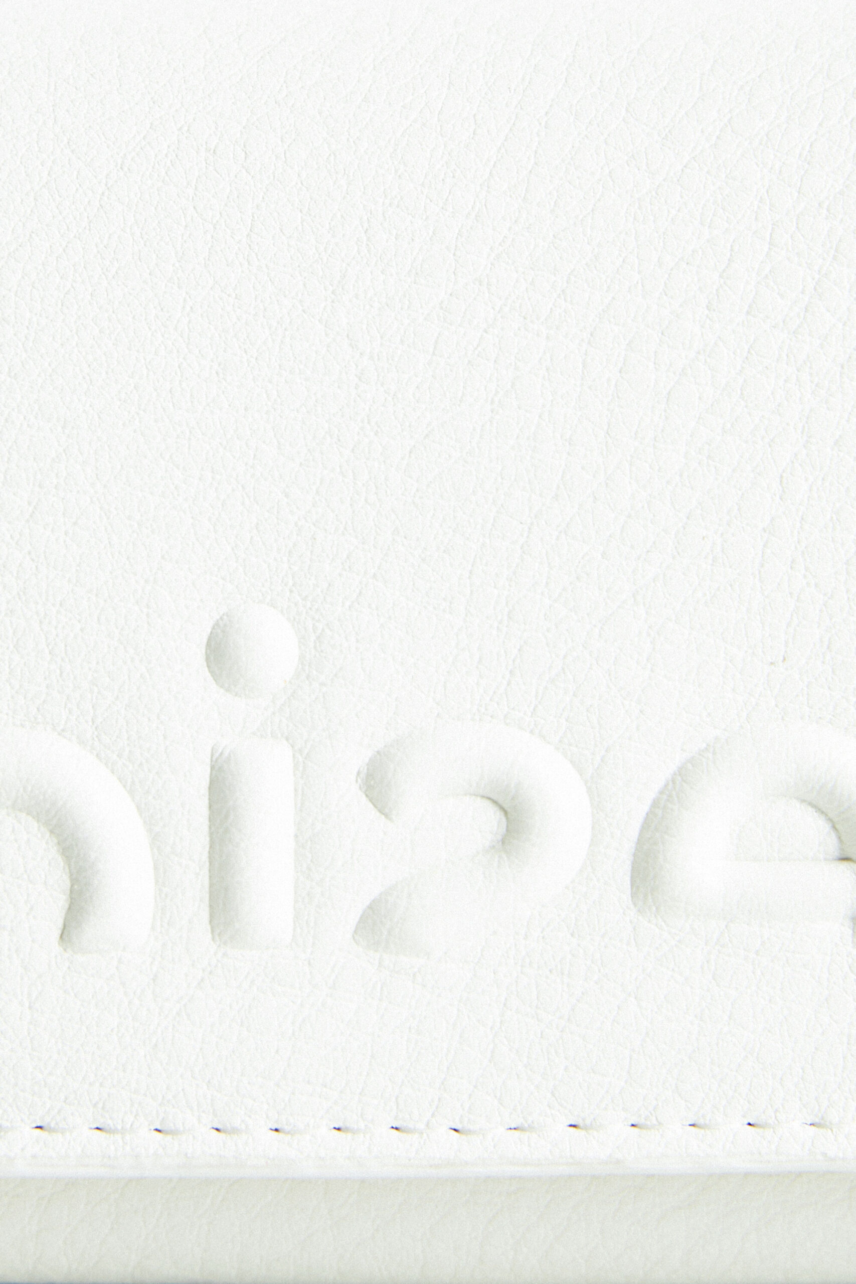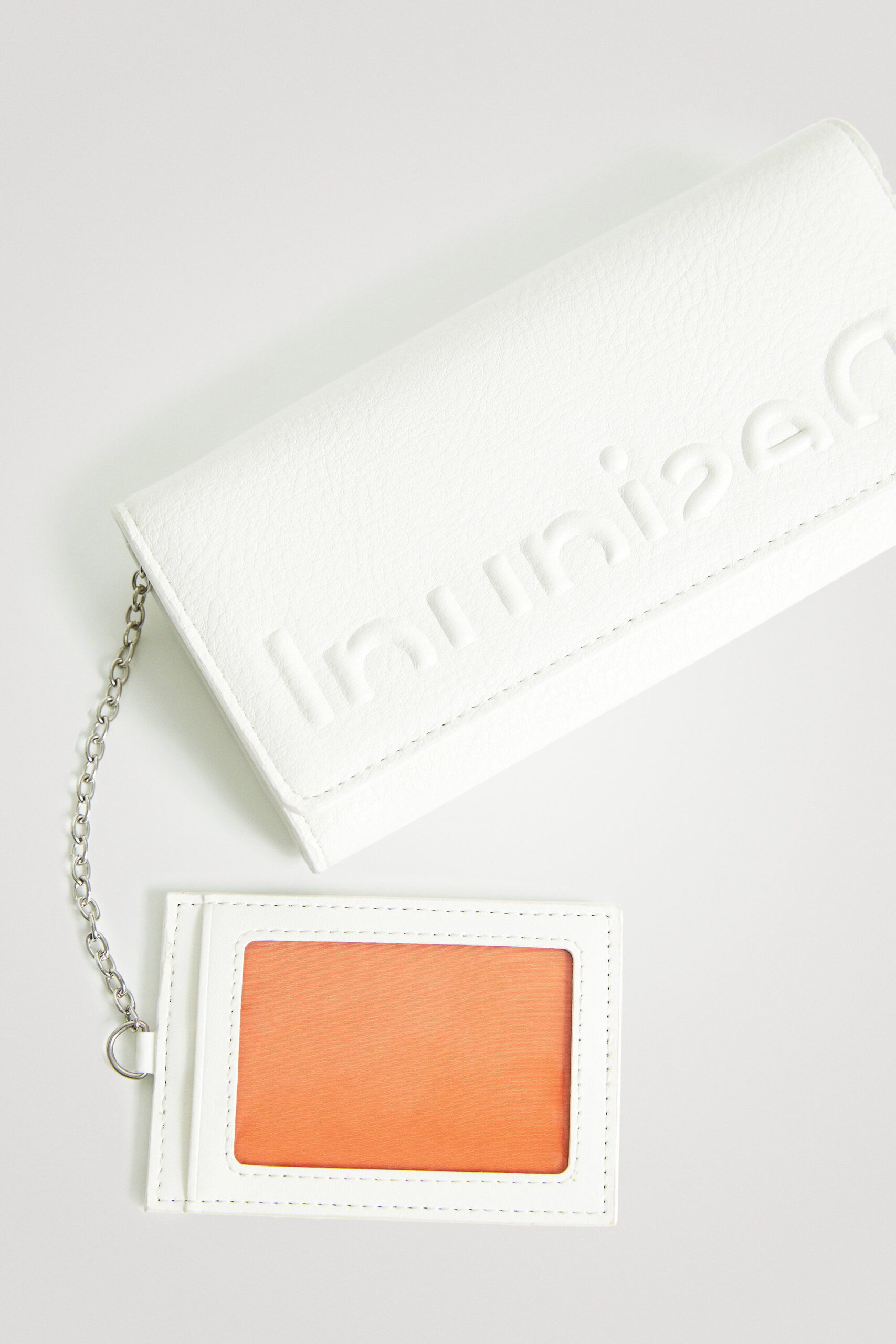 A large Desigual logo with an embossed effect on a very soft white wallet with a flap. Inside divided into compartments for coins, cards and notes.