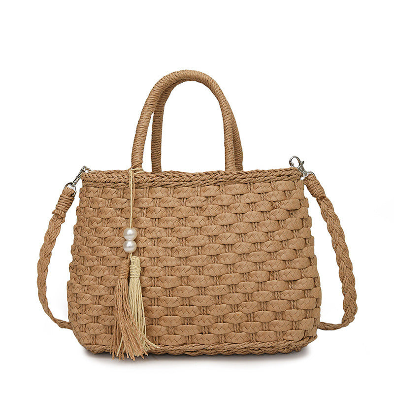 This stylish and chic hand bag is the perfect accessory for any fashion-forward woman. Made with high-quality woven straw material. our hand bag exudes a natural and bohemian vibe. This hand bag features a decorative tassel design. adding a touch of elegance to its overall look. It is available in two classic colors. khaki and milky white. making our women’s hand bag versatile and easy to match with any outfit.